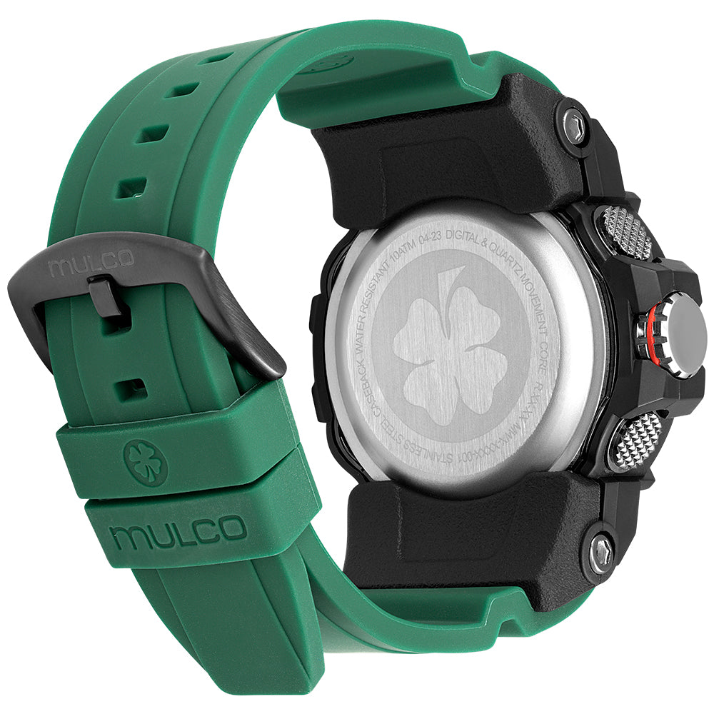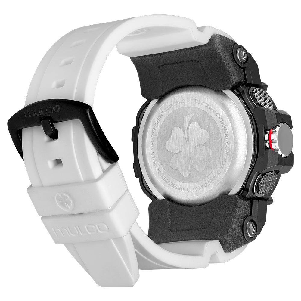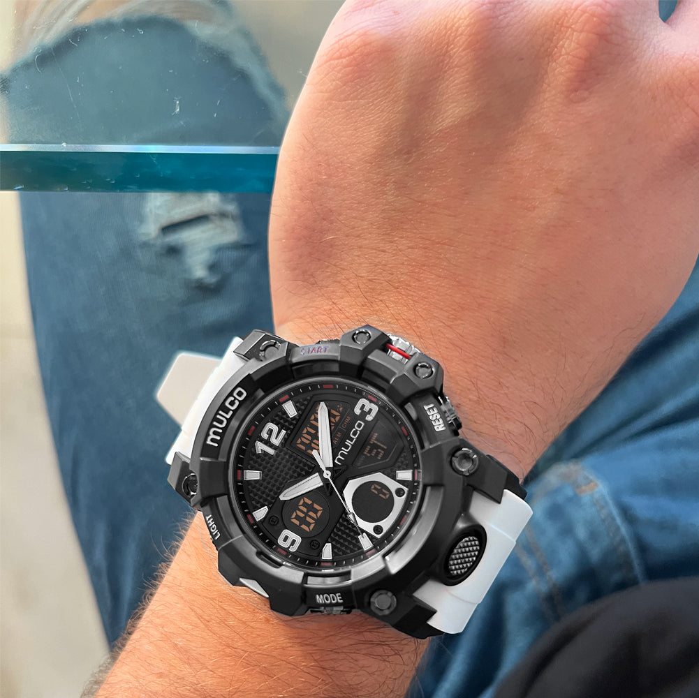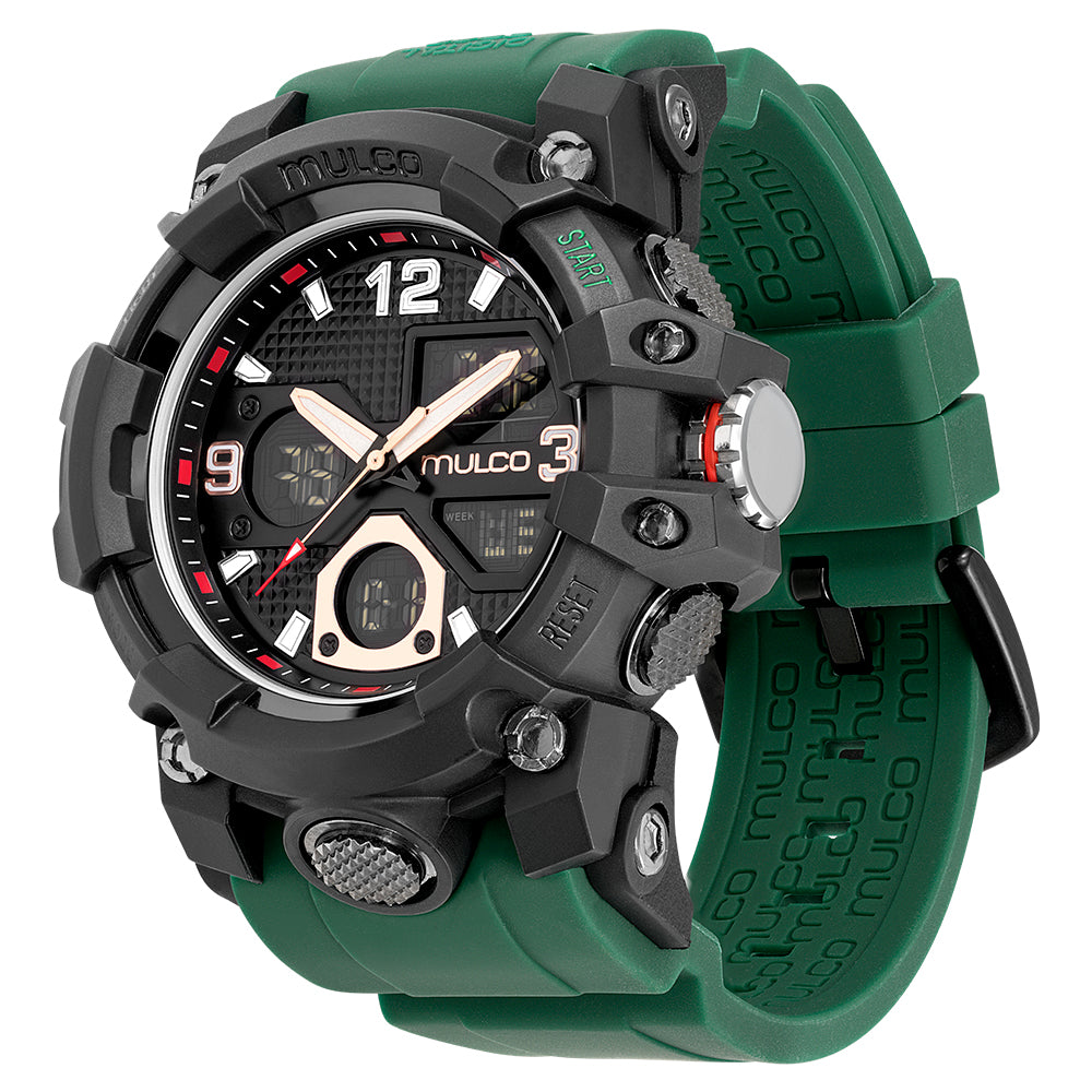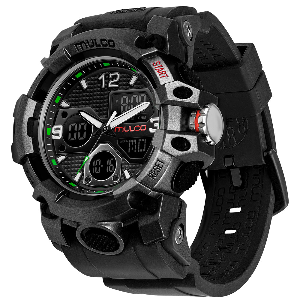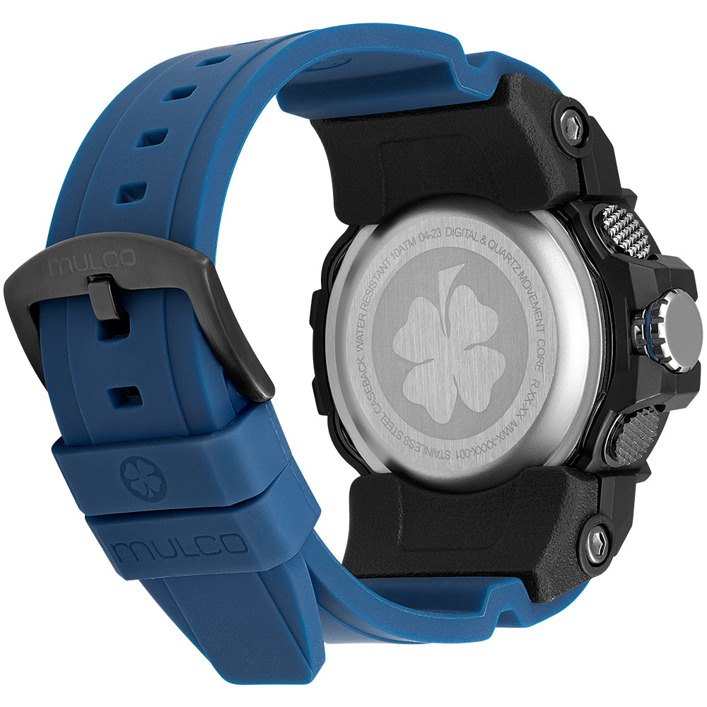 La estructura resistente a los impactos del reloj, con tecnología ABS Resist, está diseñada para un uso intensivo. Ofrece cronometraje preciso en todo el mundo, con pantallas analógicas y digitales. La gama Mulco Core incluye correa 100% de silicona, fibra de carbono, luminiscencia en índices y manos, y un proceso ionizado de 48 horas. Un reloj de hombre que combina lo mejor de la tecnología analógica y digital.