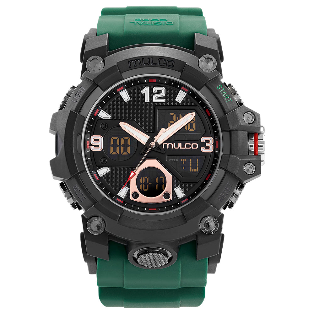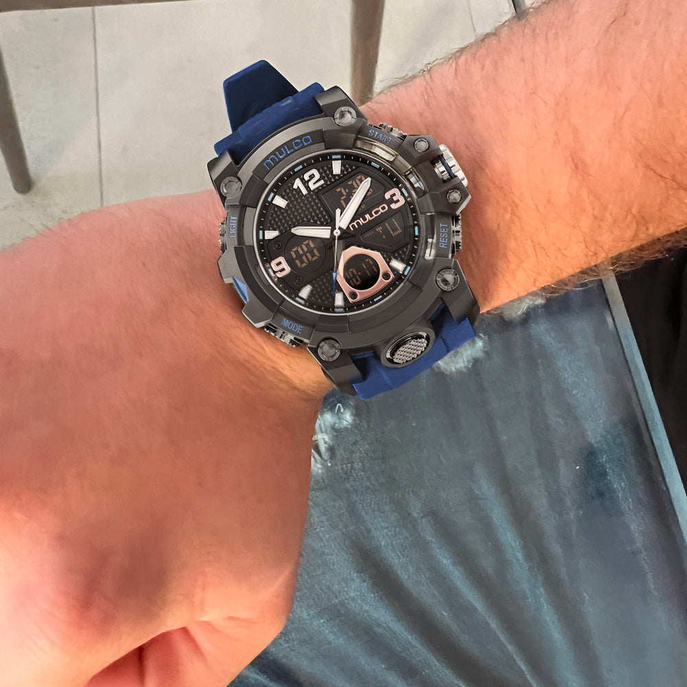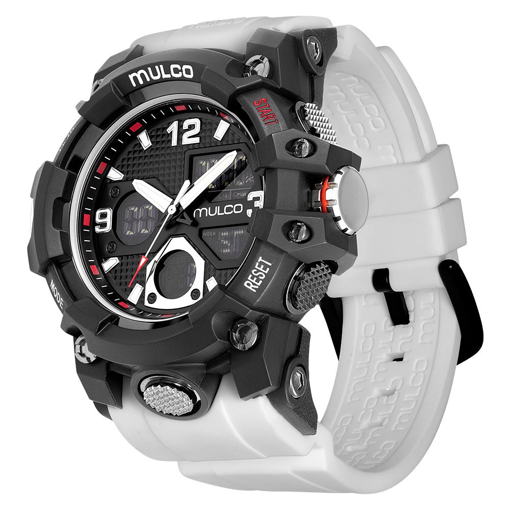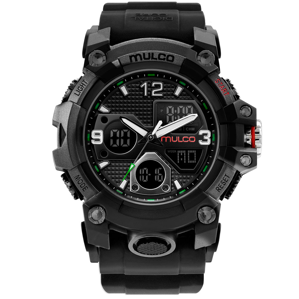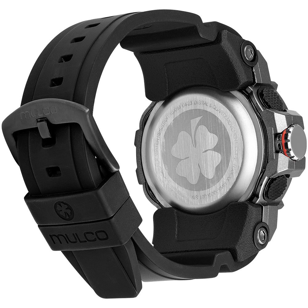 La estructura resistente a los impactos del reloj, con tecnología ABS Resist, está diseñada para un uso intensivo. Ofrece cronometraje preciso en todo el mundo, con pantallas analógicas y digitales. La gama Mulco Core incluye correa 100% de silicona, fibra de carbono, luminiscencia en índices y manos, y un proceso ionizado de 48 horas. Un reloj de hombre que combina lo mejor de la tecnología analógica y digital.