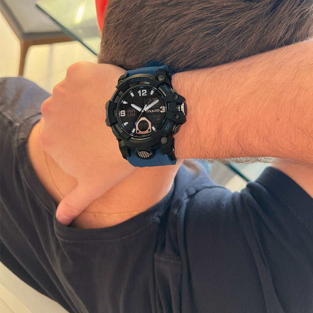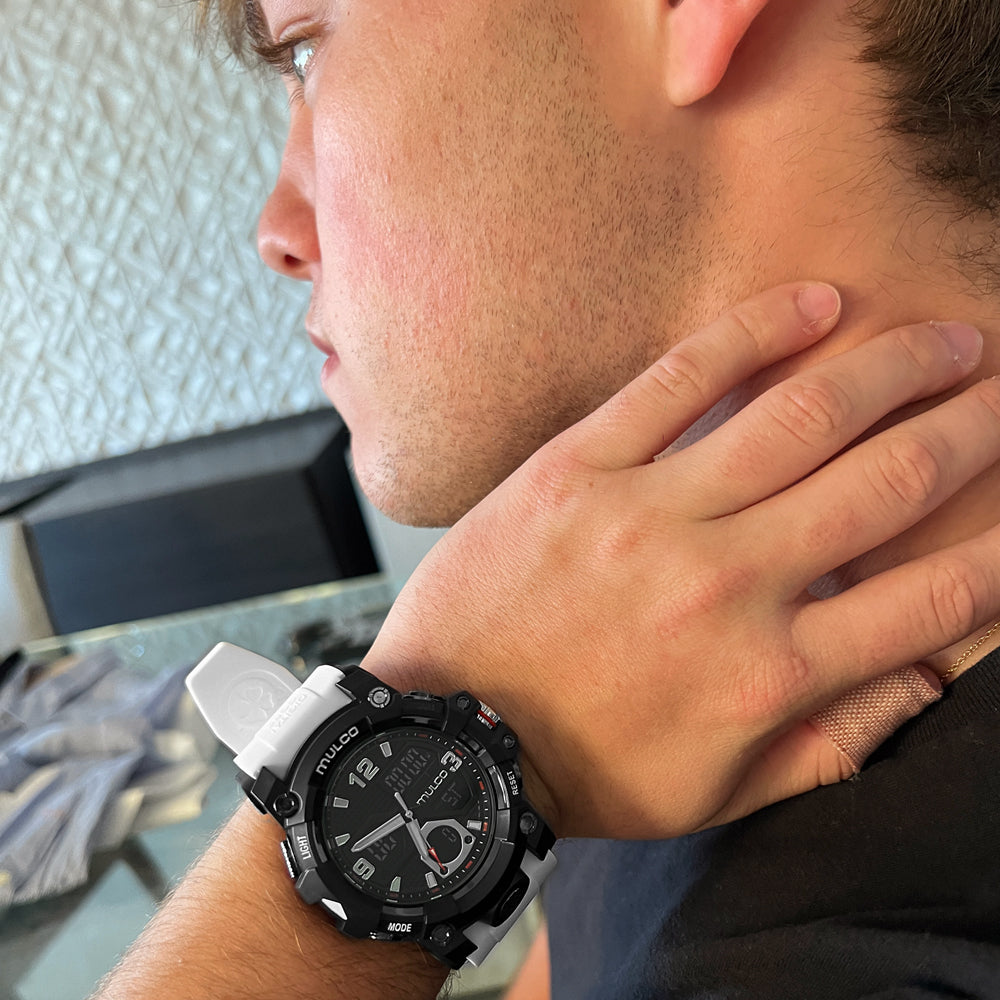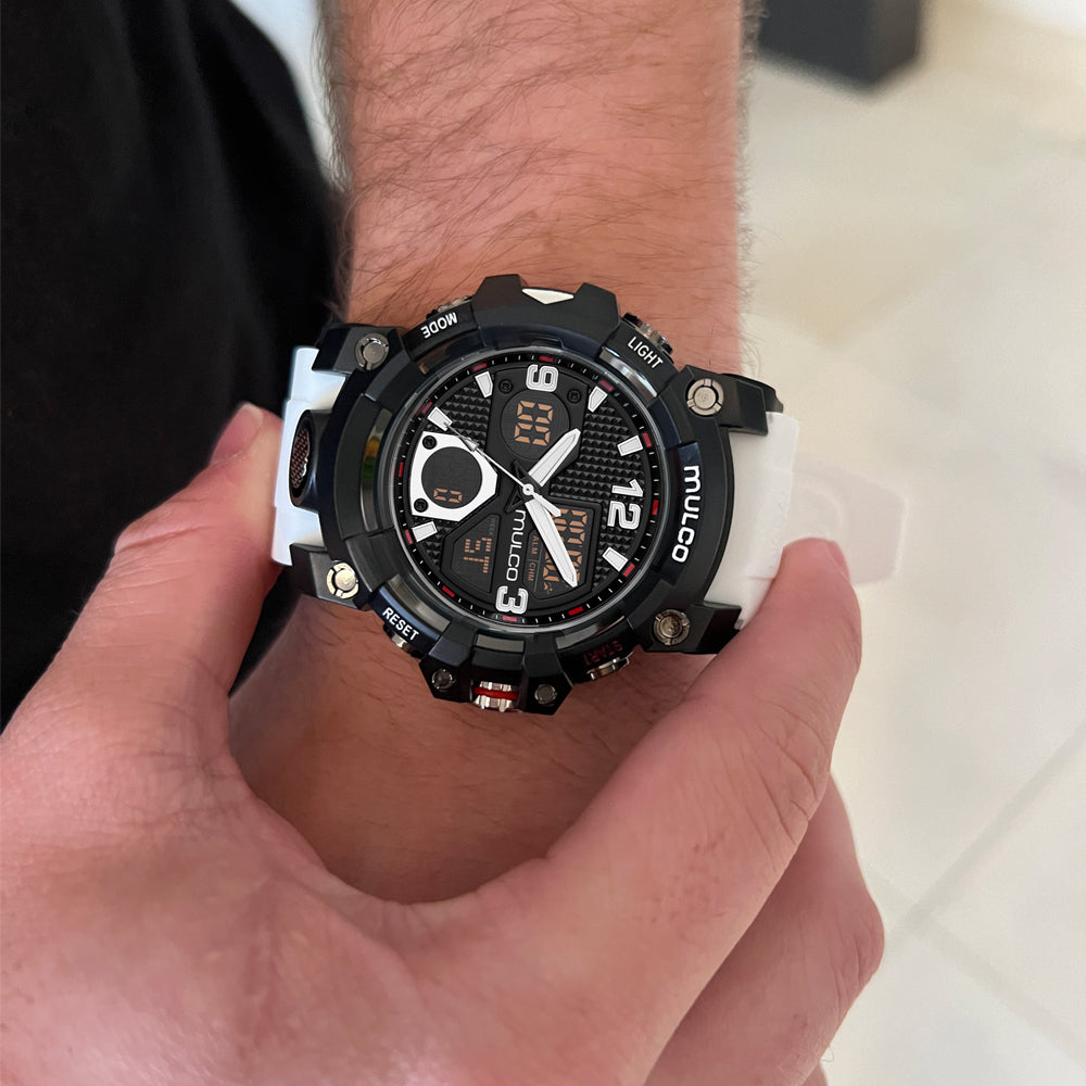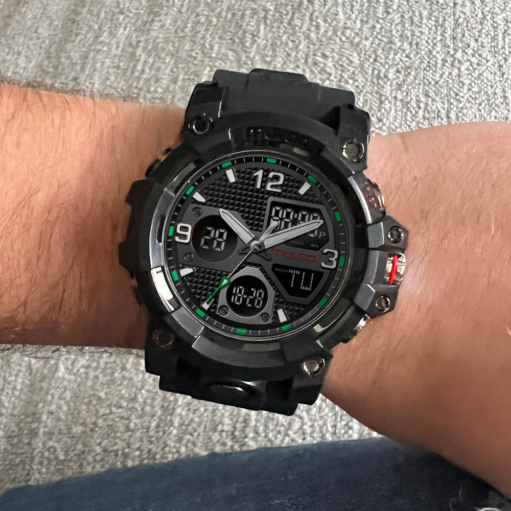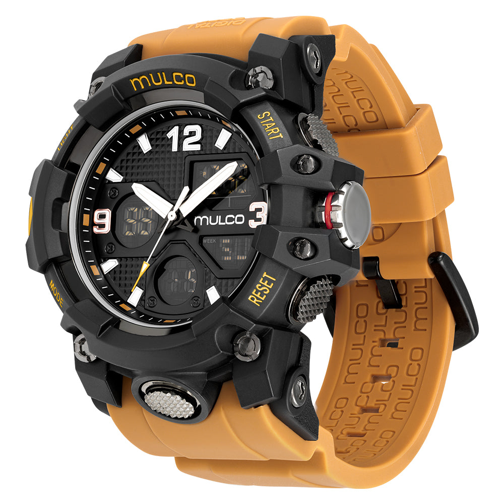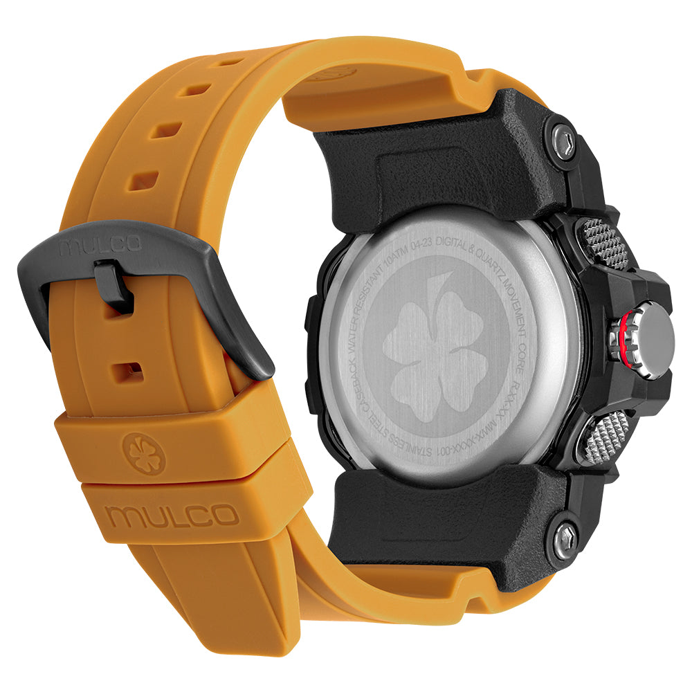 La estructura resistente a los impactos del reloj, con tecnología ABS Resist, está diseñada para un uso intensivo. Ofrece cronometraje preciso en todo el mundo, con pantallas analógicas y digitales. La gama Mulco Core incluye correa 100% de silicona, fibra de carbono, luminiscencia en índices y manos, y un proceso ionizado de 48 horas. Un reloj de hombre que combina lo mejor de la tecnología analógica y digital.