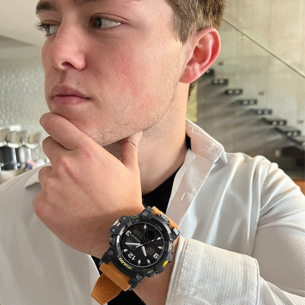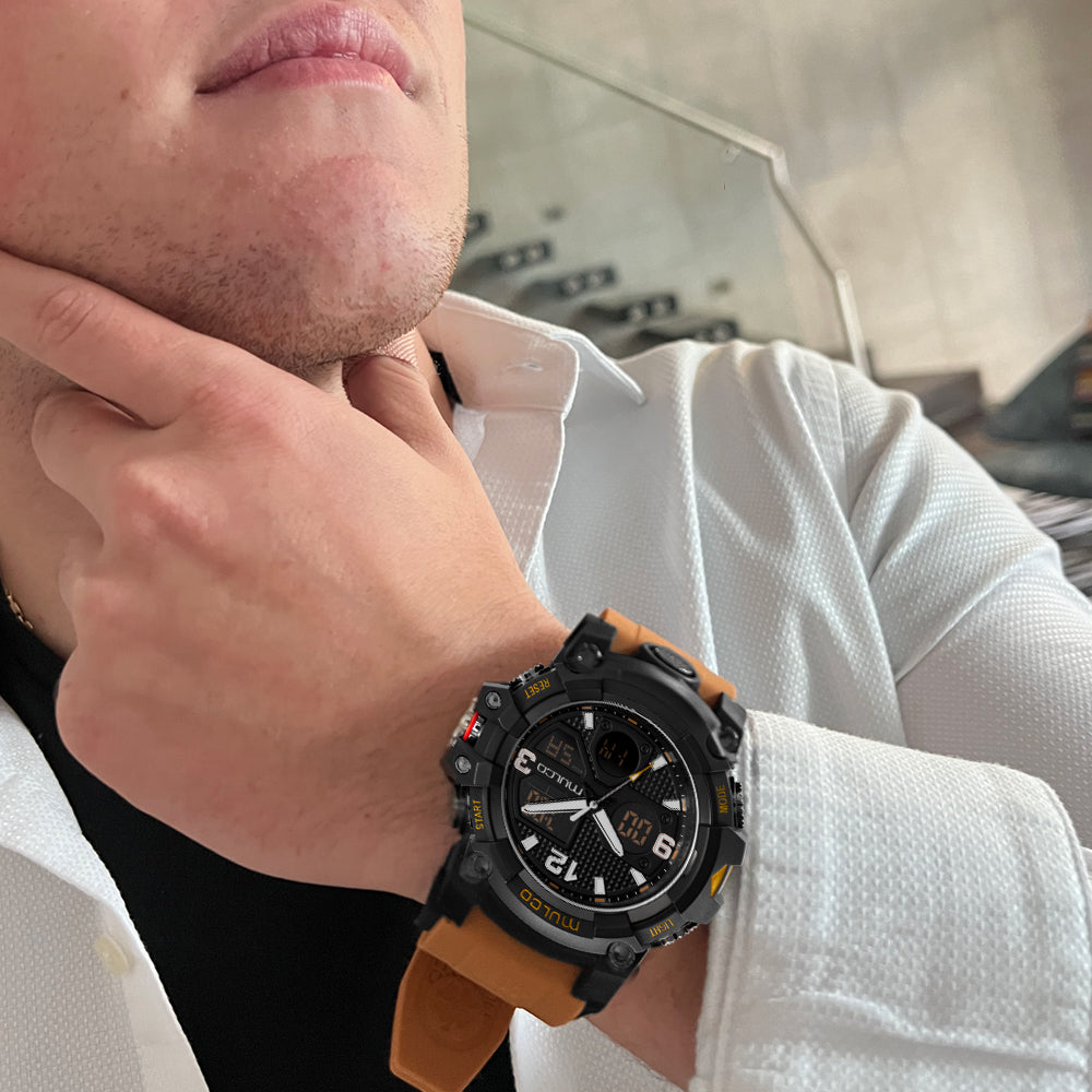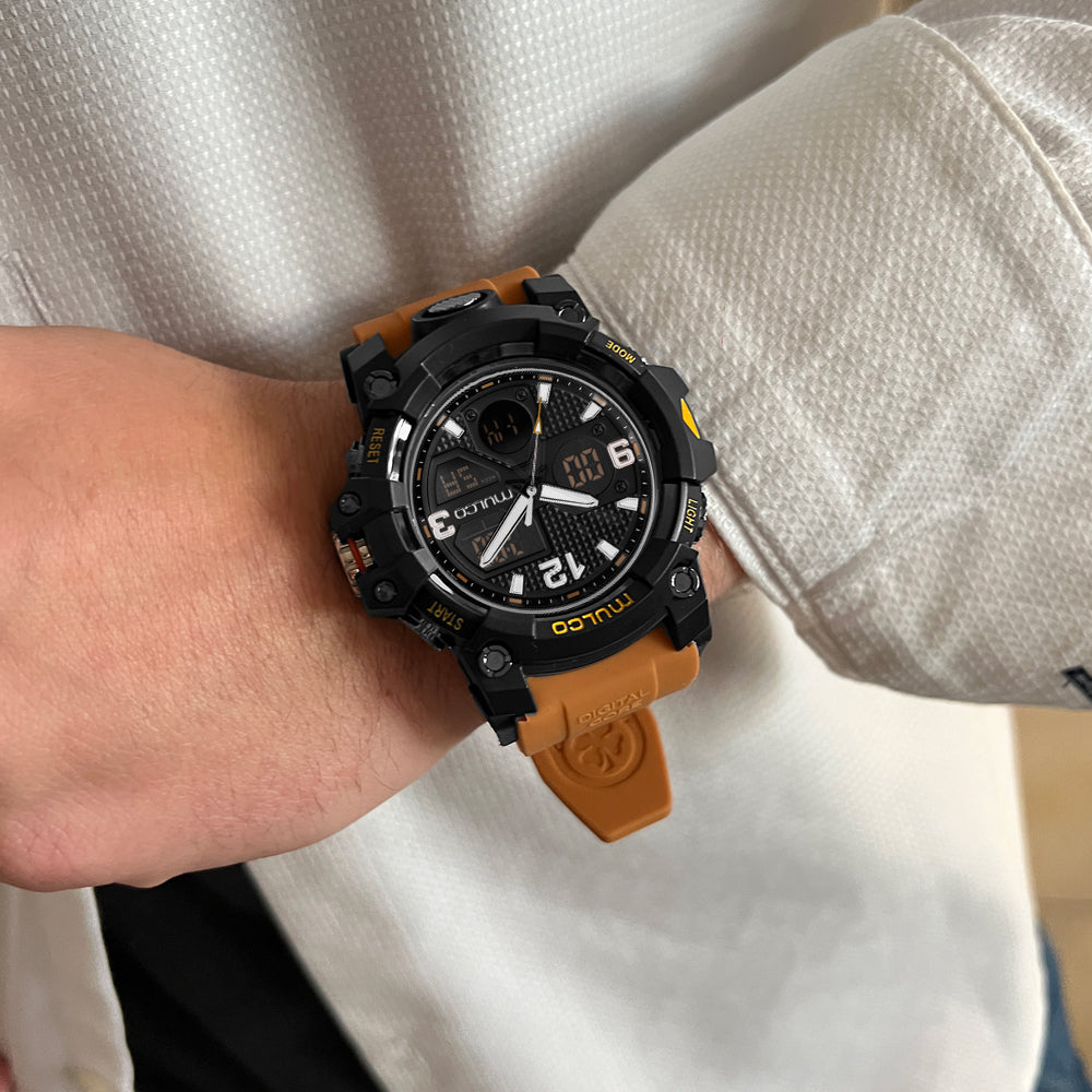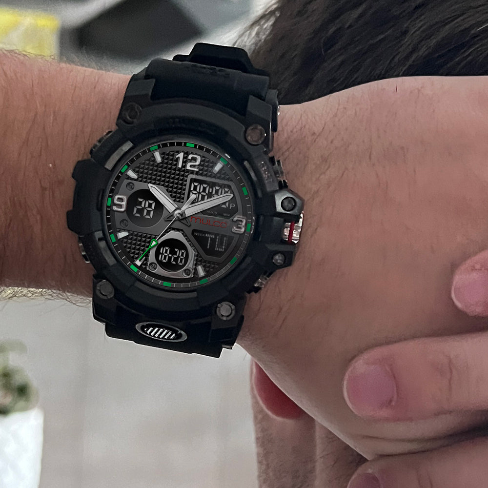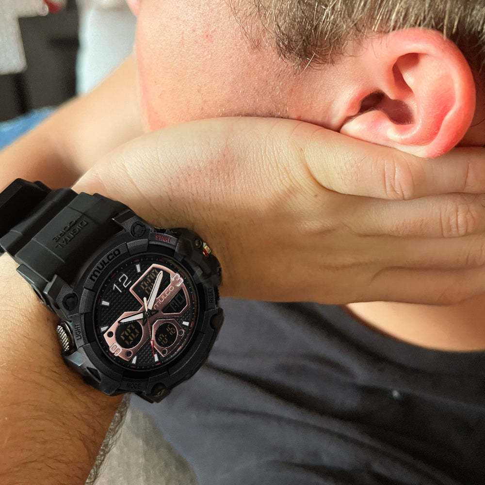 La estructura resistente a los impactos del reloj, con tecnología ABS Resist, está diseñada para un uso intensivo. Ofrece cronometraje preciso en todo el mundo, con pantallas analógicas y digitales. La gama Mulco Core incluye correa 100% de silicona, fibra de carbono, luminiscencia en índices y manos, y un proceso ionizado de 48 horas. Un reloj de hombre que combina lo mejor de la tecnología analógica y digital.