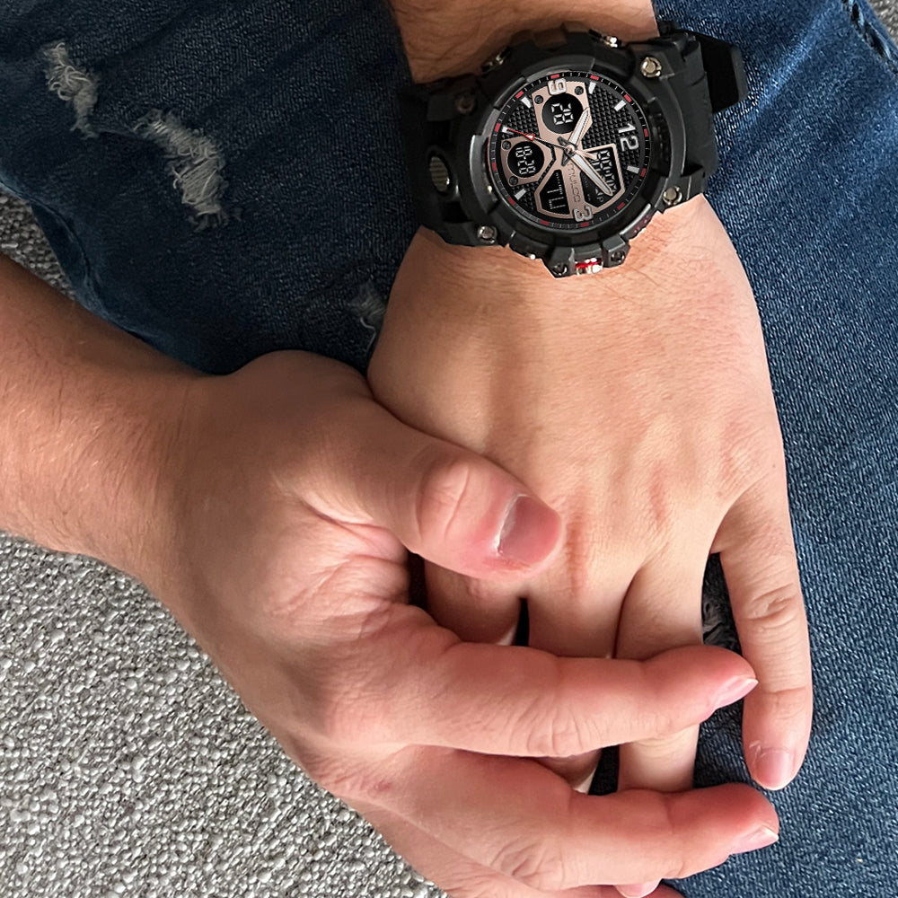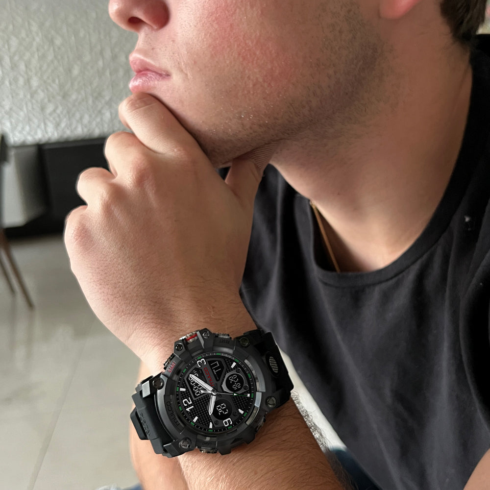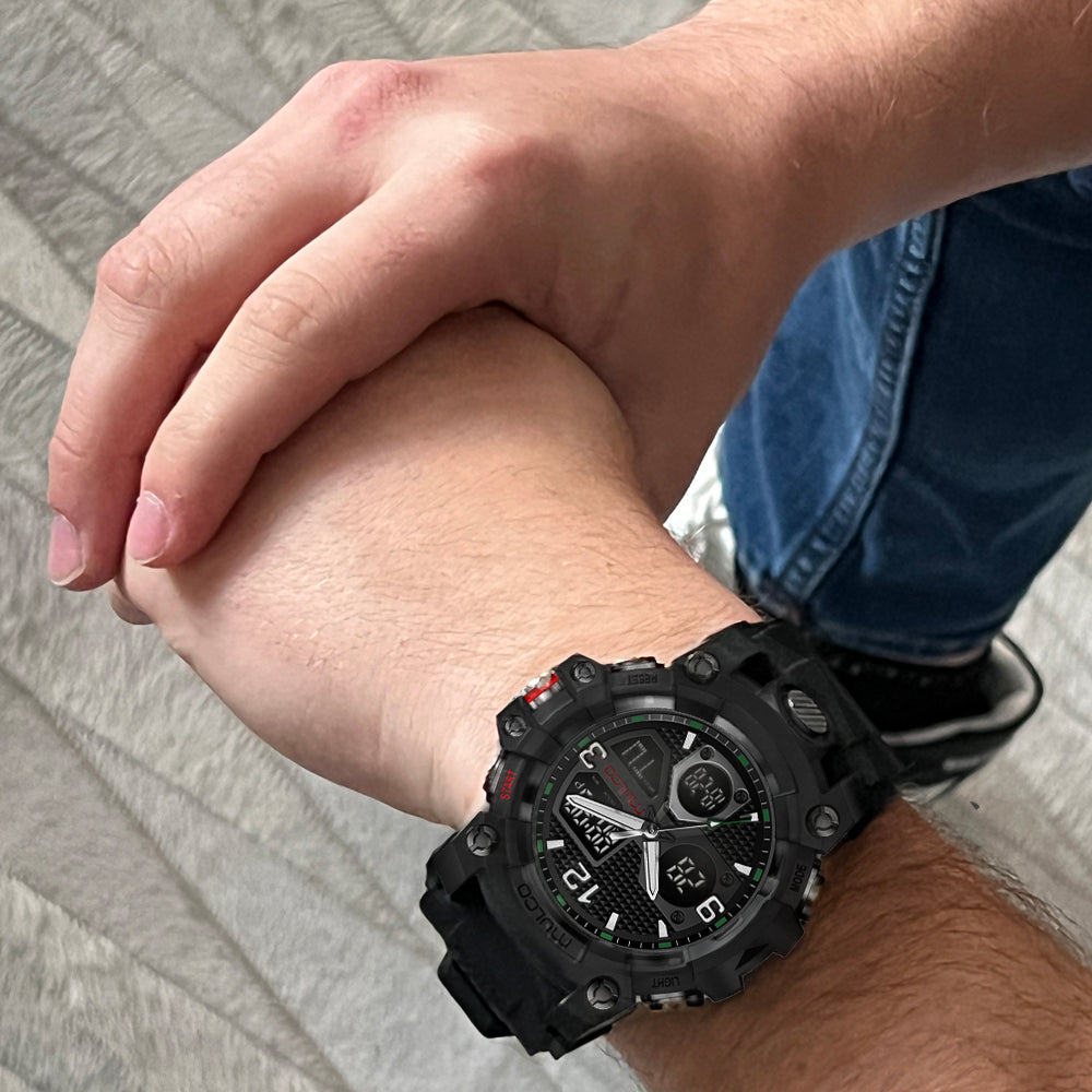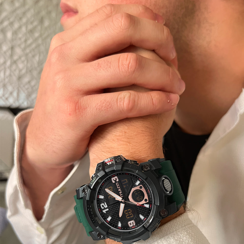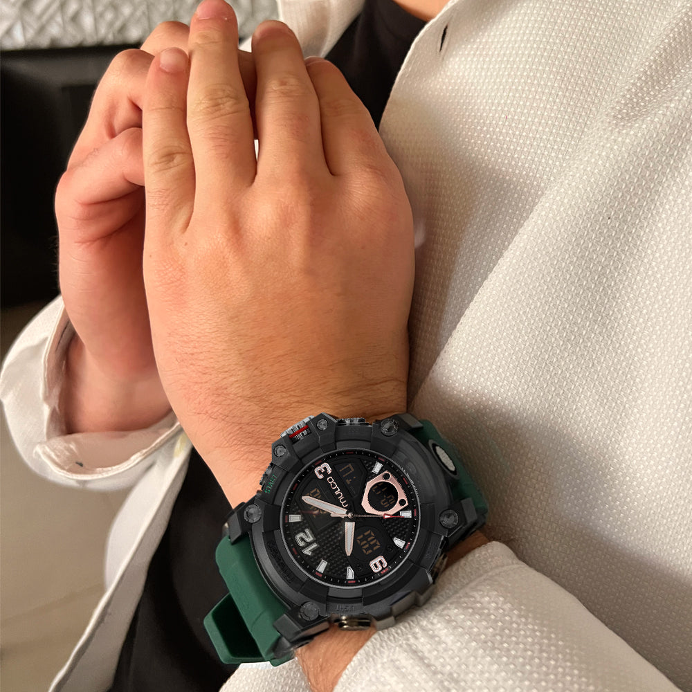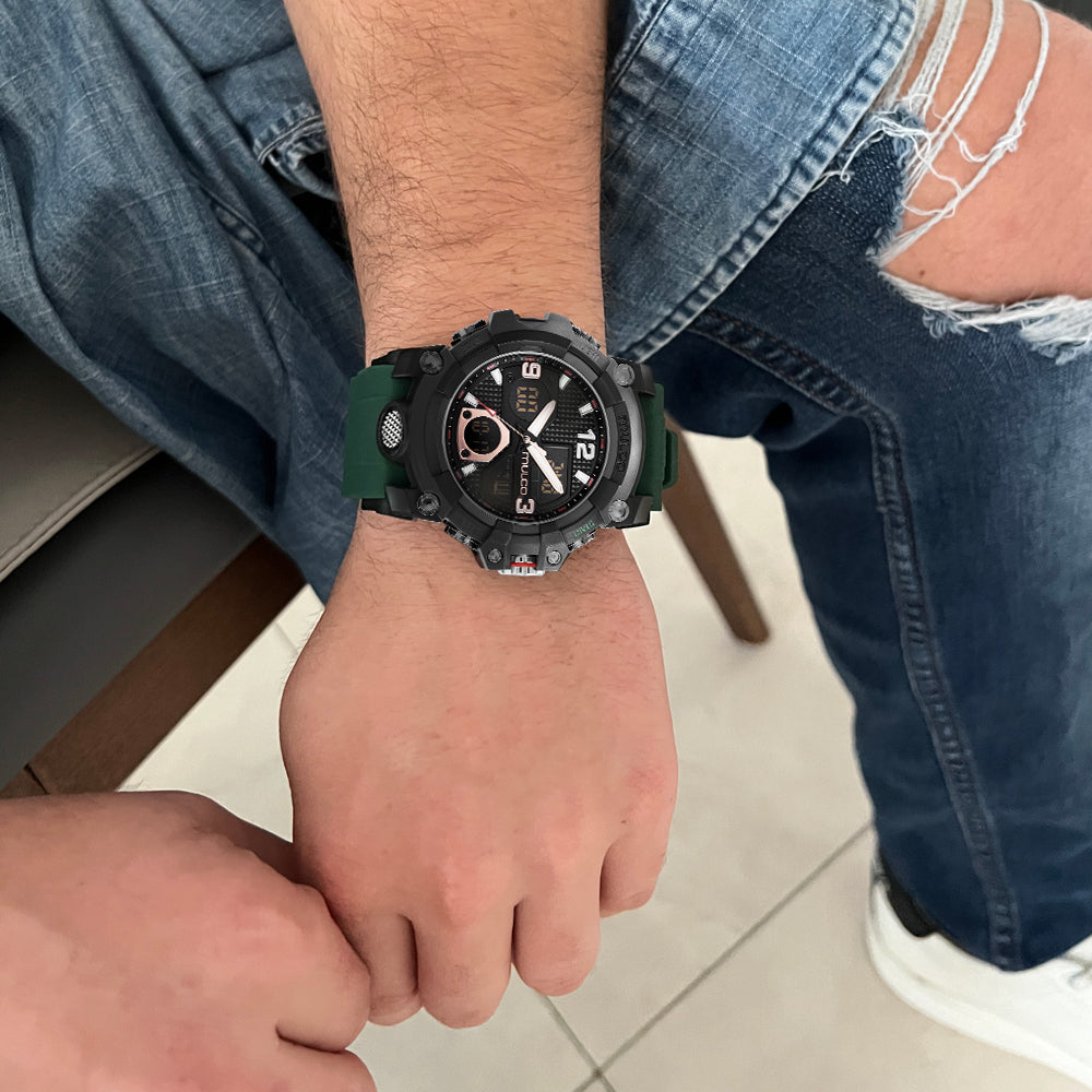 La estructura resistente a los impactos del reloj, con tecnología ABS Resist, está diseñada para un uso intensivo. Ofrece cronometraje preciso en todo el mundo, con pantallas analógicas y digitales. La gama Mulco Core incluye correa 100% de silicona, fibra de carbono, luminiscencia en índices y manos, y un proceso ionizado de 48 horas. Un reloj de hombre que combina lo mejor de la tecnología analógica y digital.