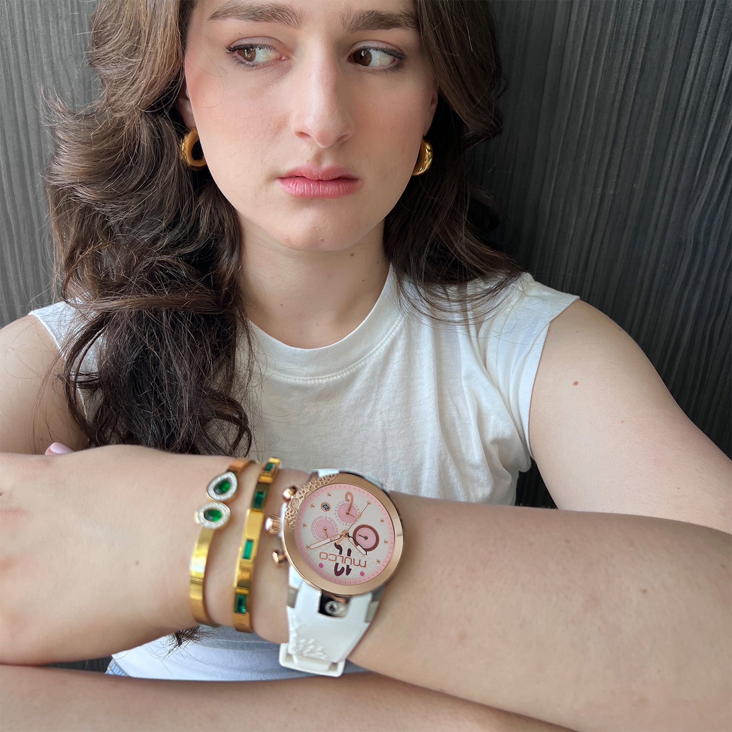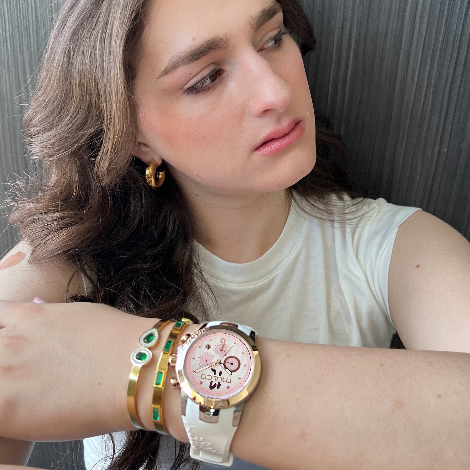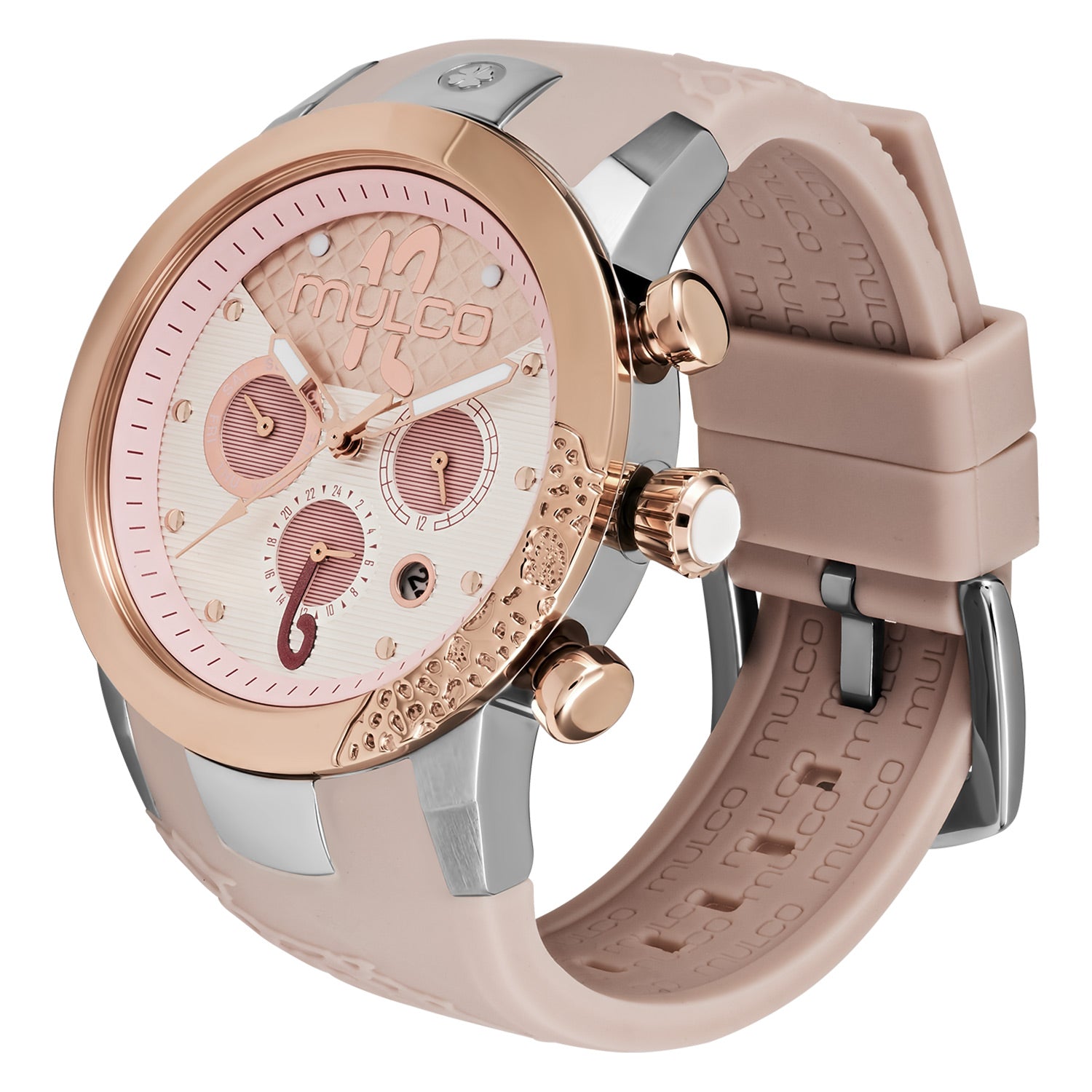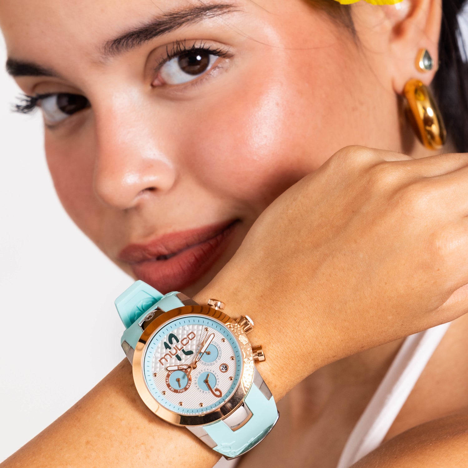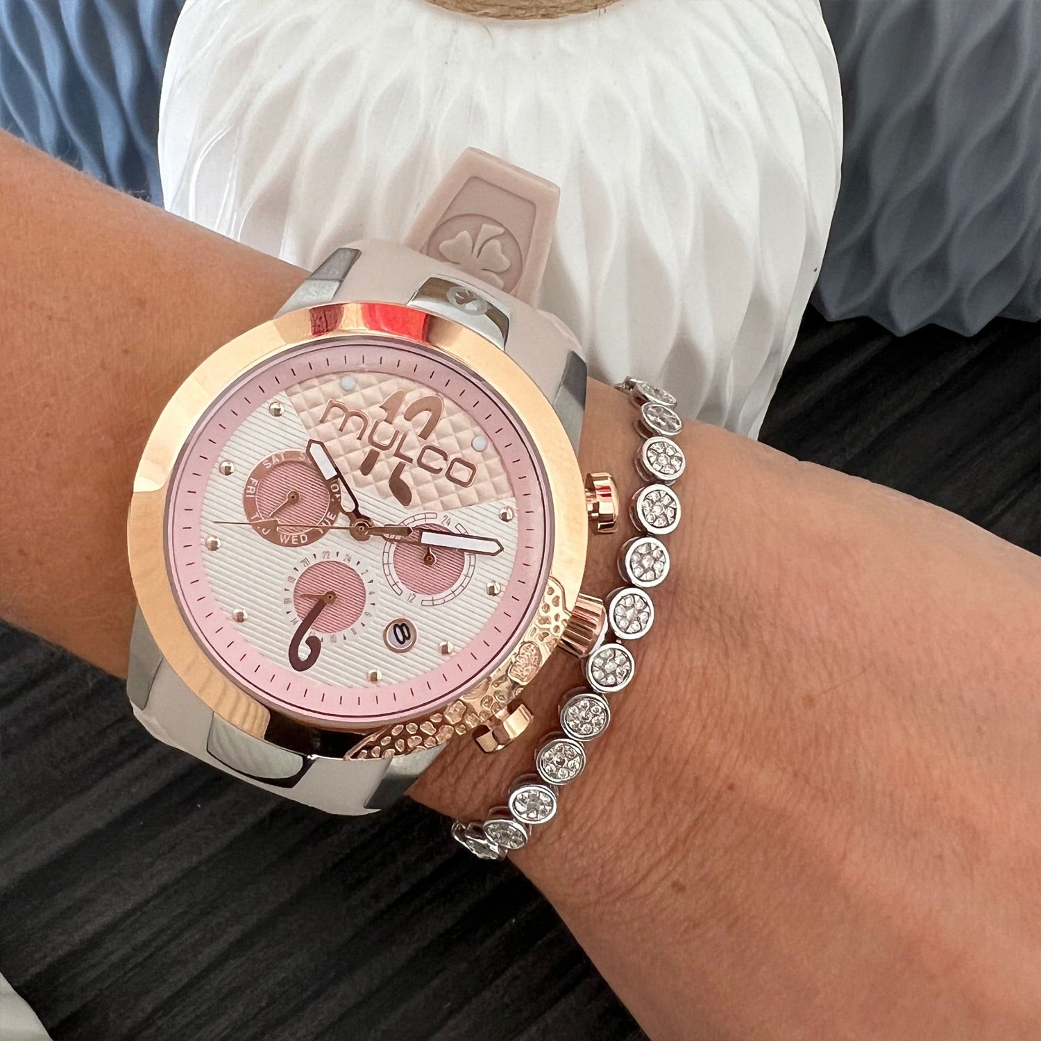Presentamos el nuevo Mulco Lady D, un reloj sofisticado con correa de silicona resistente y elegante. Su diseño combina tweed, bordados, perlas y detalles en oro rosado, convirtiéndolo en la pieza ideal para el uso diario.