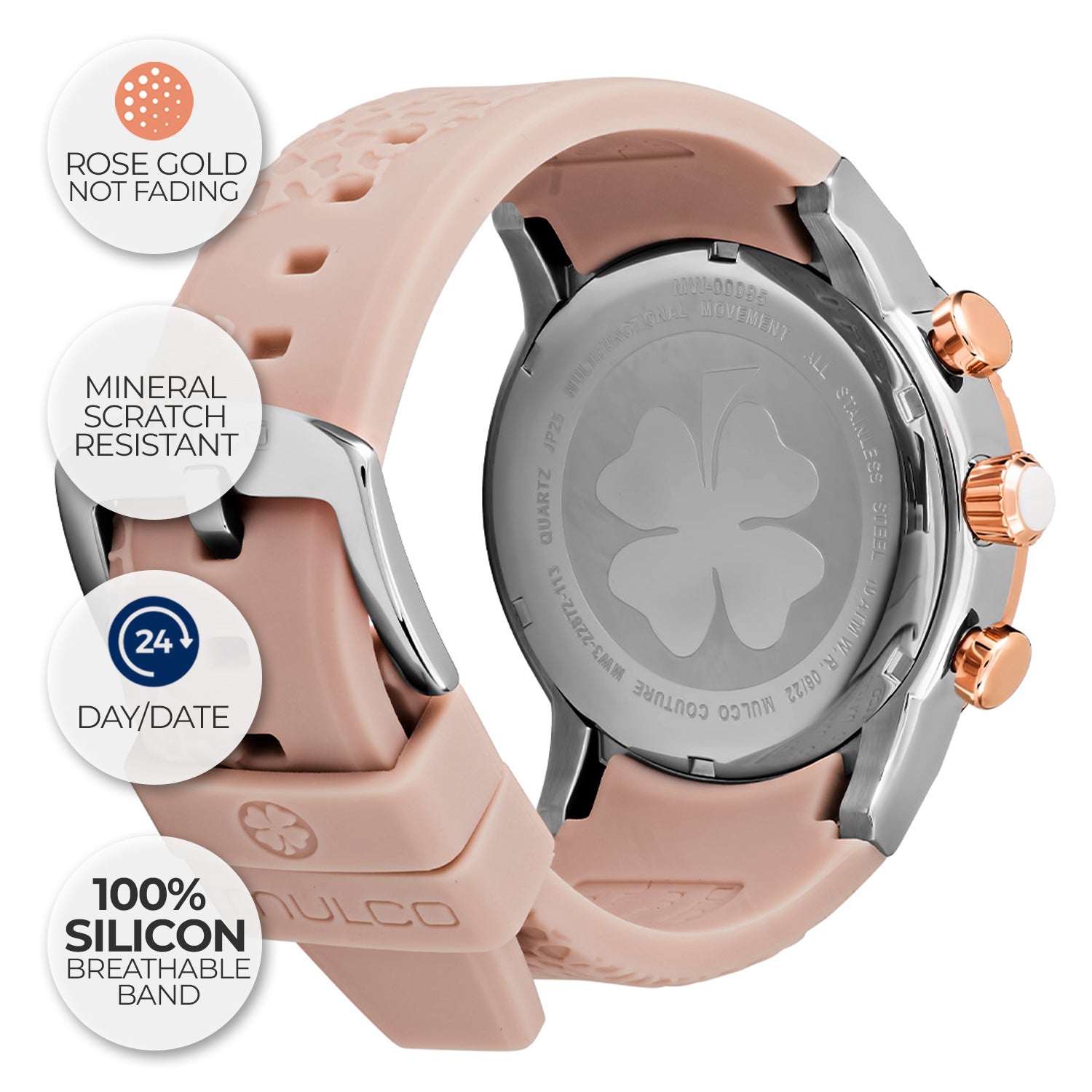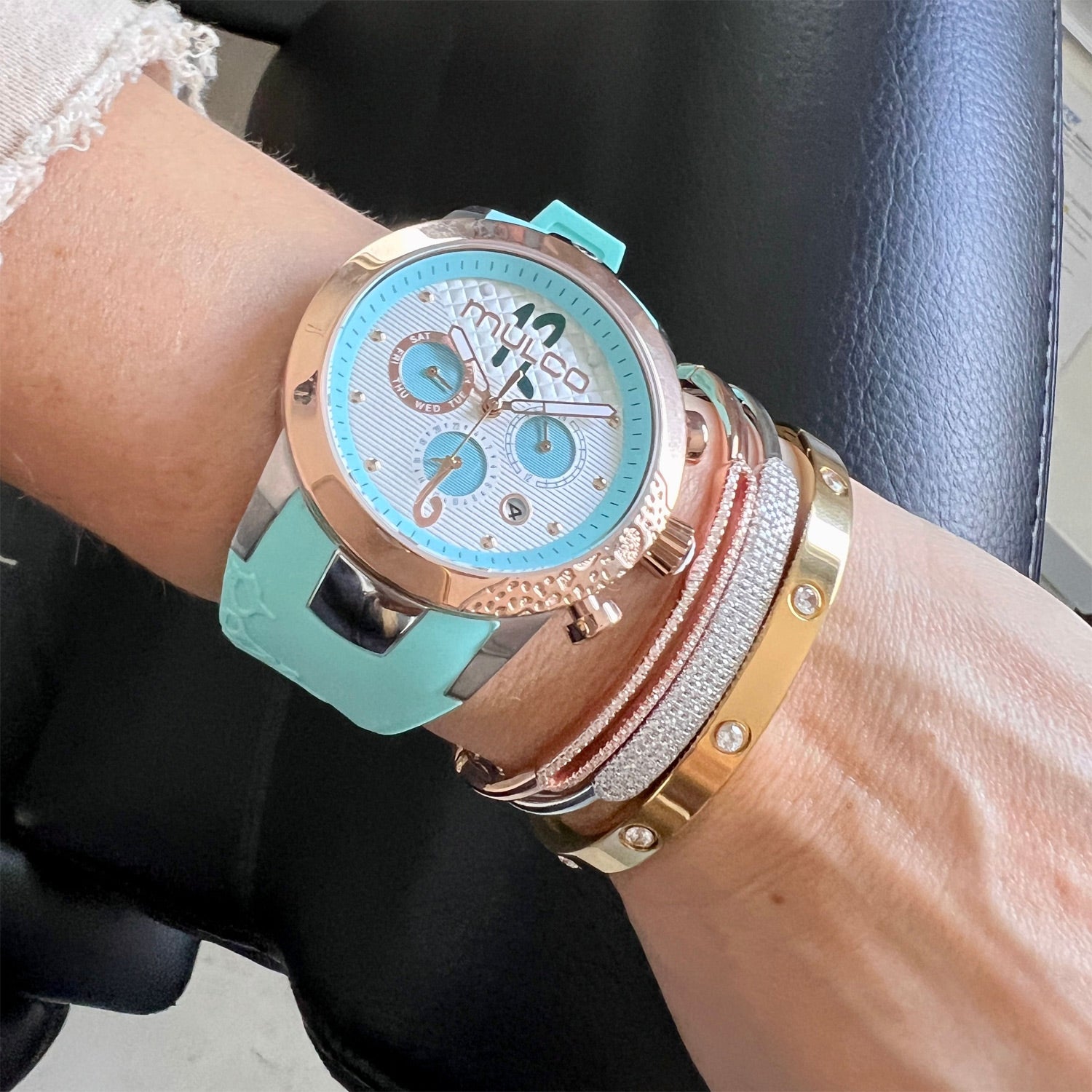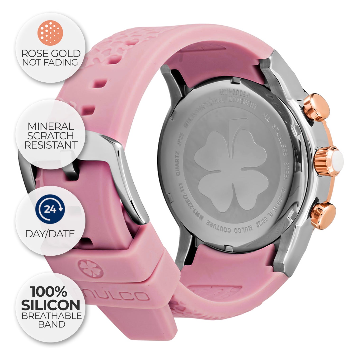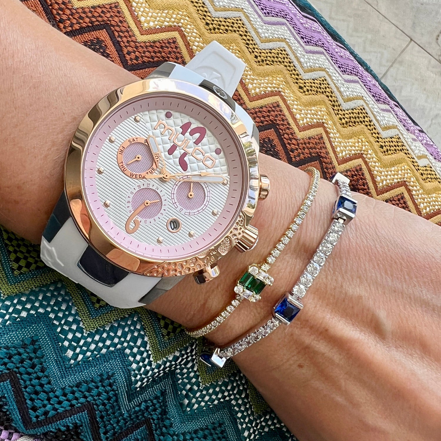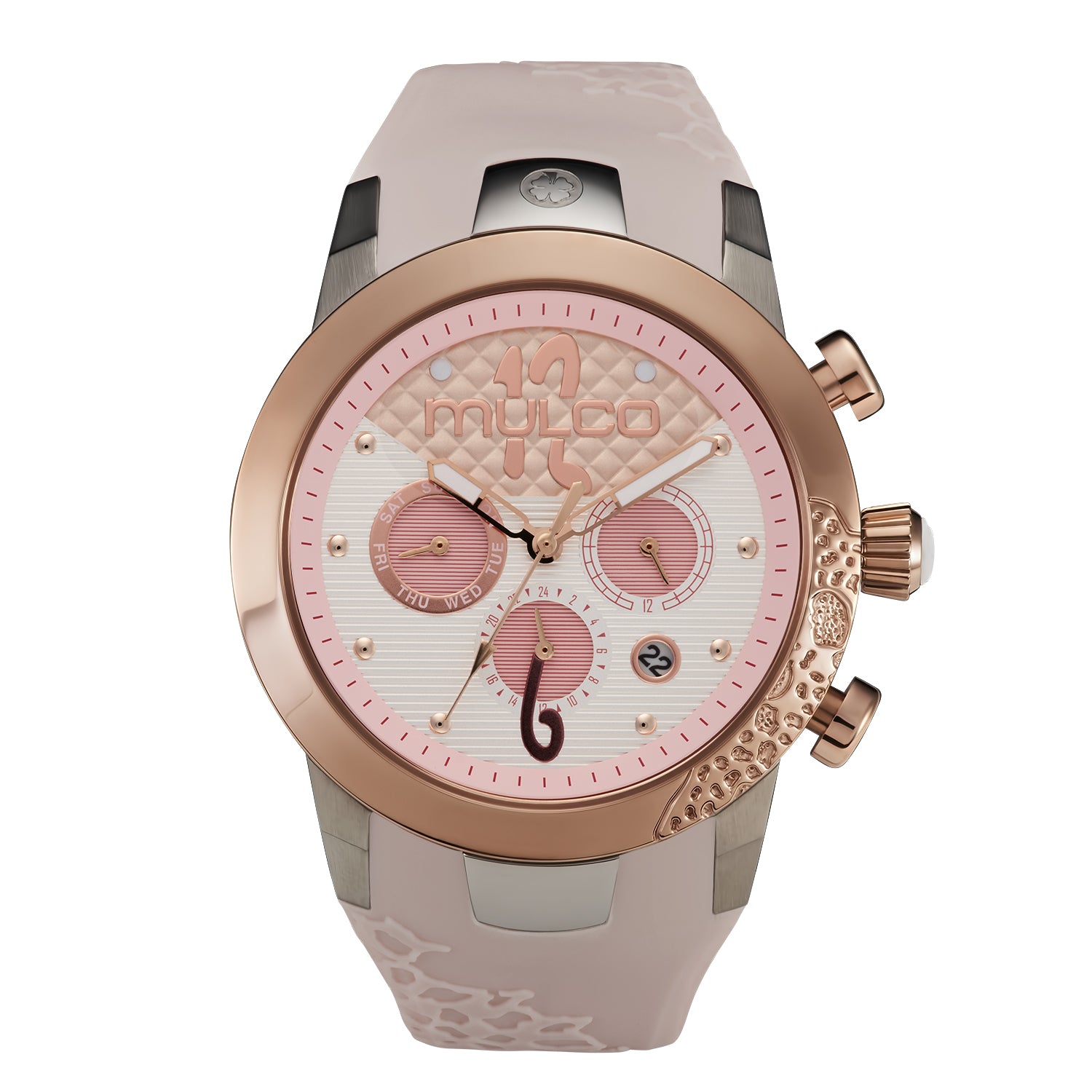 Presentamos el nuevo Mulco Lady D, un reloj sofisticado con correa de silicona resistente y elegante. Su diseño combina tweed, bordados, perlas y detalles en oro rosado, convirtiéndolo en la pieza ideal para el uso diario.
