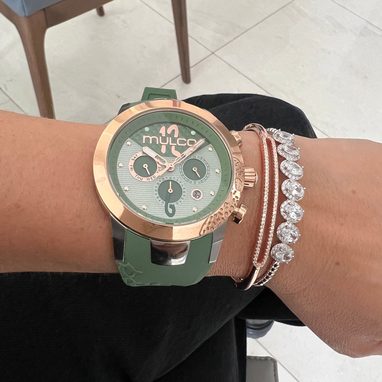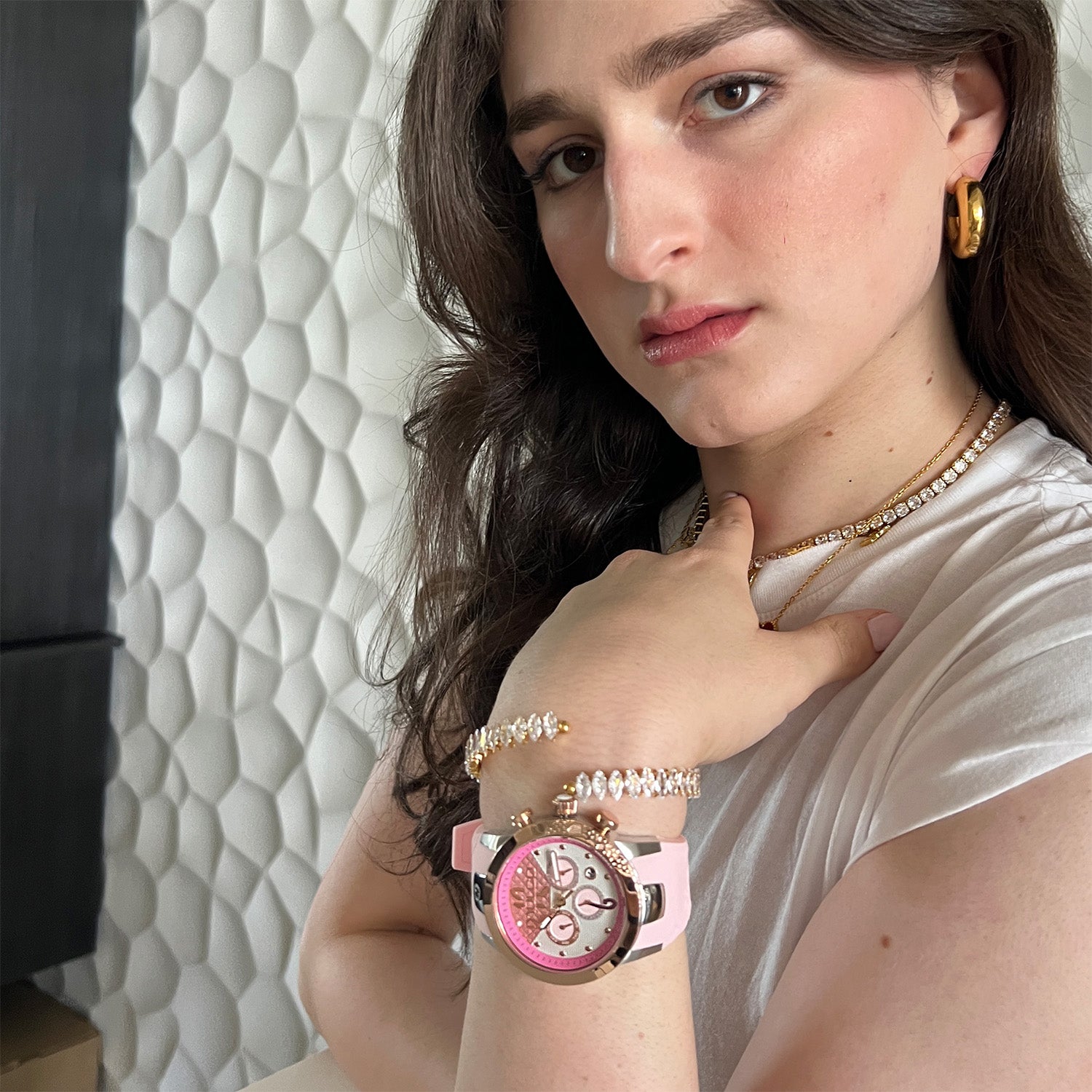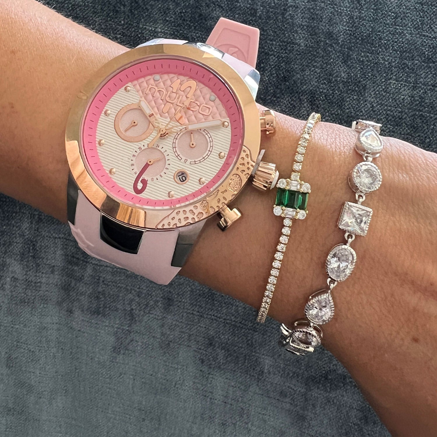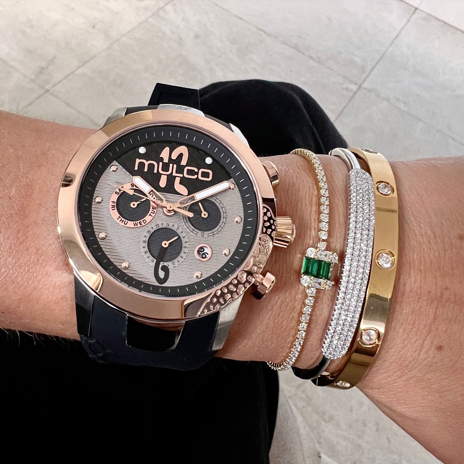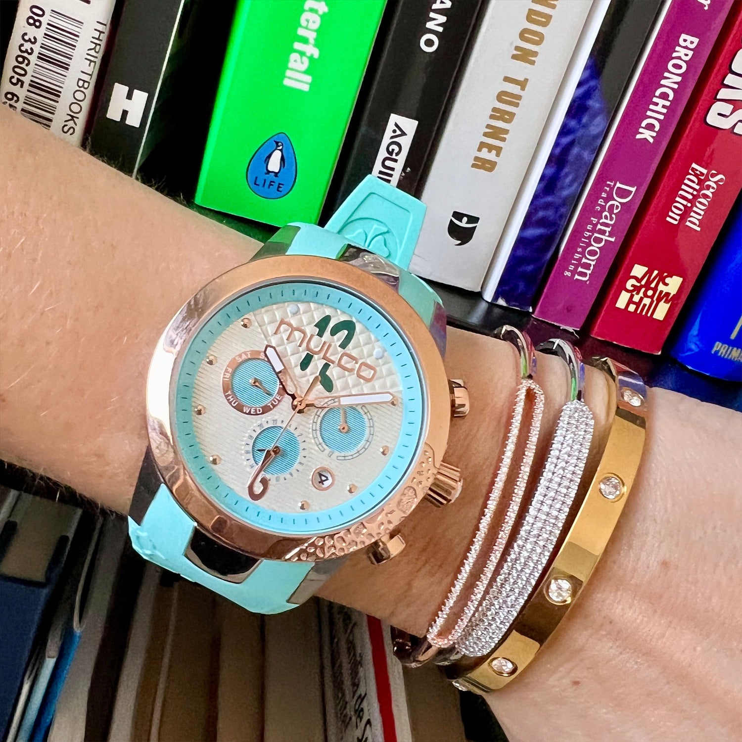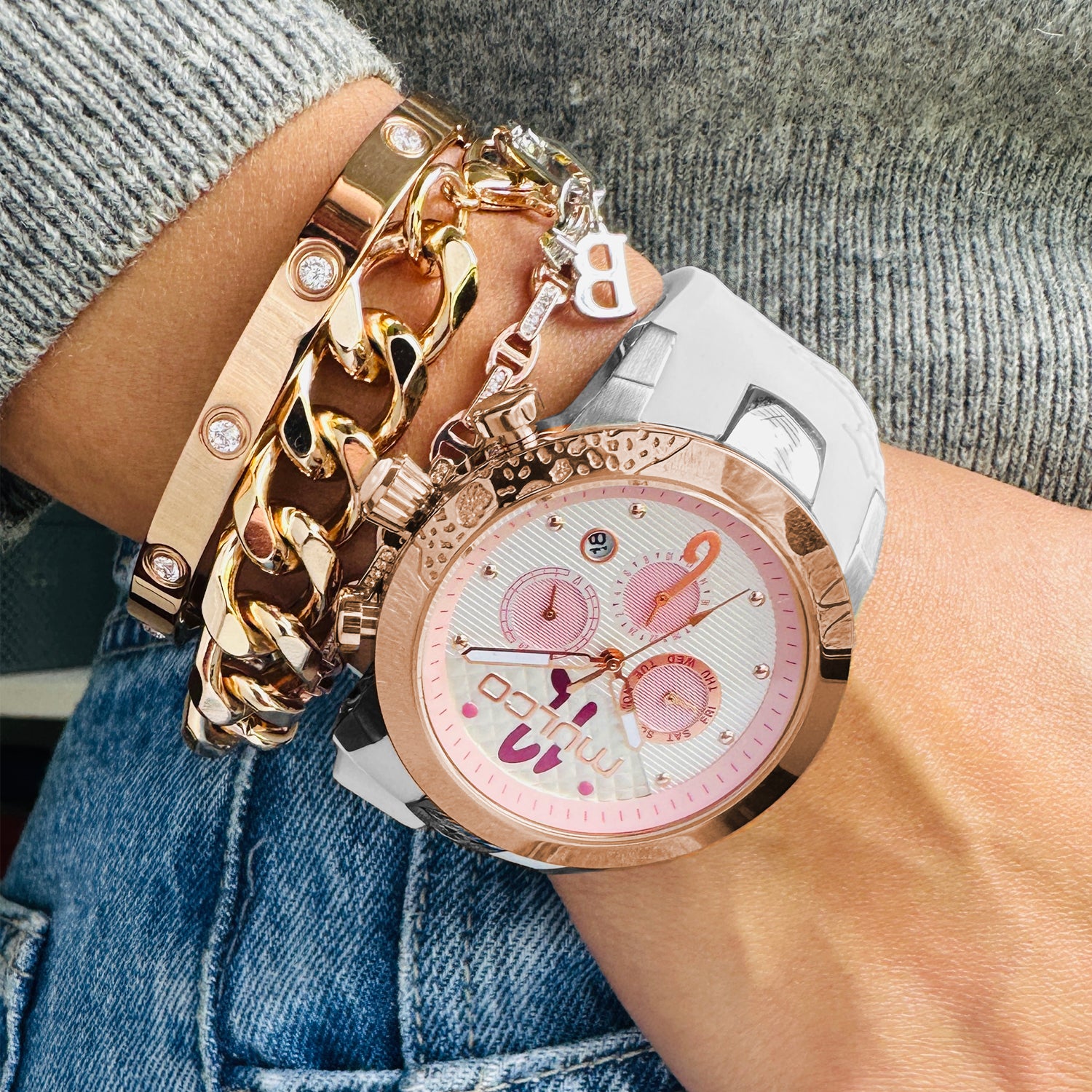 Presentamos el nuevo Mulco Lady D, un reloj sofisticado con correa de silicona resistente y elegante. Su diseño combina tweed, bordados, perlas y detalles en oro rosado, convirtiéndolo en la pieza ideal para el uso diario.