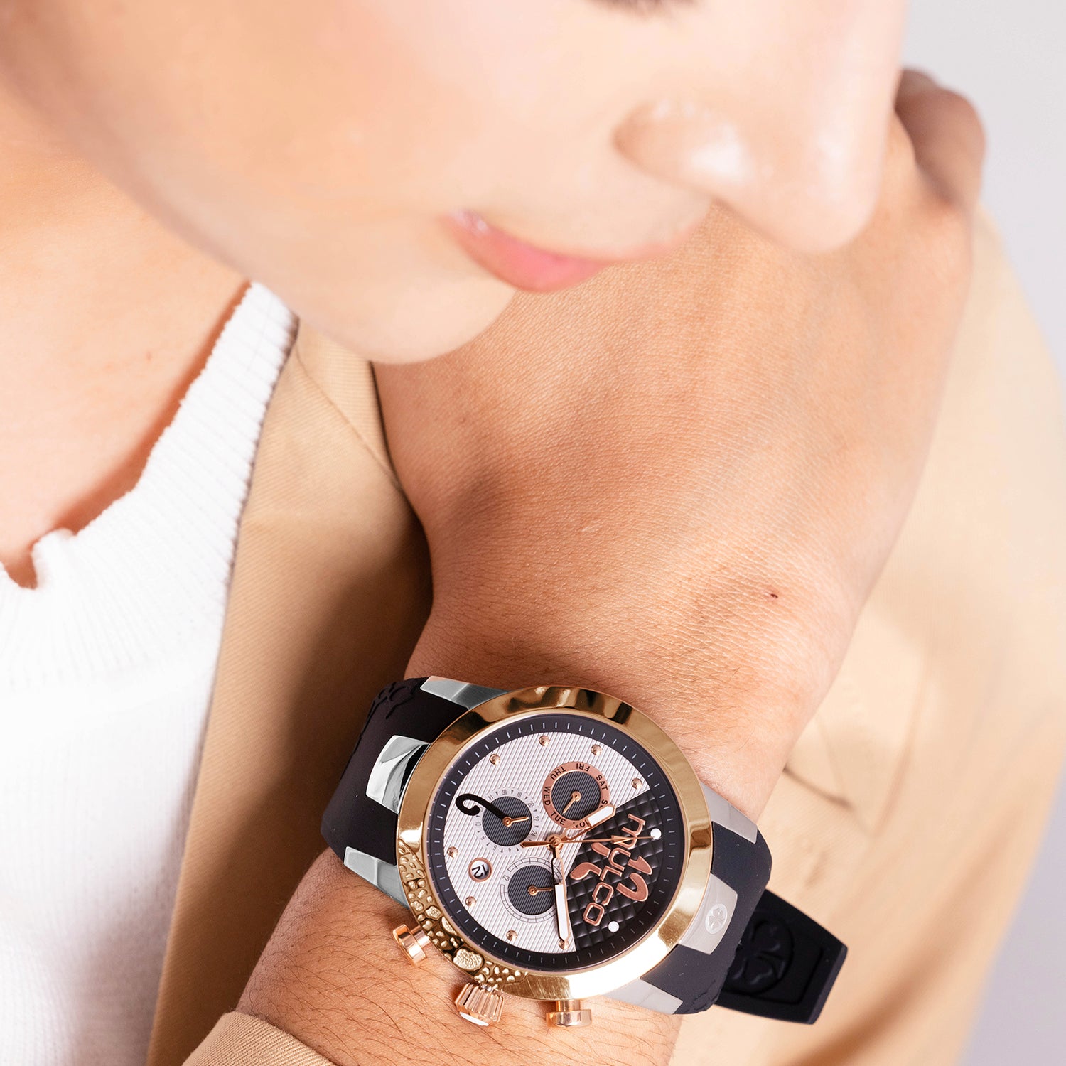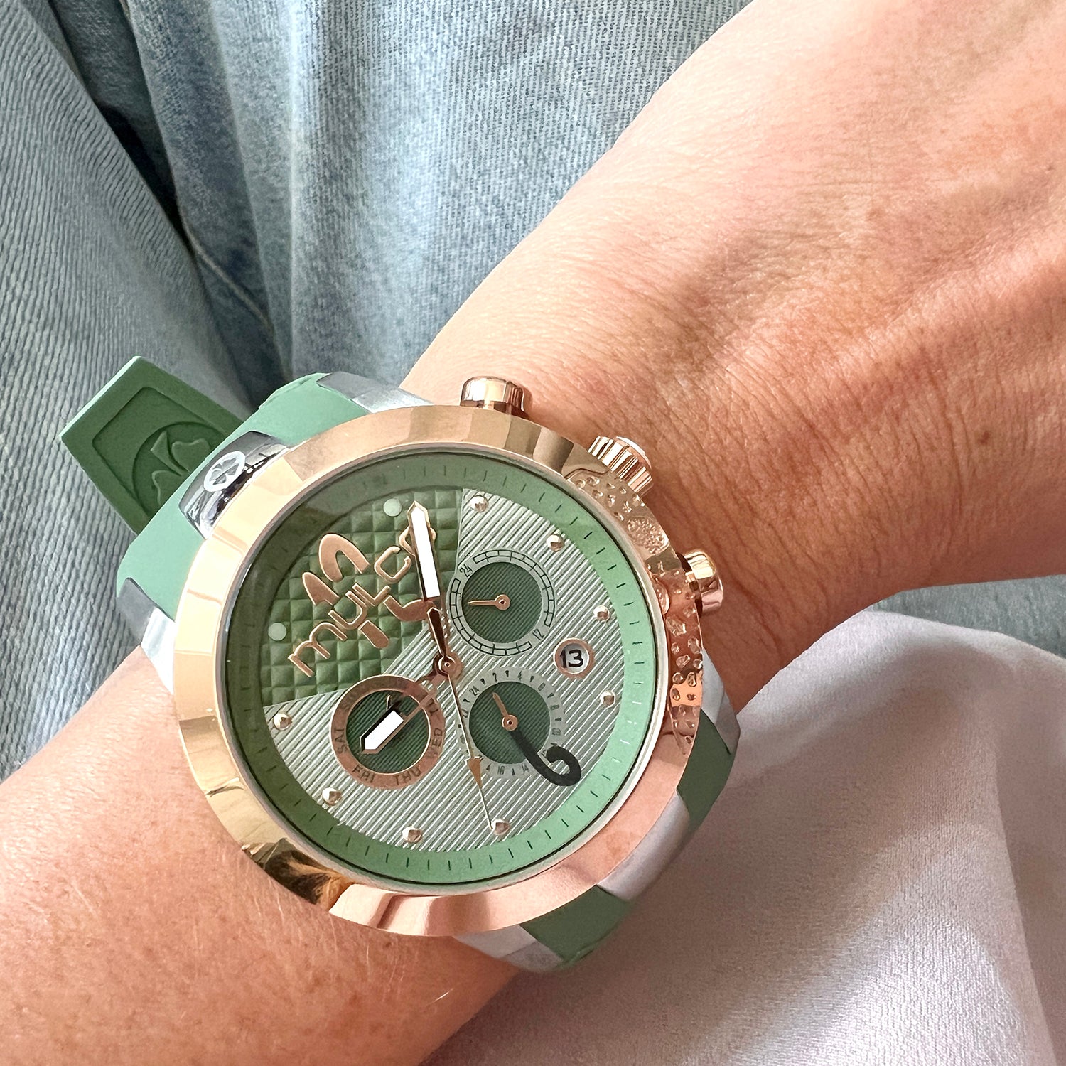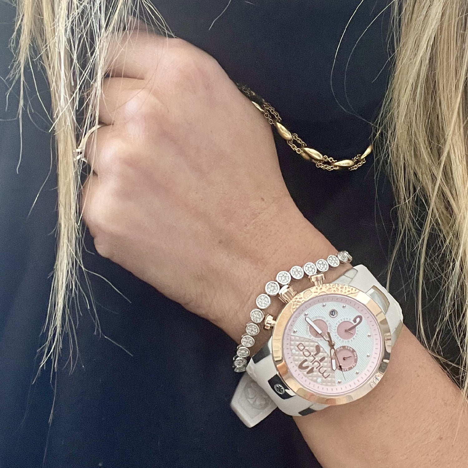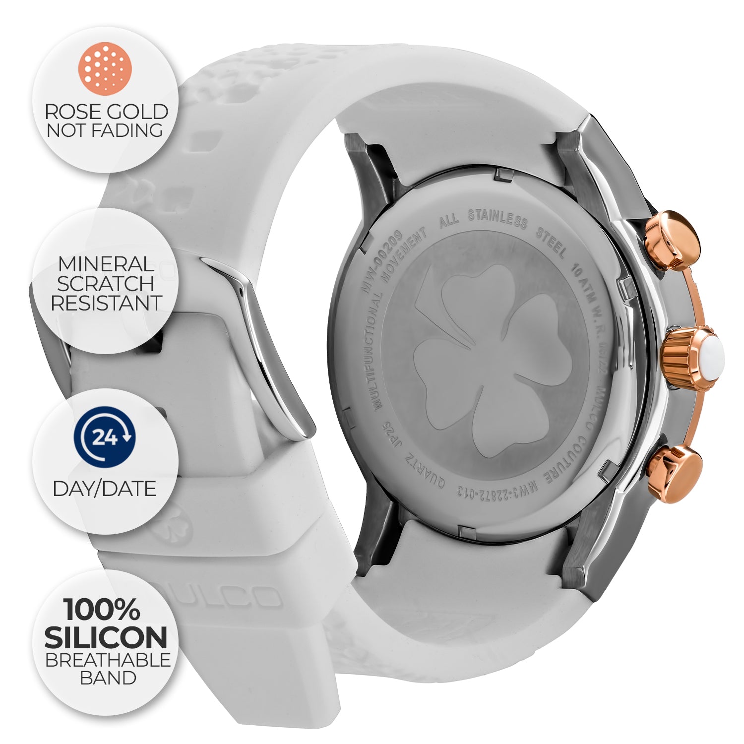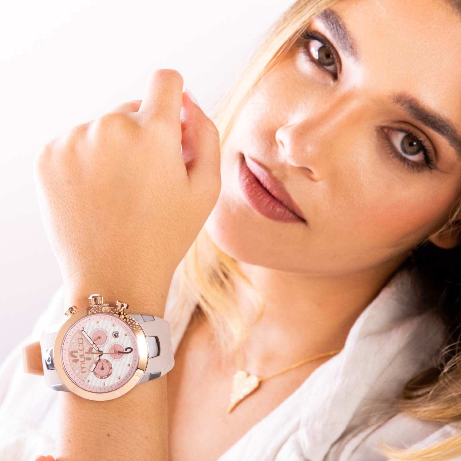 Presentamos el nuevo Mulco Lady D, un reloj sofisticado con correa de silicona resistente y elegante. Su diseño combina tweed, bordados, perlas y detalles en oro rosado, convirtiéndolo en la pieza ideal para el uso diario.