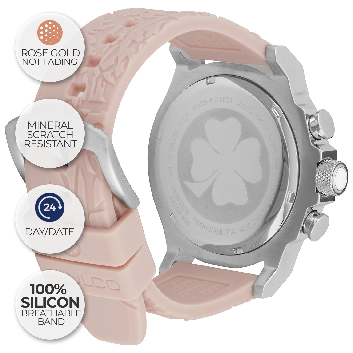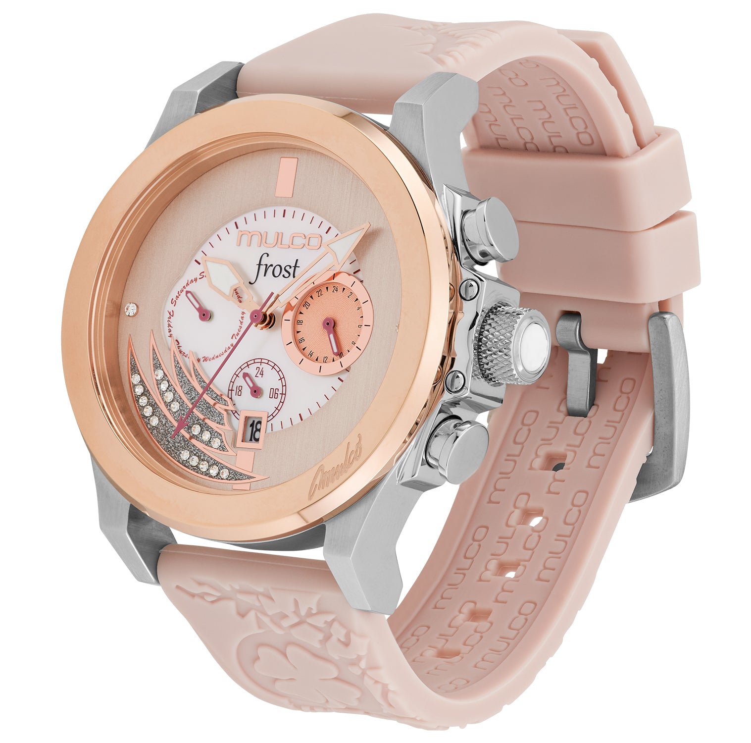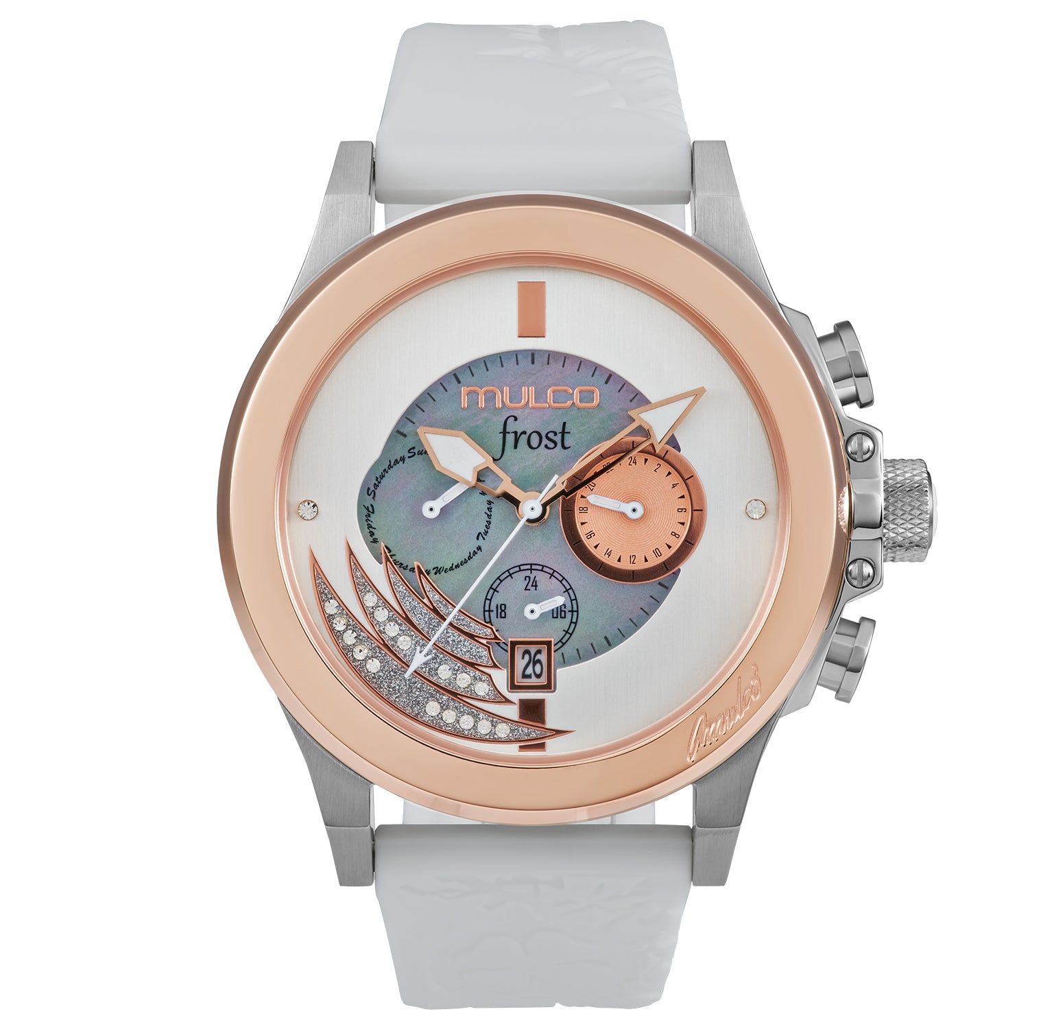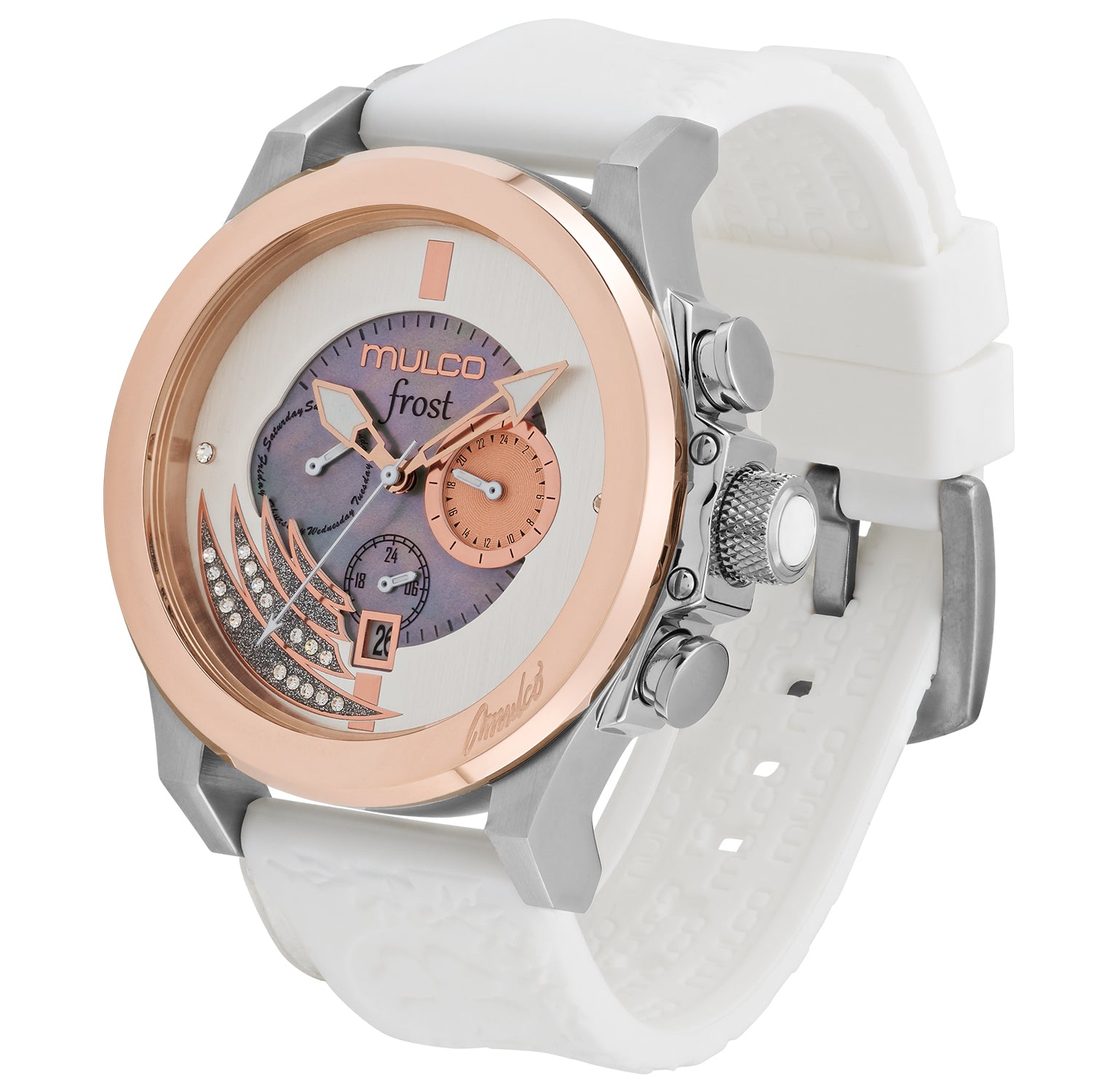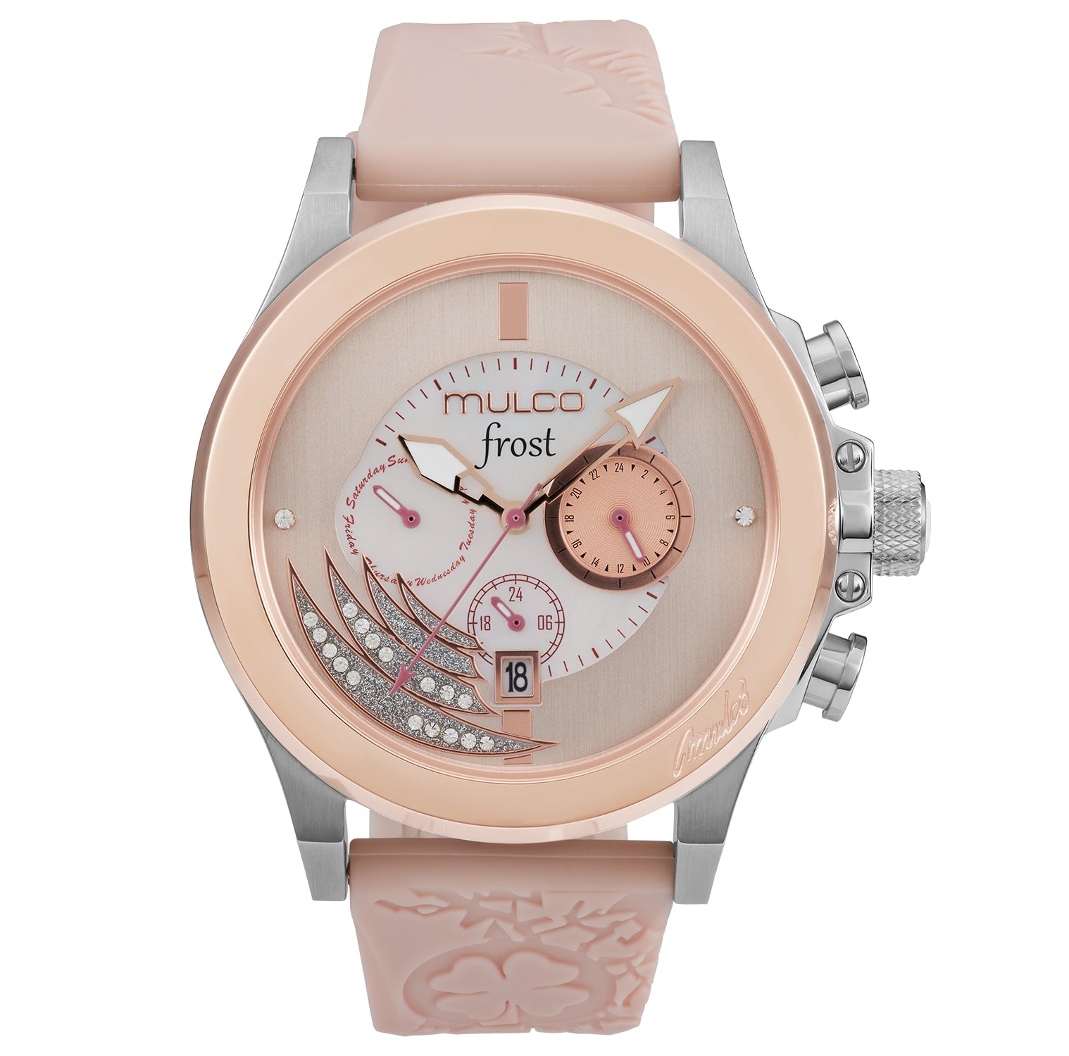 Reloj Mulco Frost Full Moon para mujer, con movimiento cronógrafo suizo, piedras de nácar y Swarovski, detalles en oro rosa y diseño de banda de silicona.