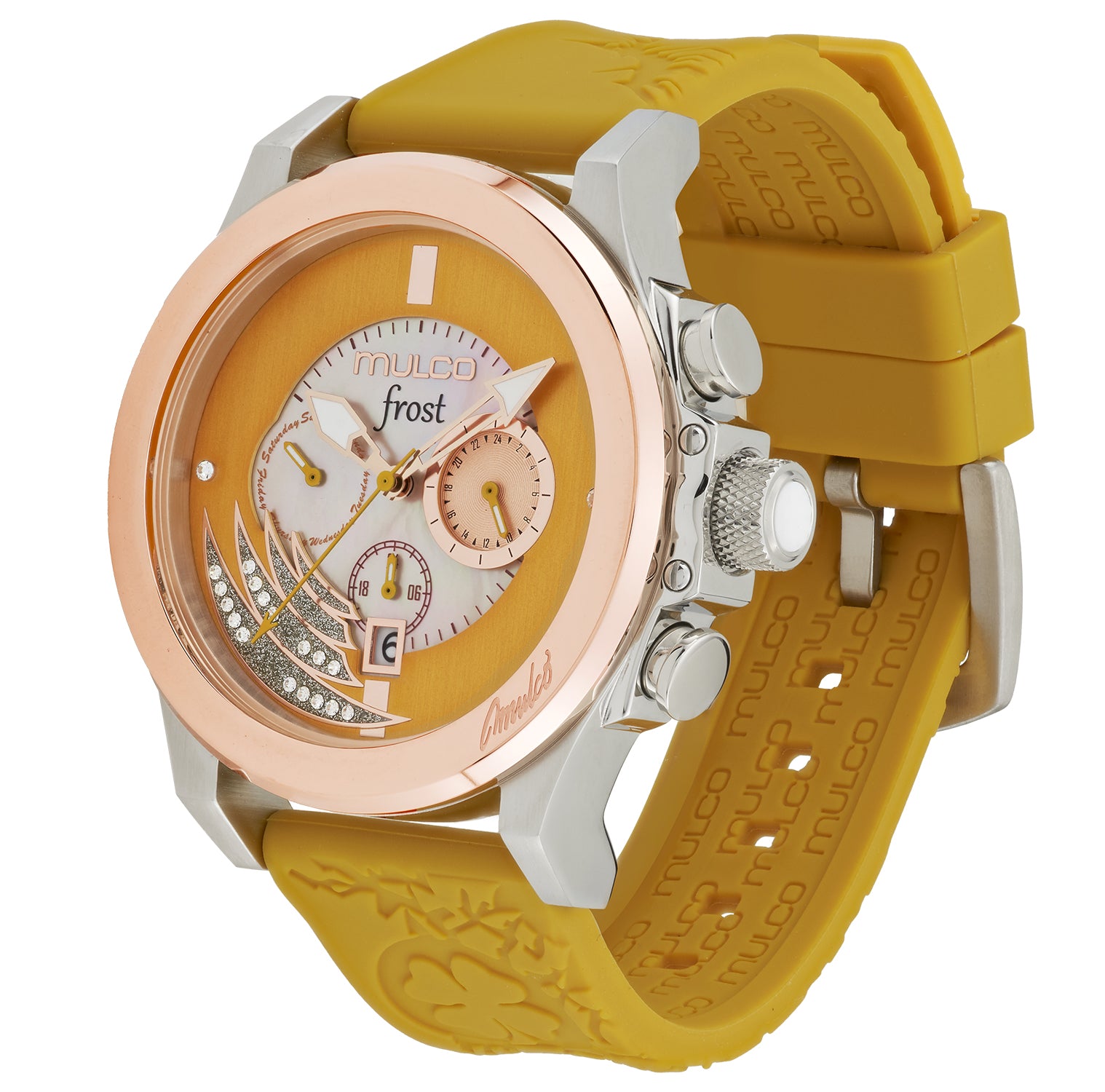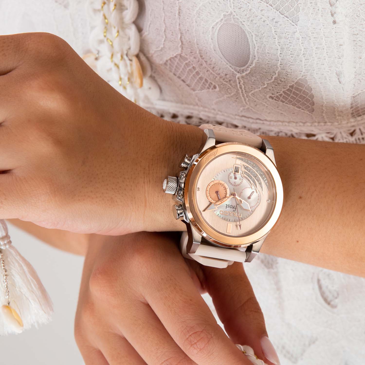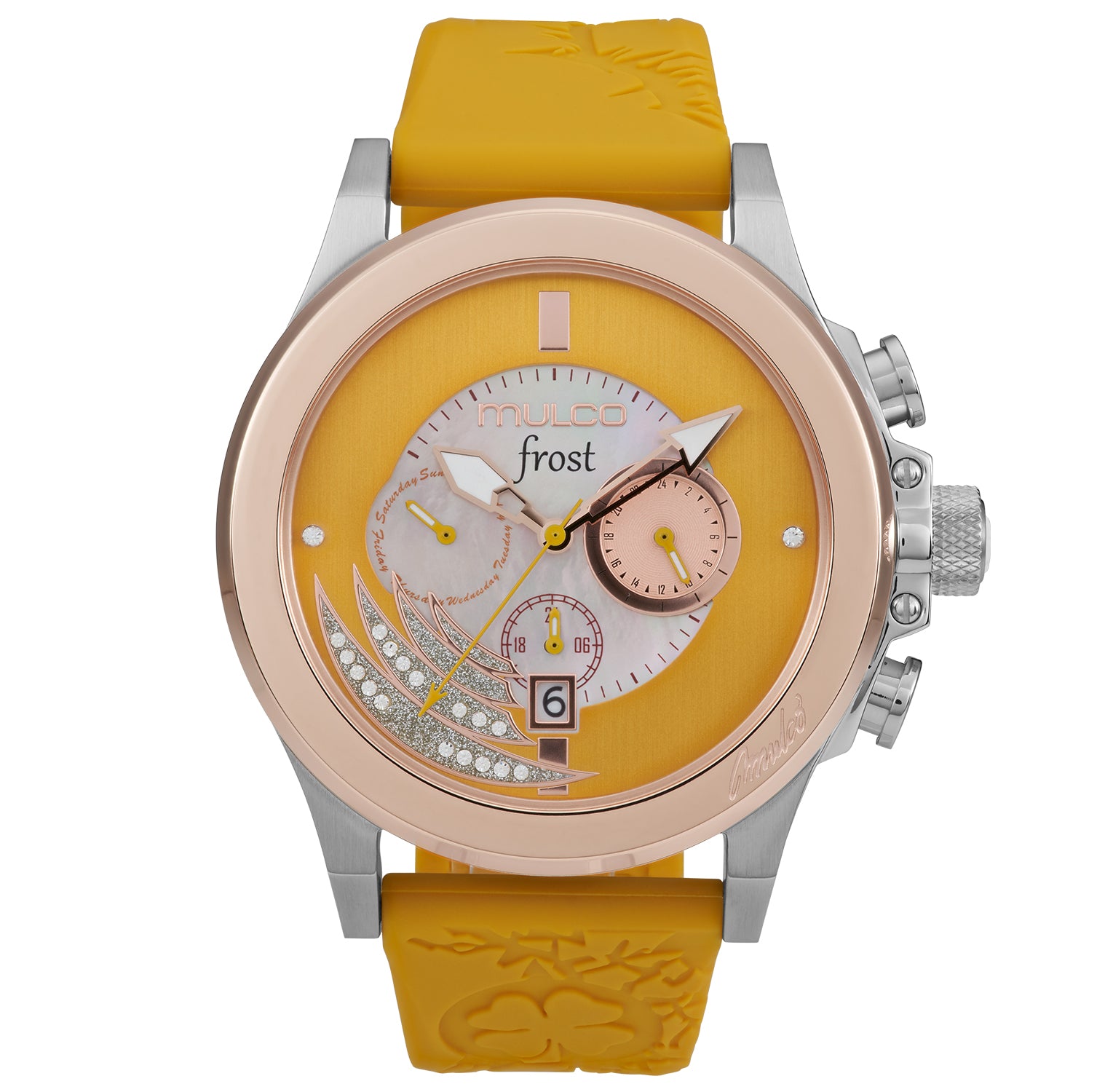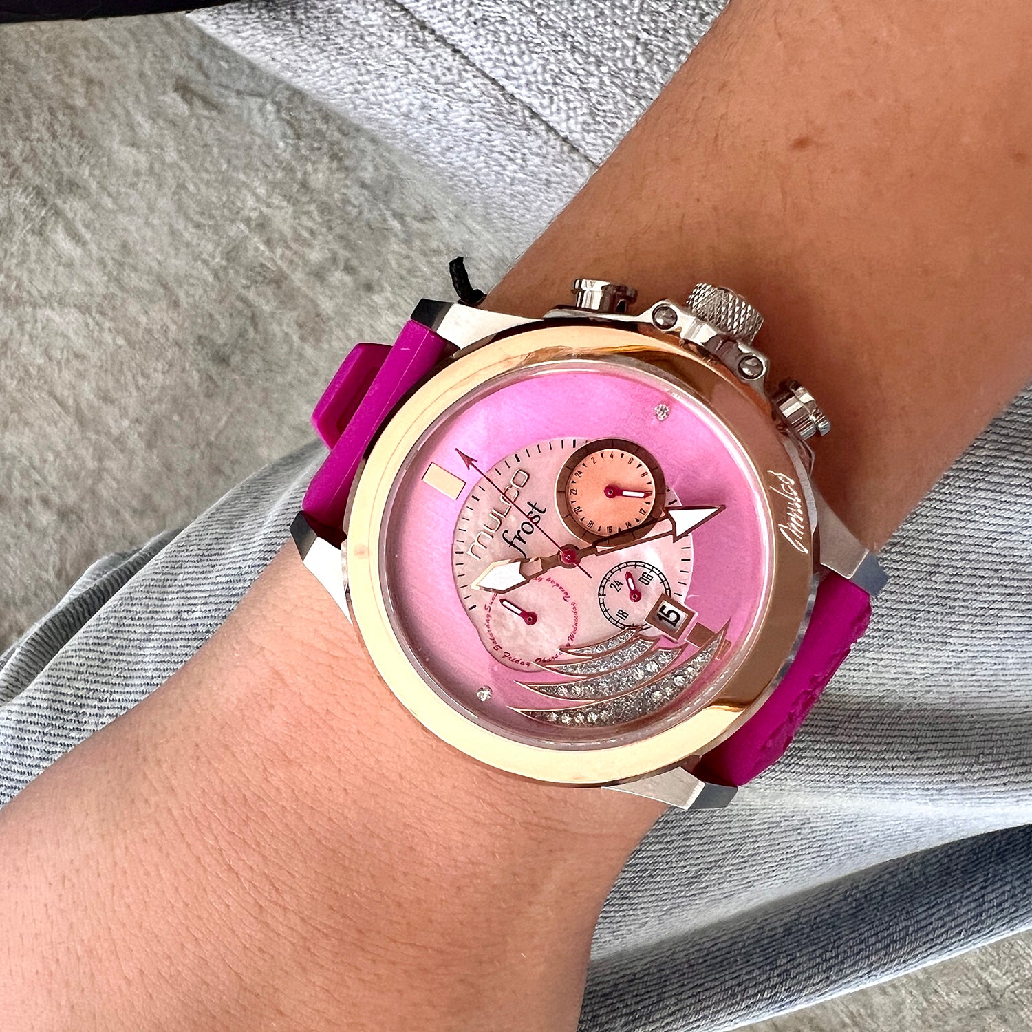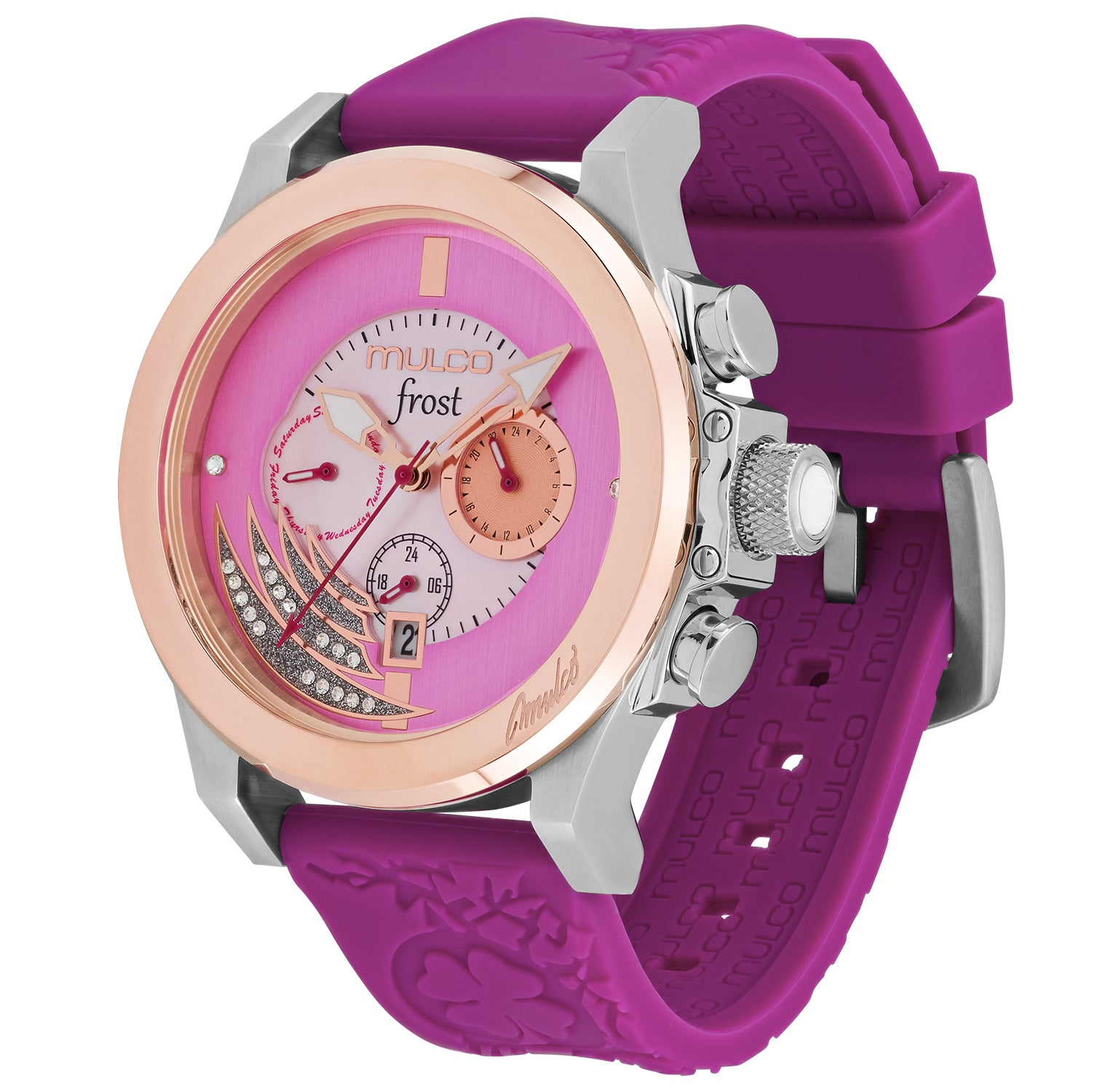 Reloj Mulco Frost Full Moon para mujer, con movimiento cronógrafo suizo, piedras de nácar y Swarovski, detalles en oro rosa y diseño de banda de silicona.