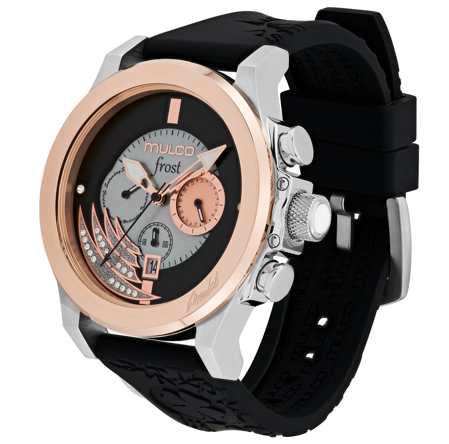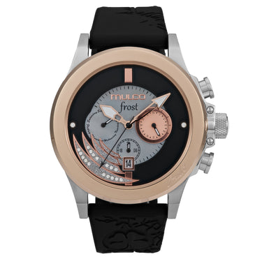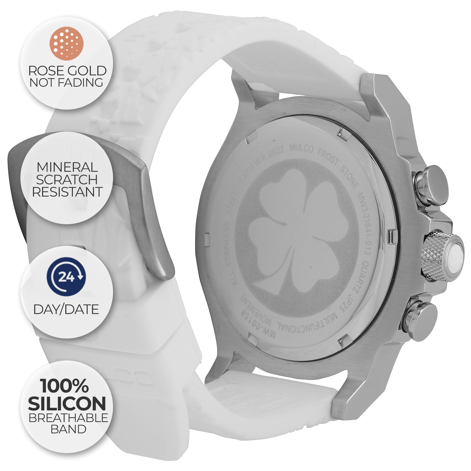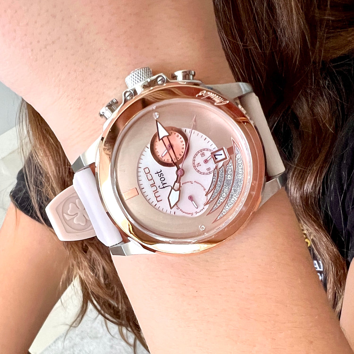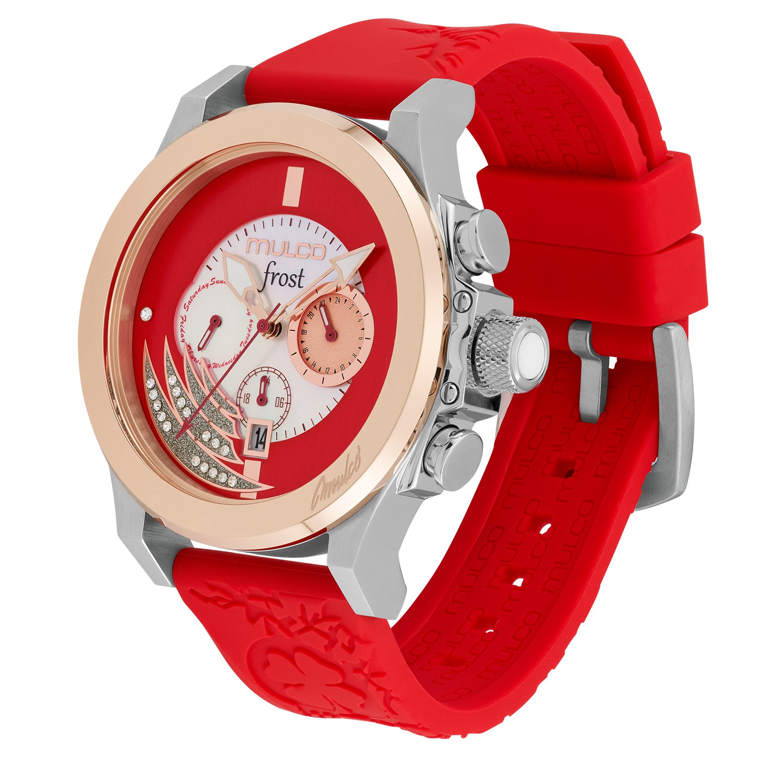 Reloj Mulco Frost Full Moon para mujer, con movimiento cronógrafo suizo, piedras de nácar y Swarovski, detalles en oro rosa y diseño de banda de silicona.