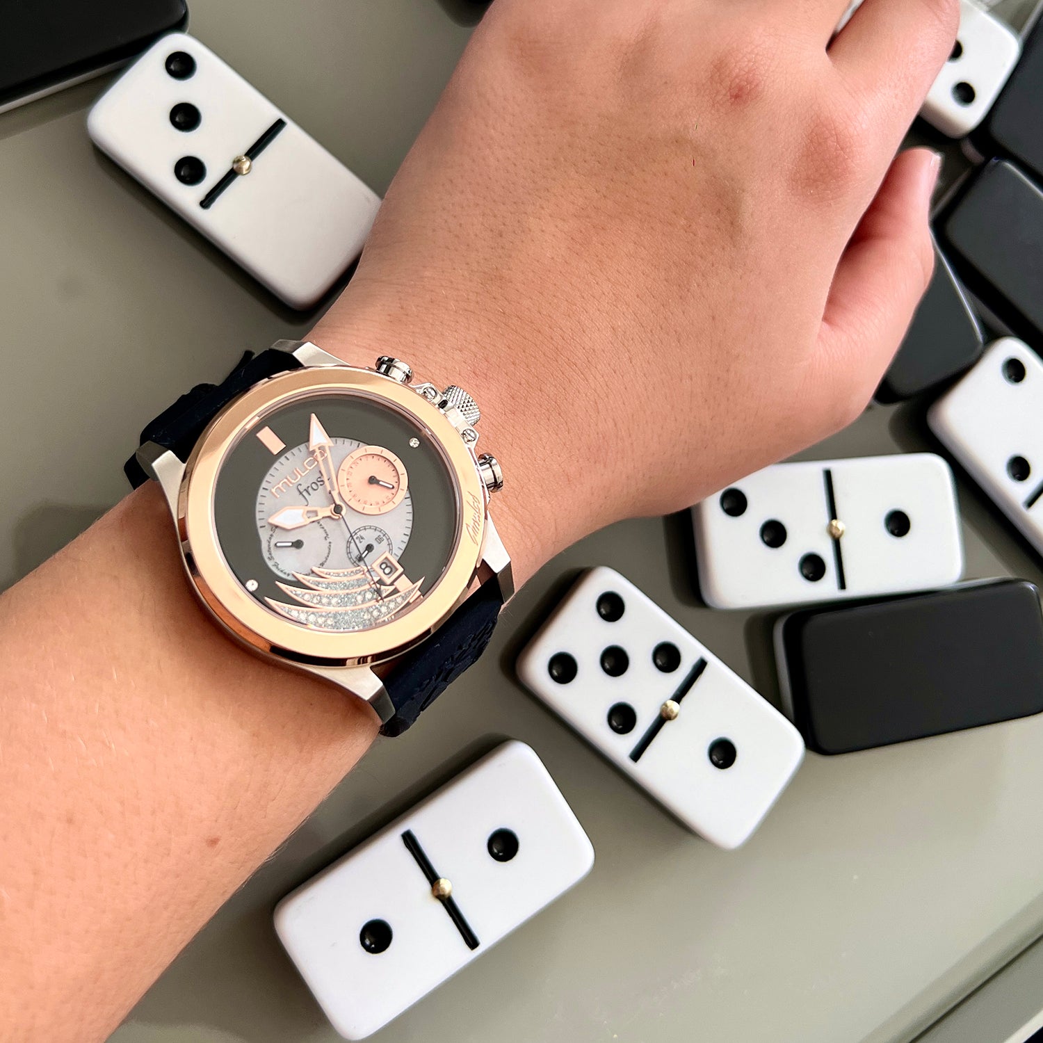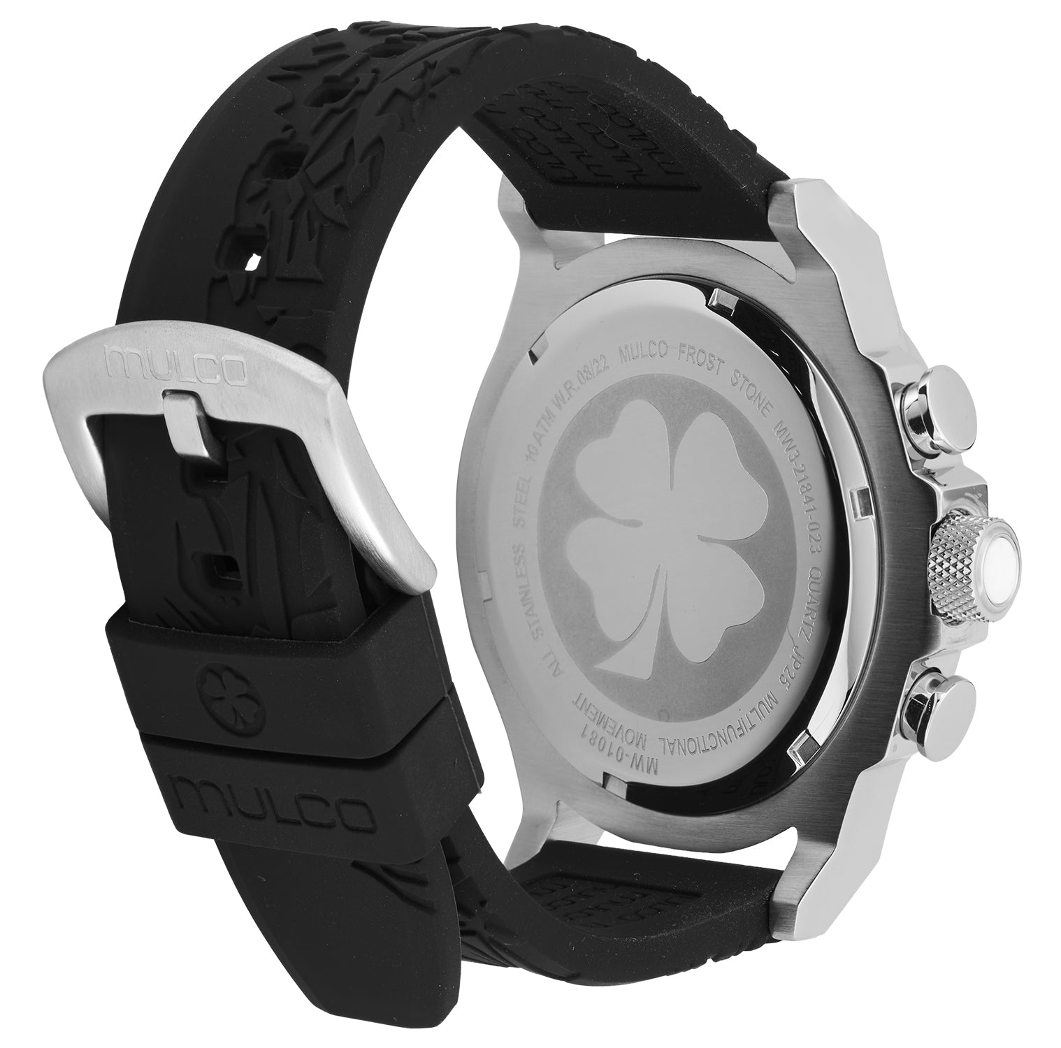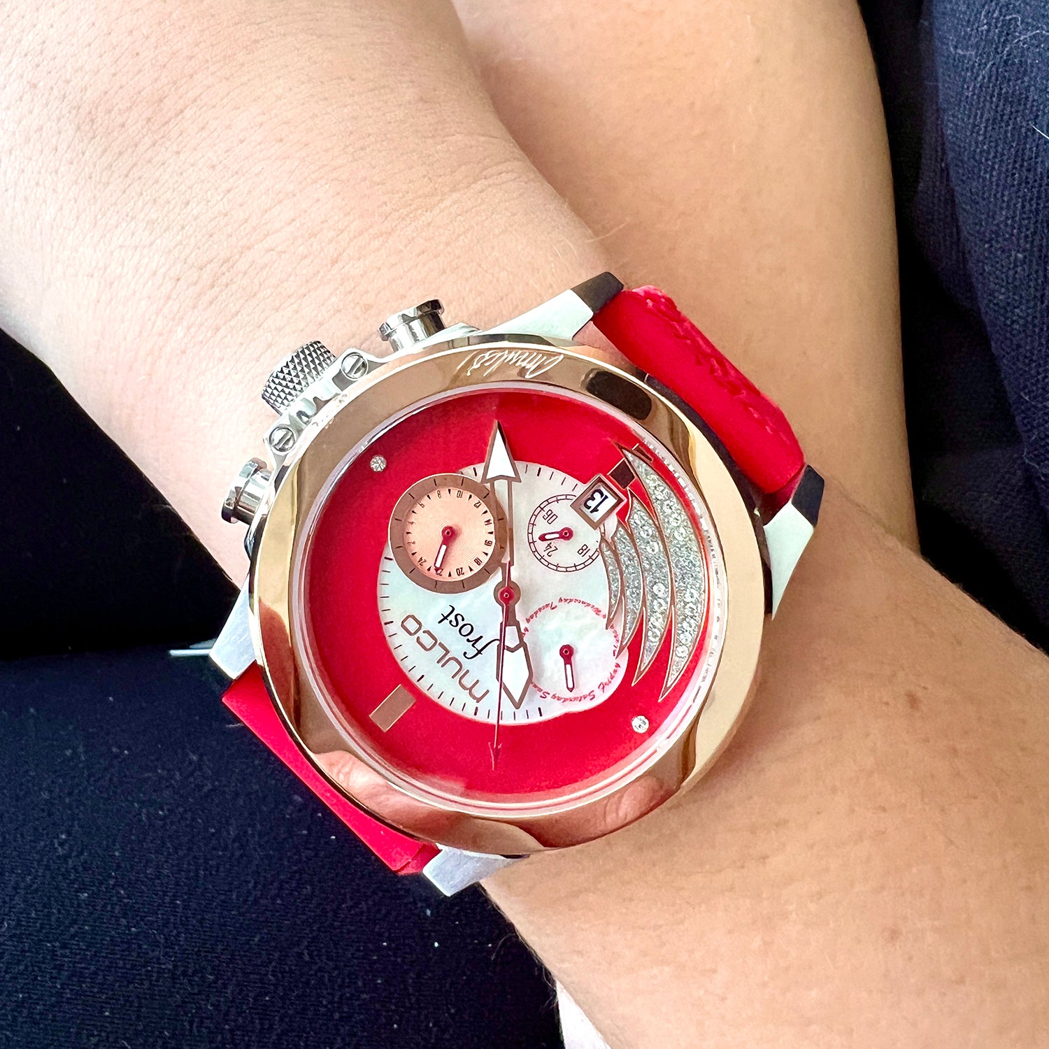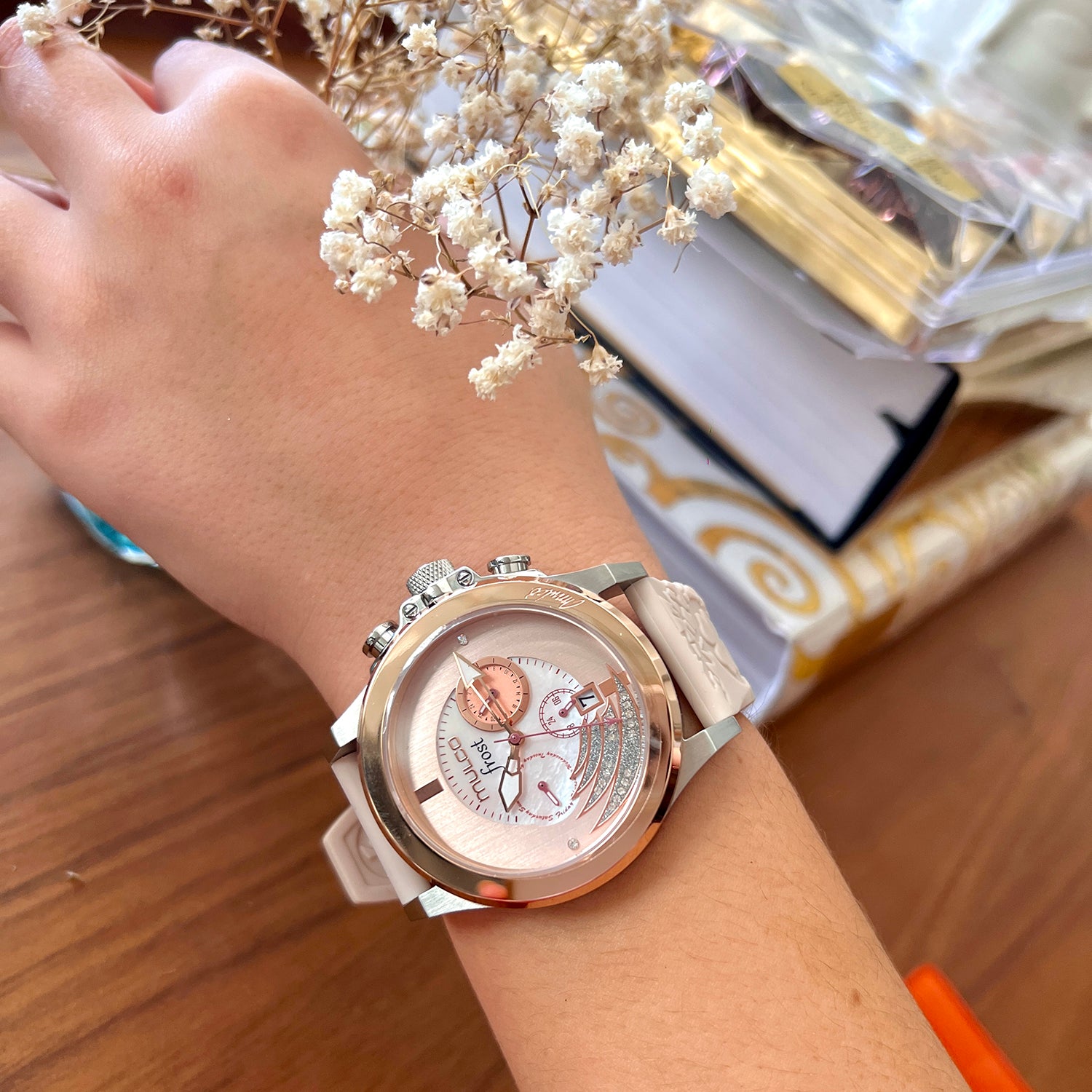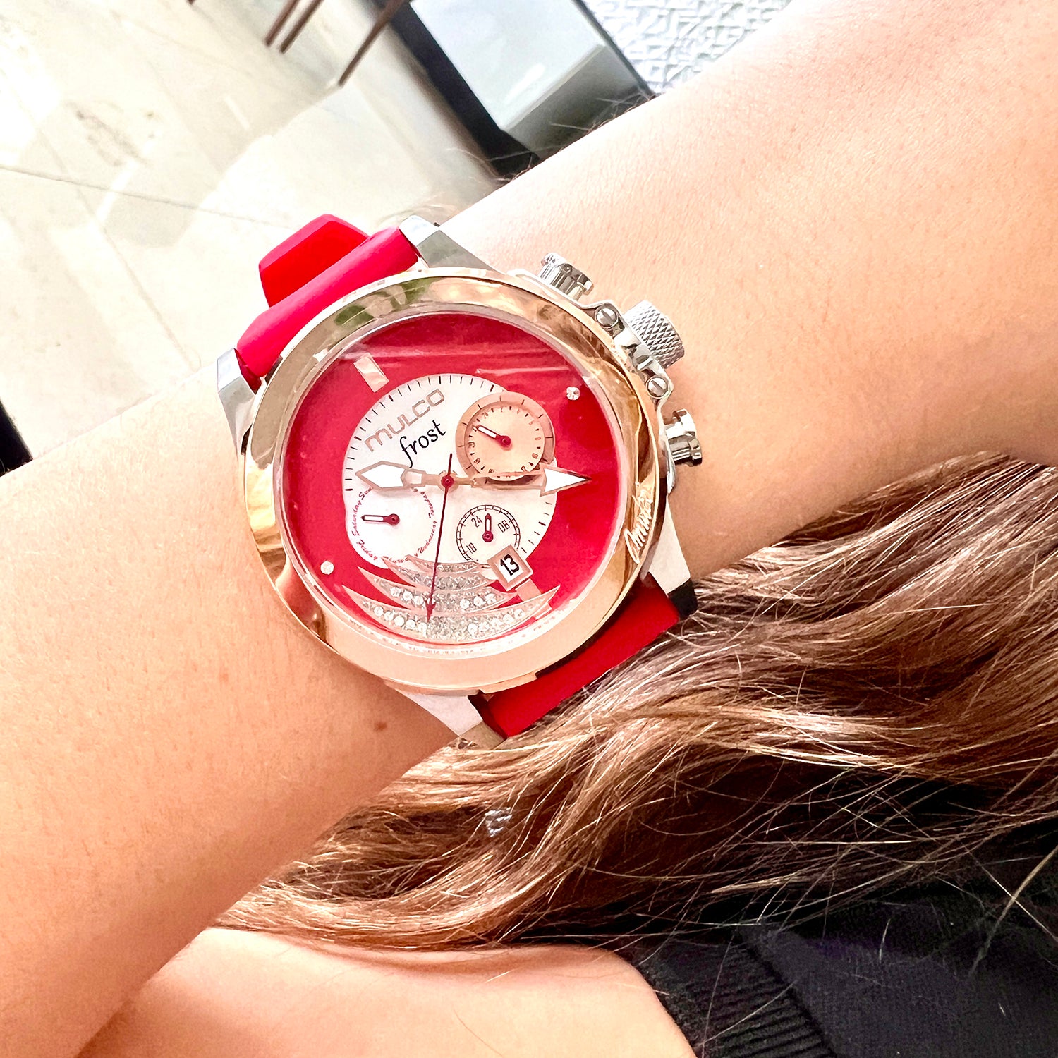 Reloj Mulco Frost Full Moon para mujer, con movimiento cronógrafo suizo, piedras de nácar y Swarovski, detalles en oro rosa y diseño de banda de silicona.