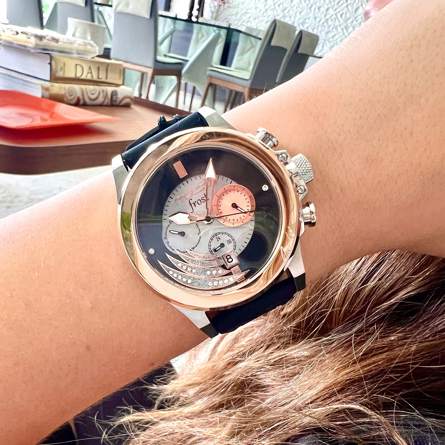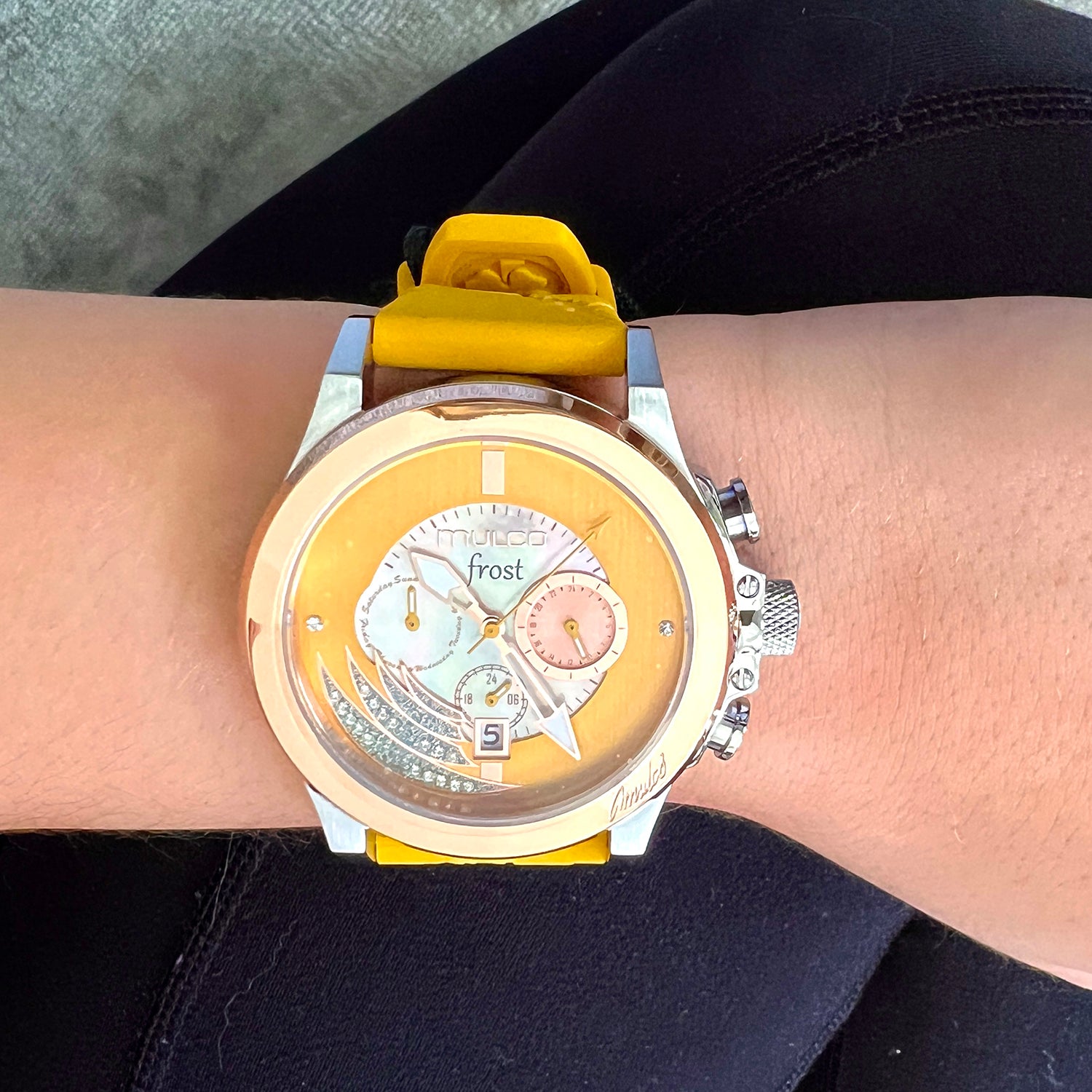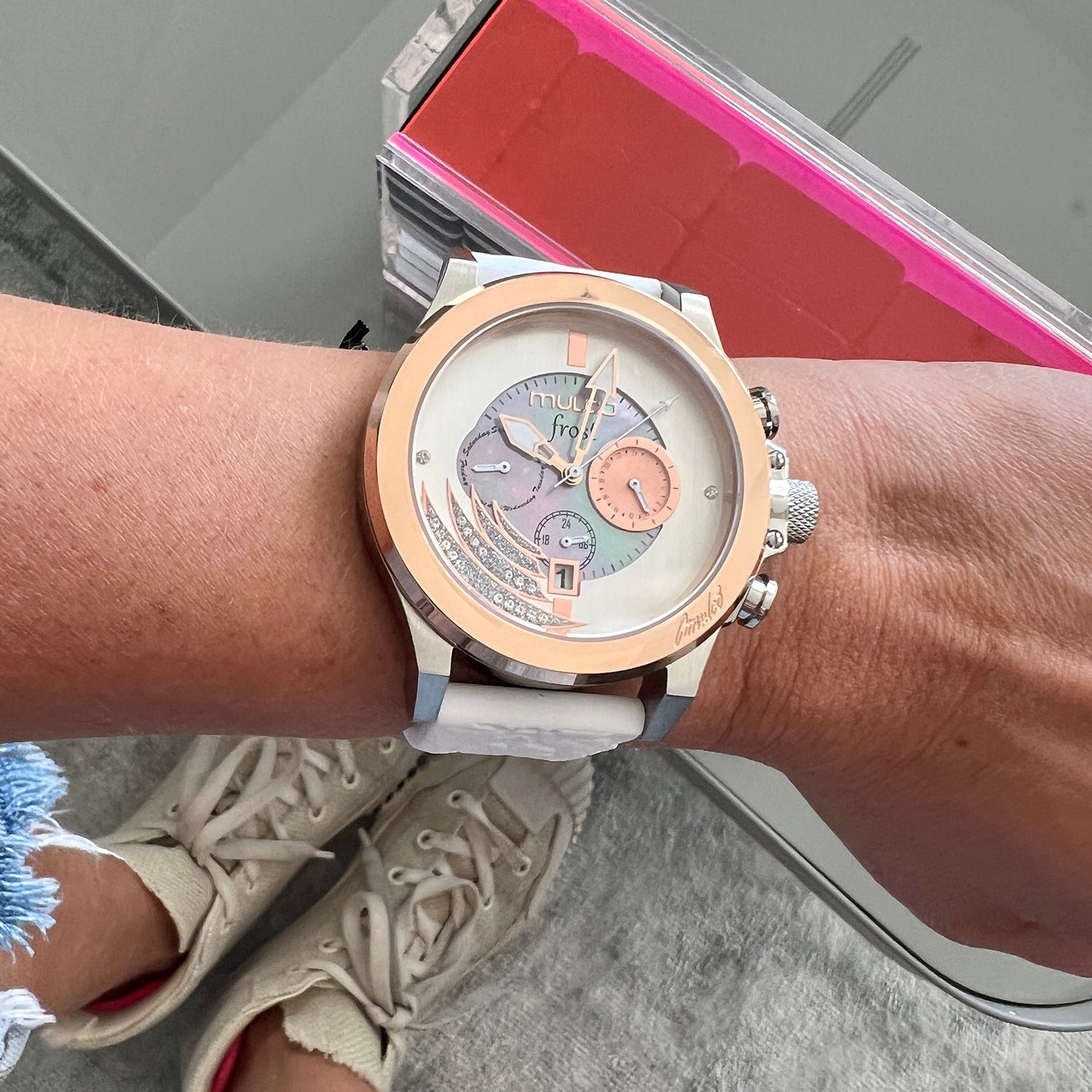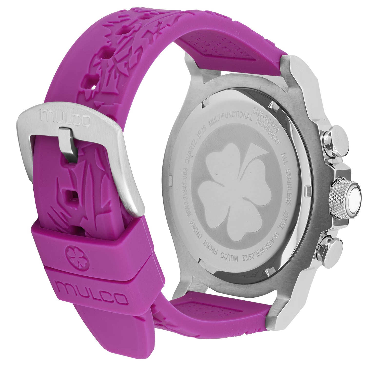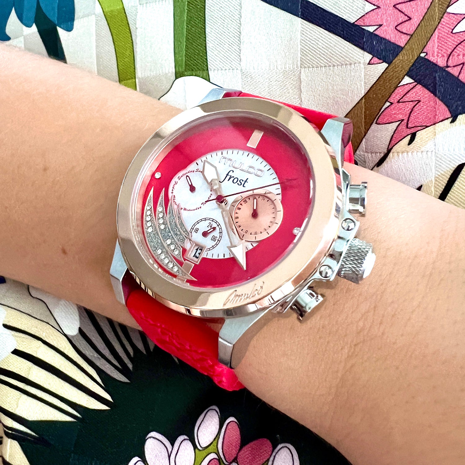 Reloj Mulco Frost Full Moon para mujer, con movimiento cronógrafo suizo, piedras de nácar y Swarovski, detalles en oro rosa y diseño de banda de silicona.