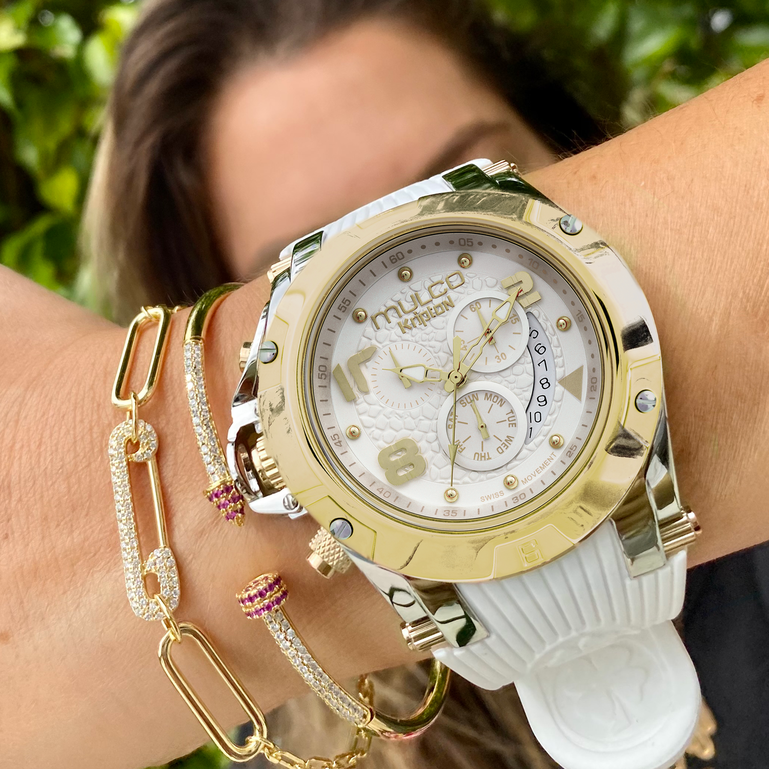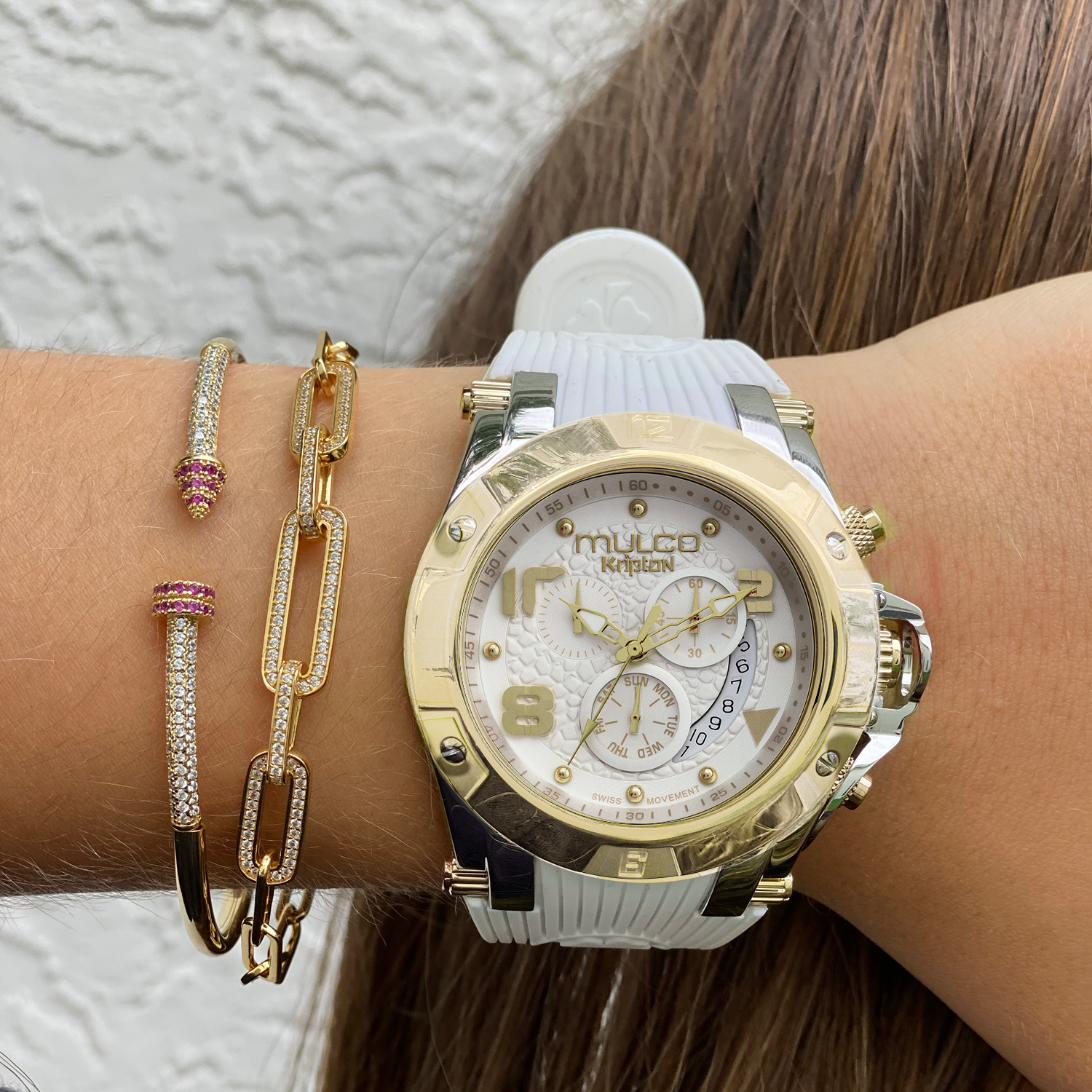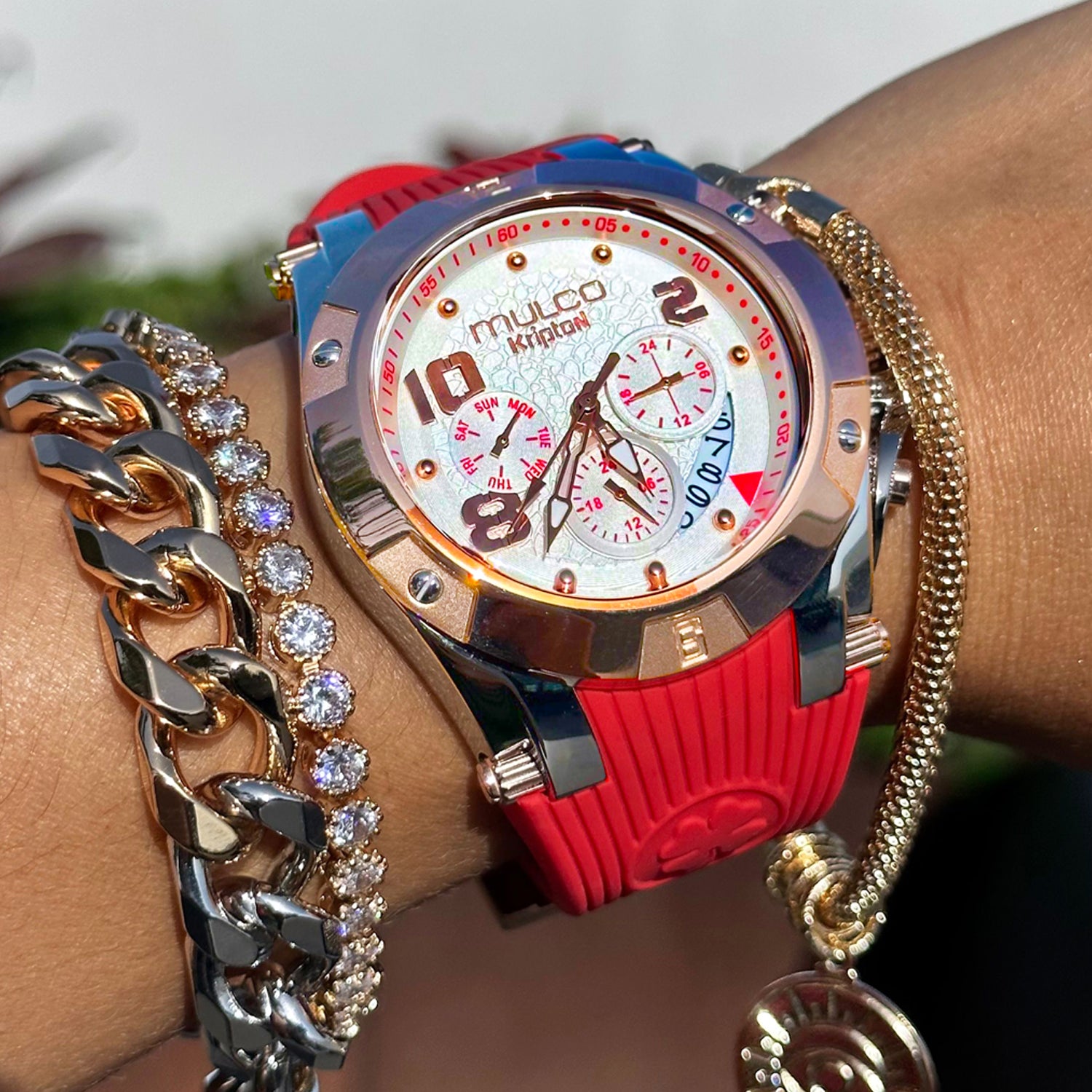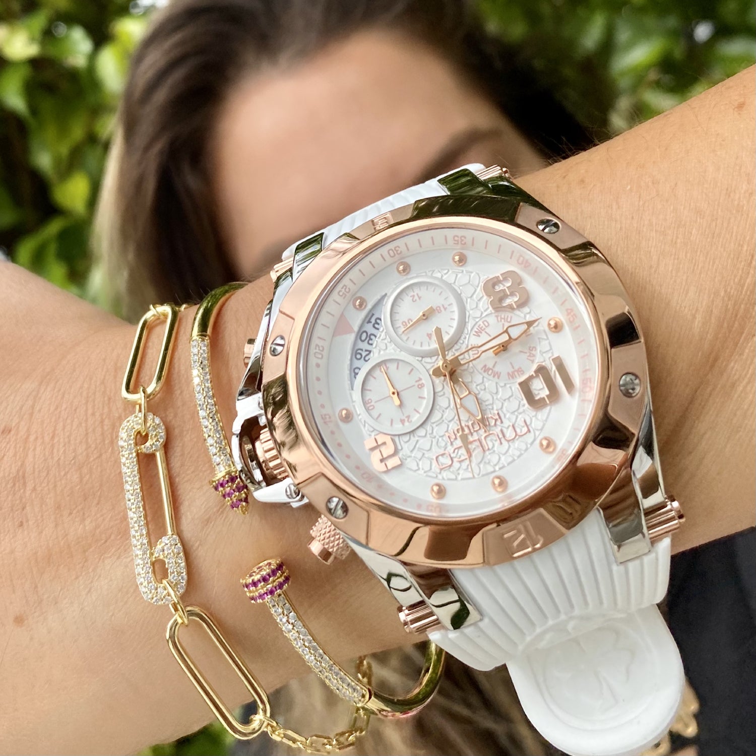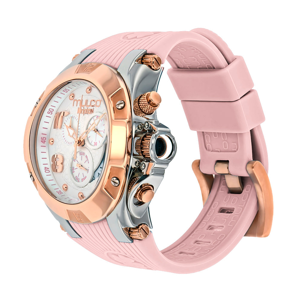 Su esfera con acabado perlado y detalles en oro rosa resiste el uso diario gracias a un proceso de ionizado. Además, es resistente al agua y está fabricado en acero inoxidable. La correa de silicona te brinda comodidad y estilo para que puedas lucirla a diario.