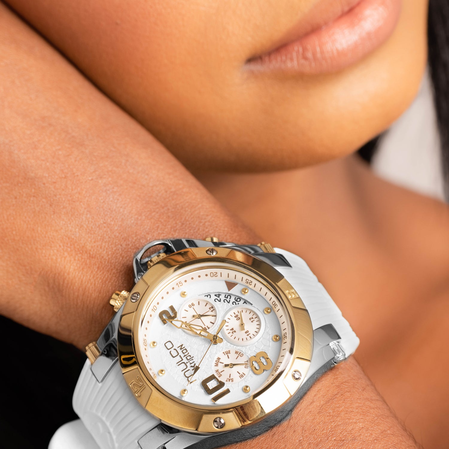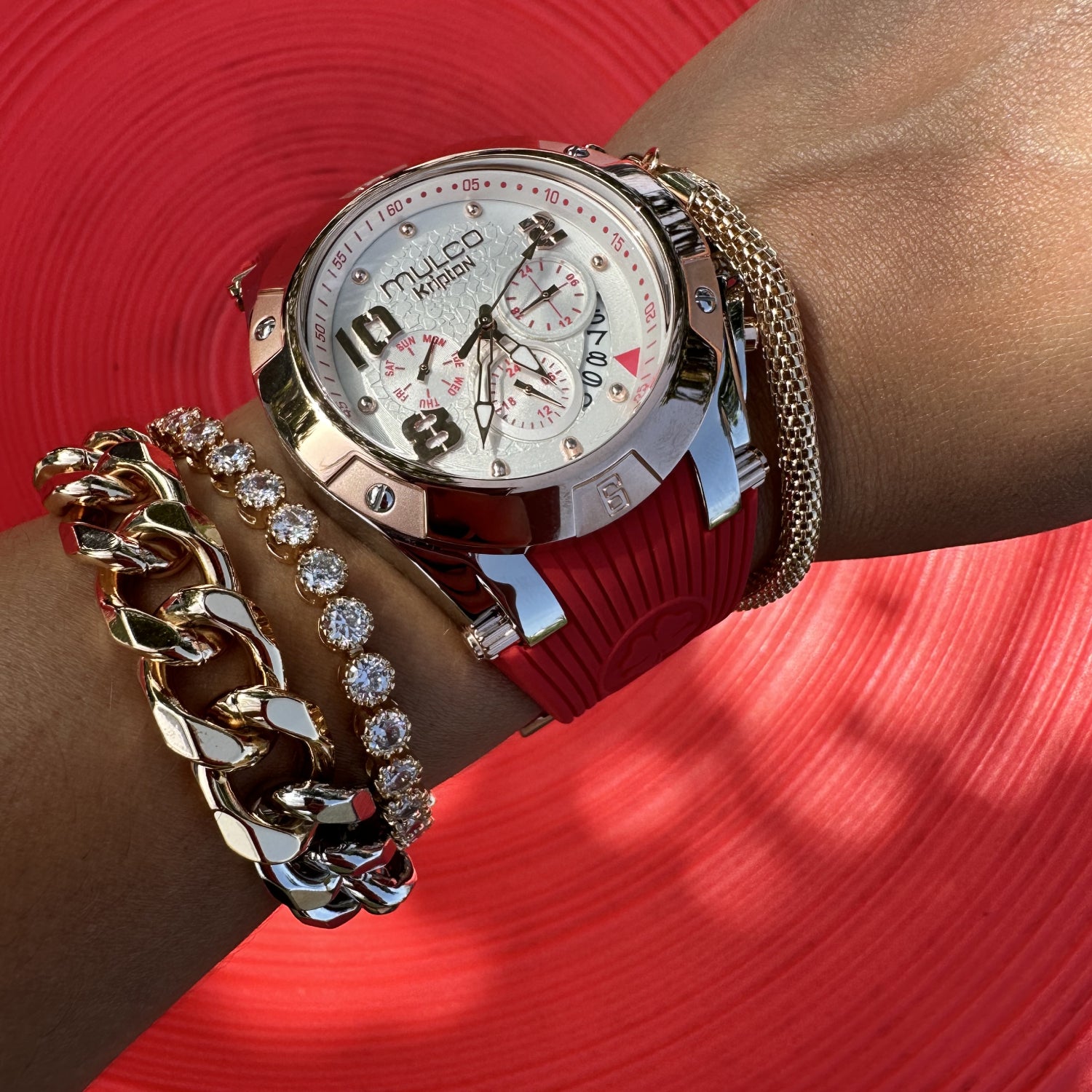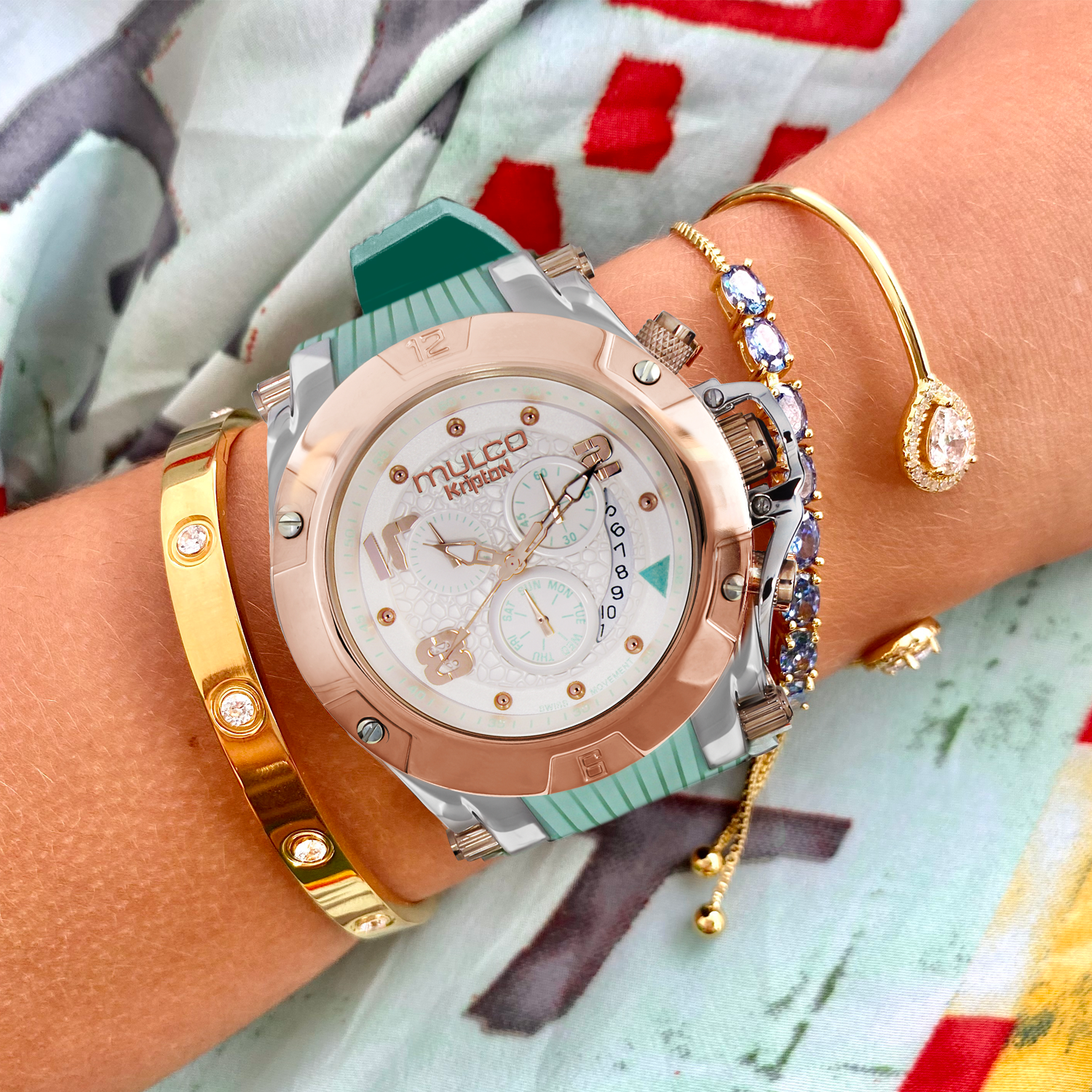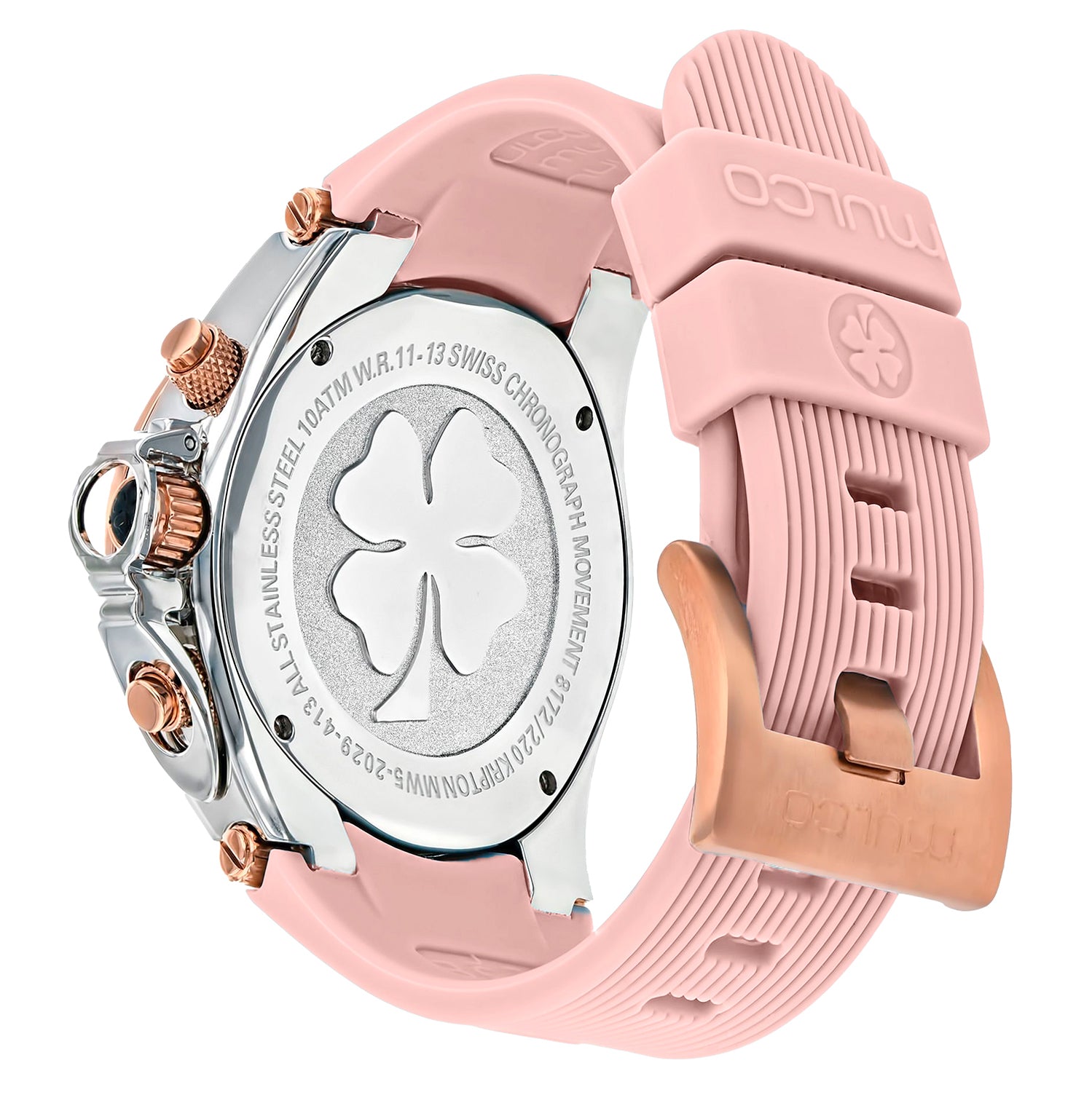 Su esfera con acabado perlado y detalles en oro rosa resiste el uso diario gracias a un proceso de ionizado. Además, es resistente al agua y está fabricado en acero inoxidable. La correa de silicona te brinda comodidad y estilo para que puedas lucirla a diario.
