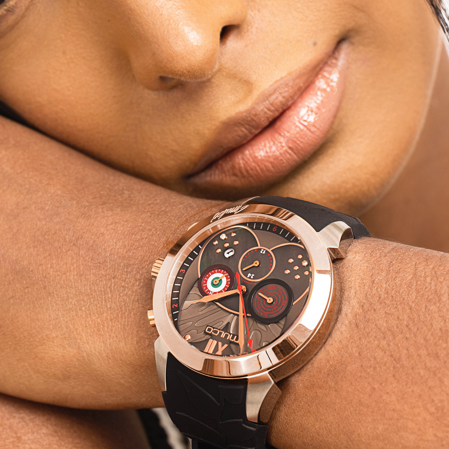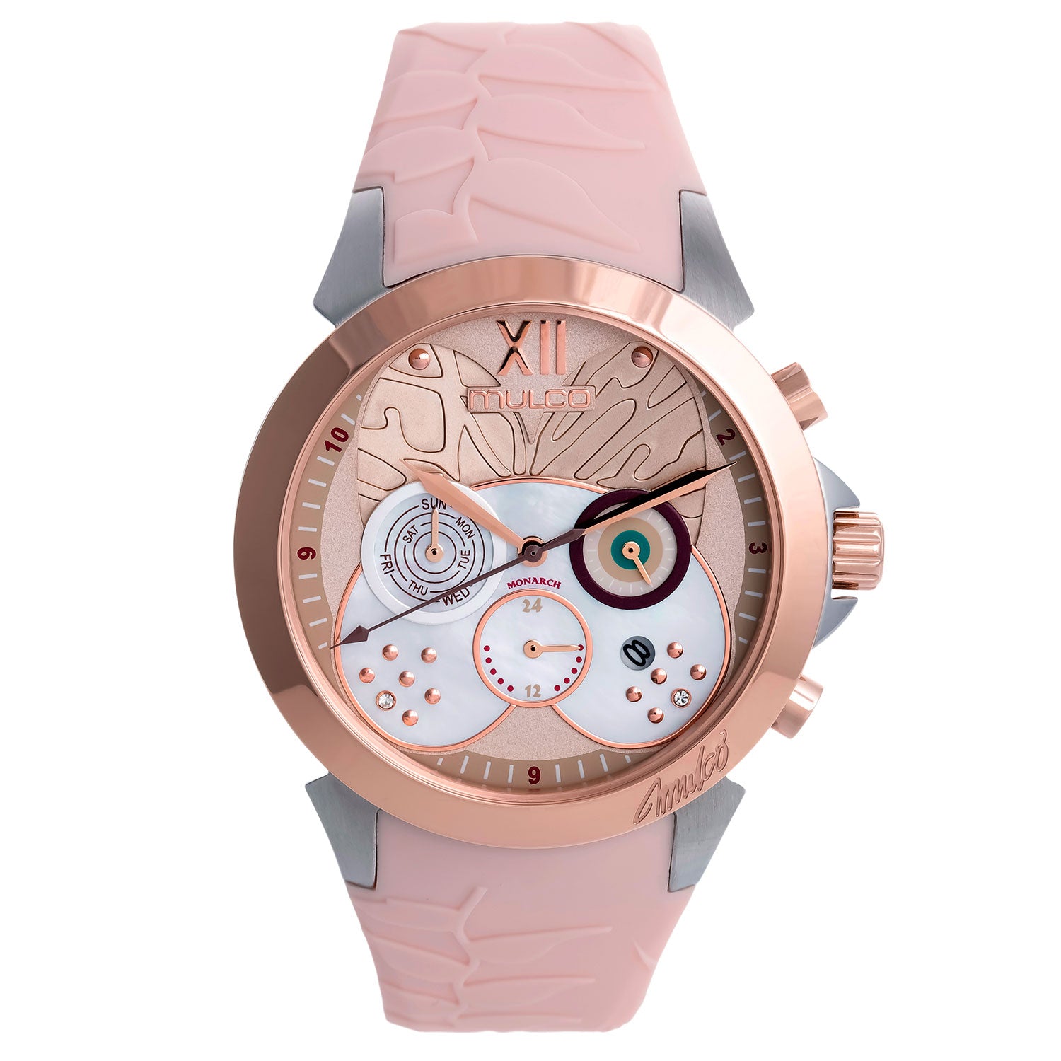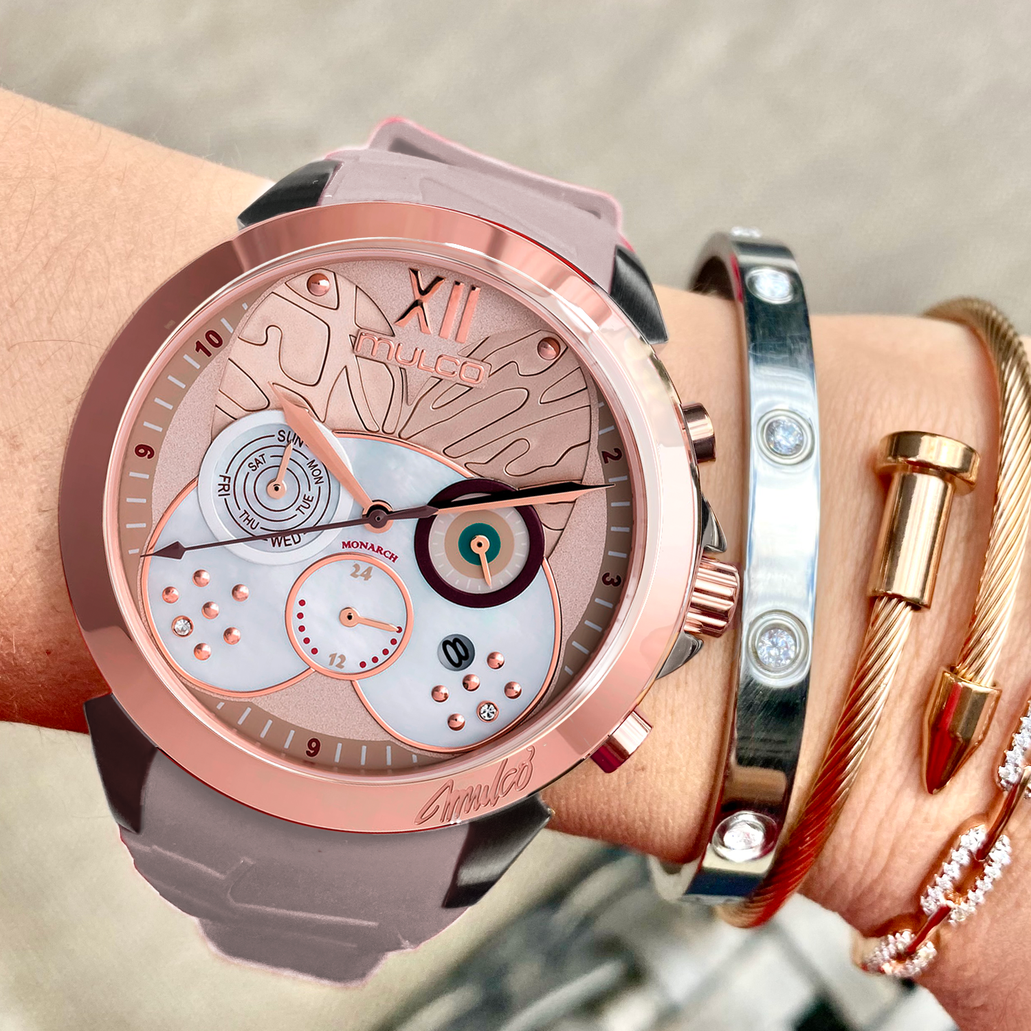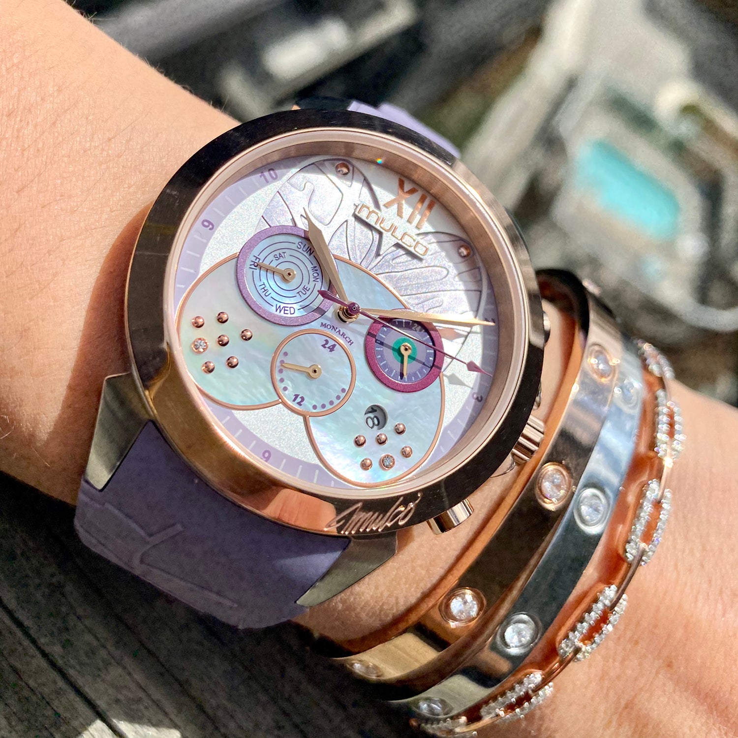 ¡Impresiona con Mulco Lush Monarch!, un reloj multifuncional con un diseño sólido y un dial inspirado en mariposas imperiales. Resistente al agua hasta 100 metros.
