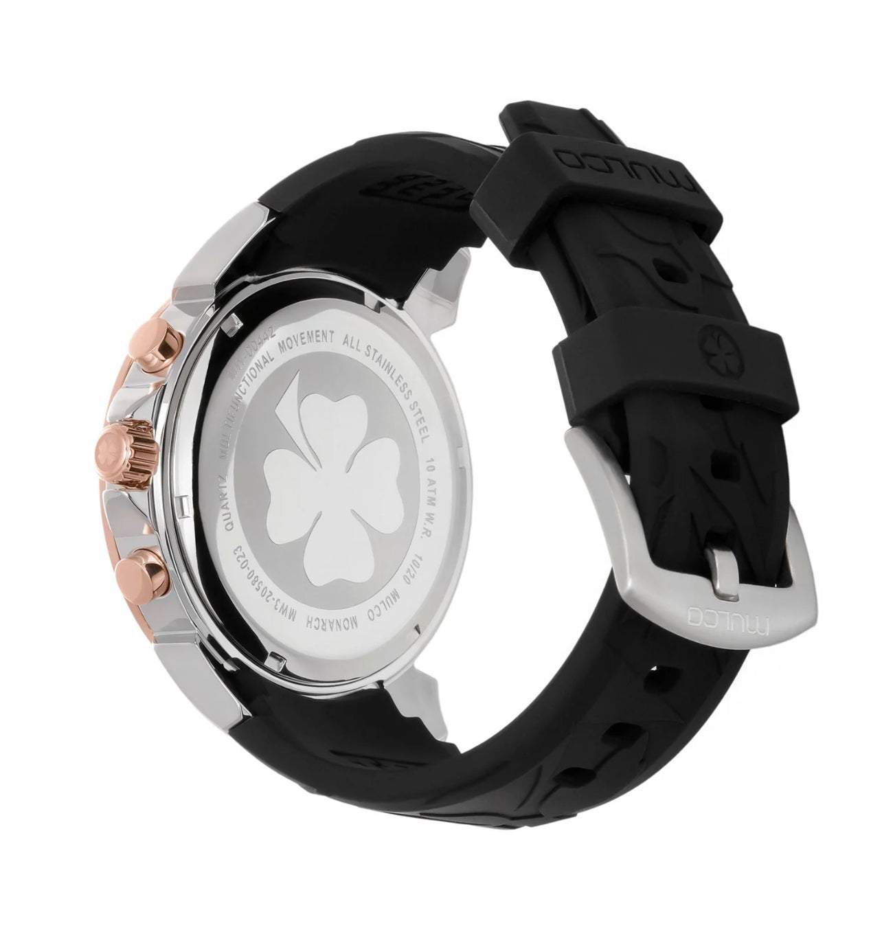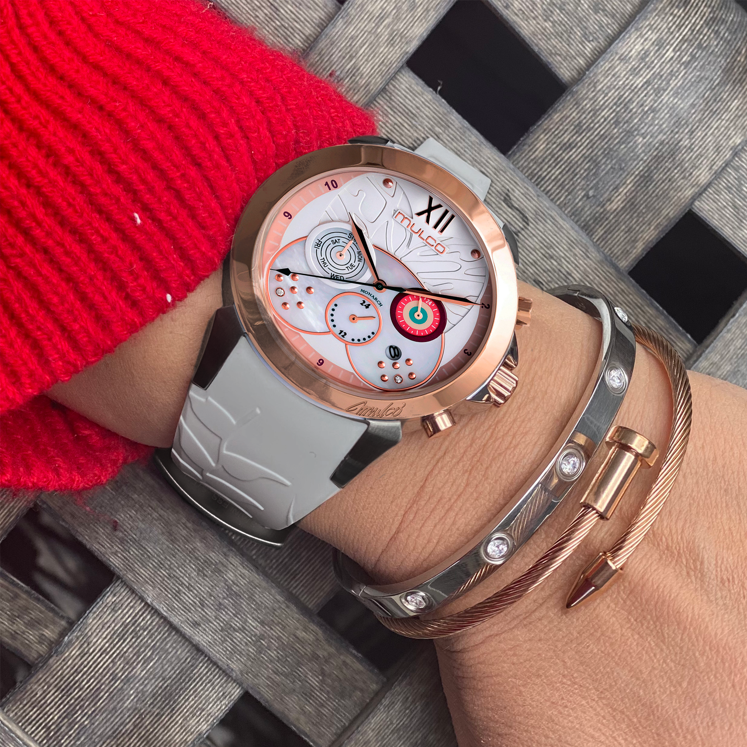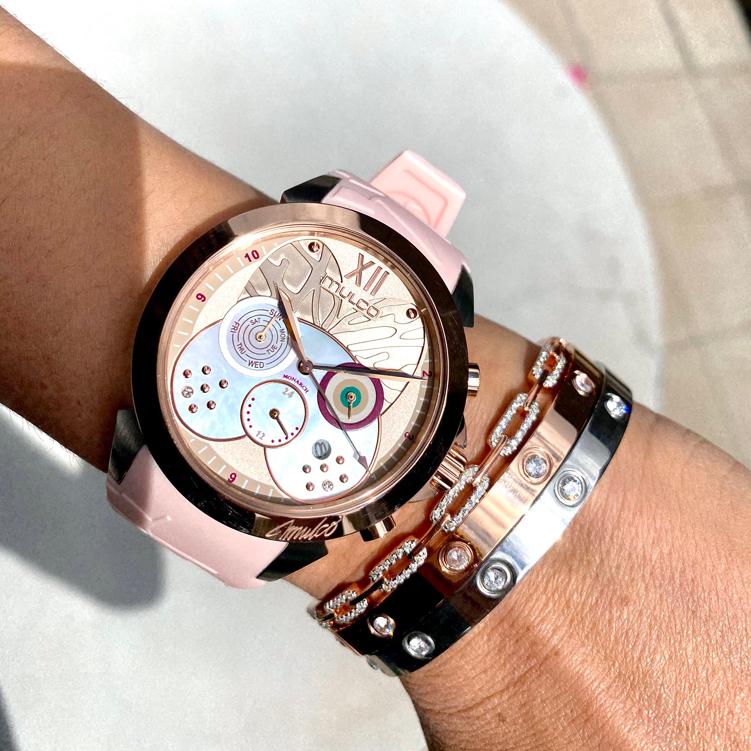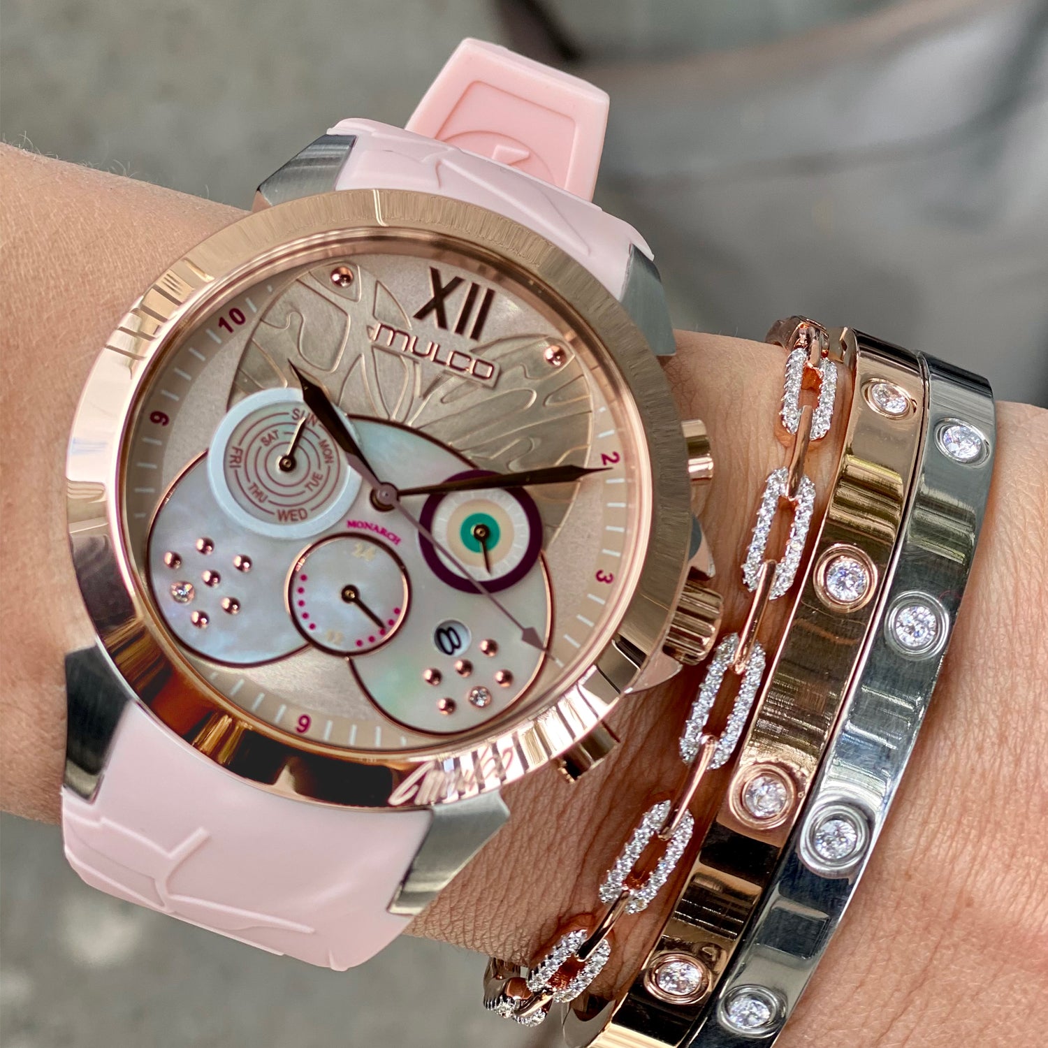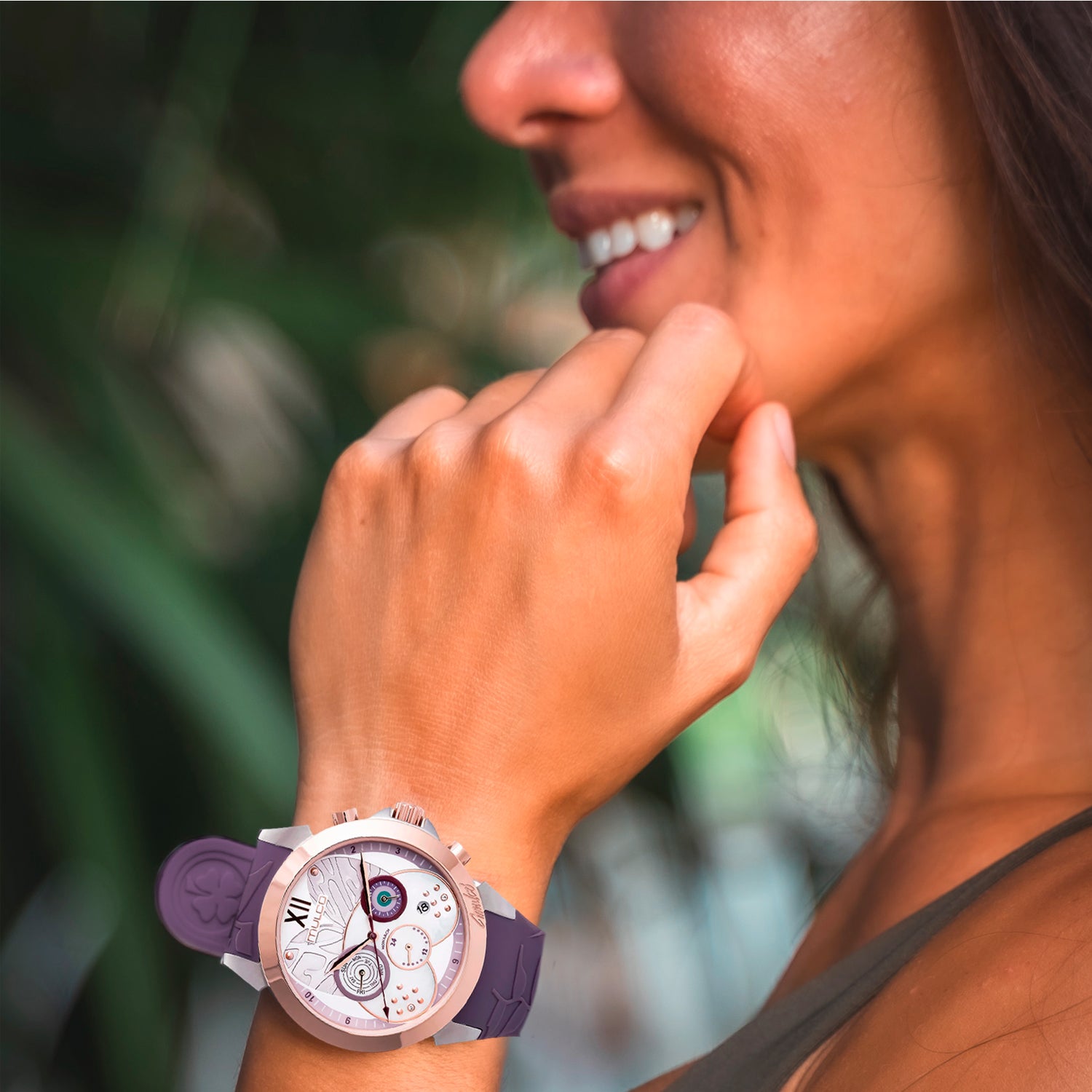 ¡Impresiona con Mulco Lush Monarch!, un reloj multifuncional con un diseño sólido y un dial inspirado en mariposas imperiales. Resistente al agua hasta 100 metros.