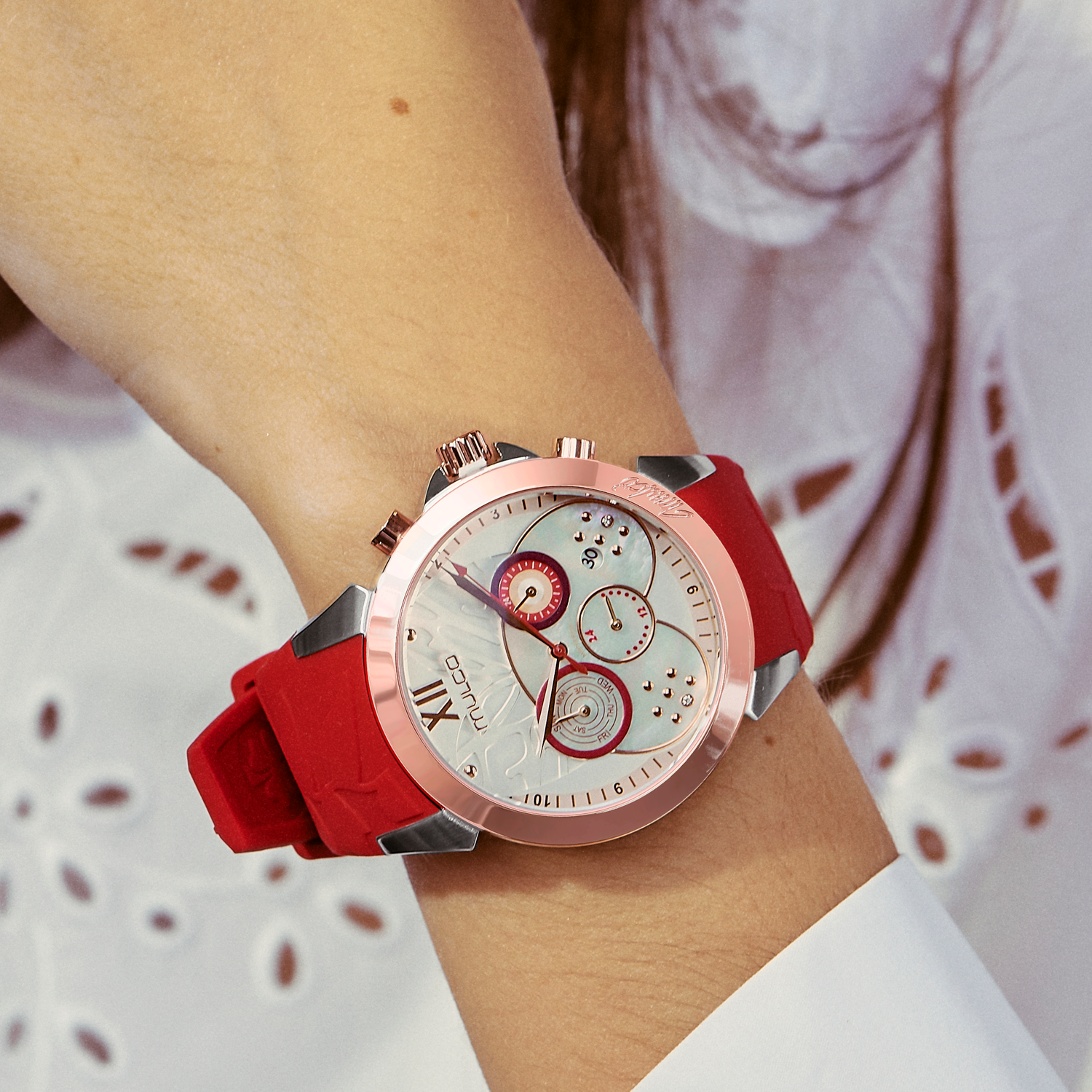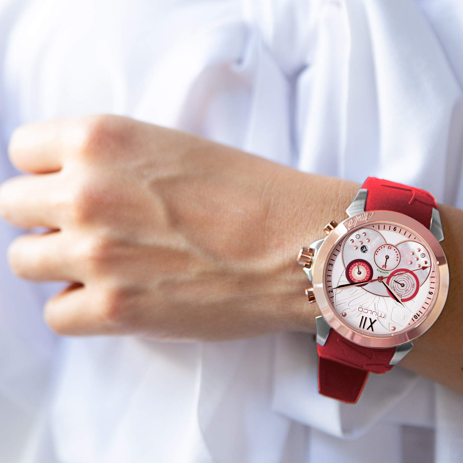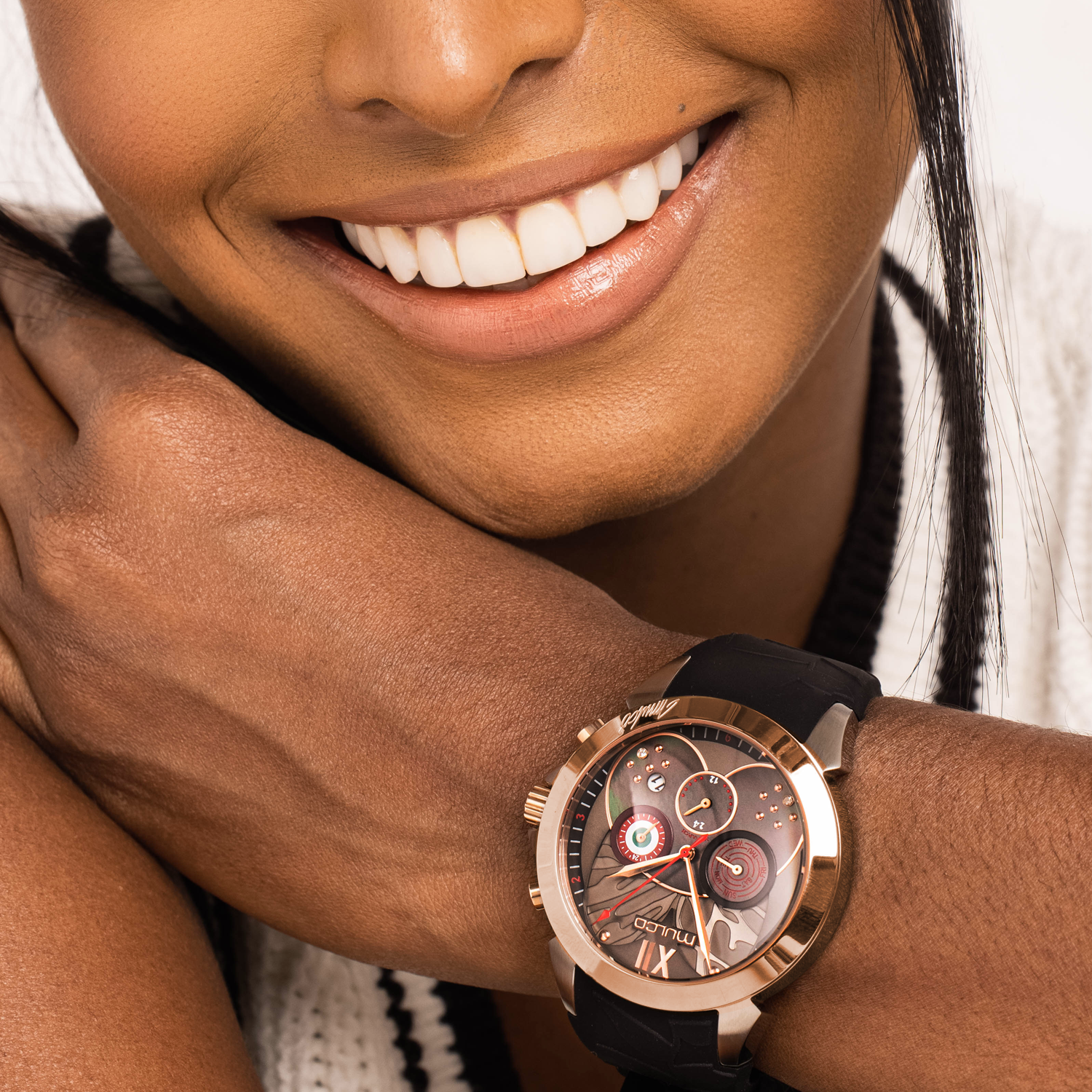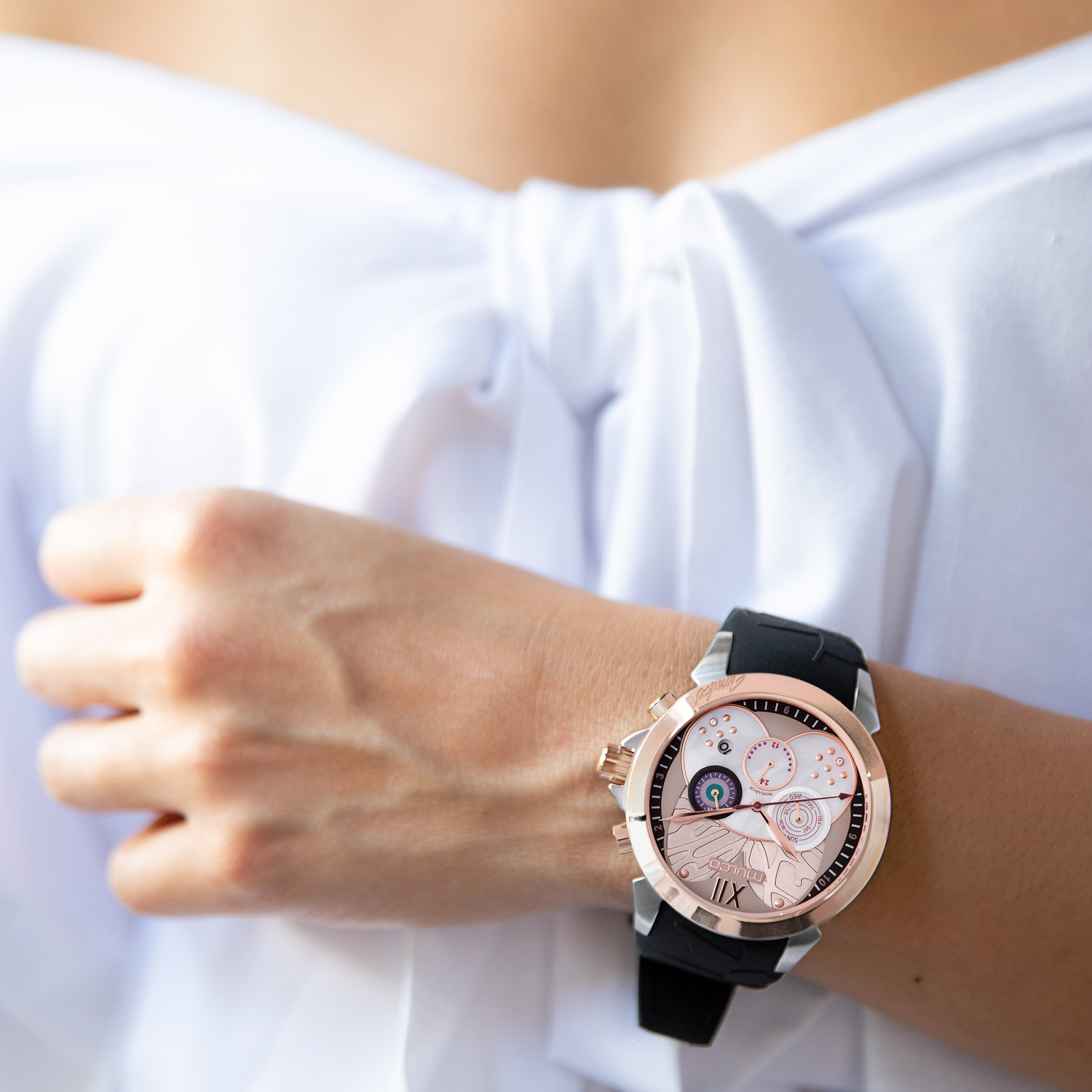 ¡Impresiona con Mulco Lush Monarch!, un reloj multifuncional con un diseño sólido y un dial inspirado en mariposas imperiales. Resistente al agua hasta 100 metros.