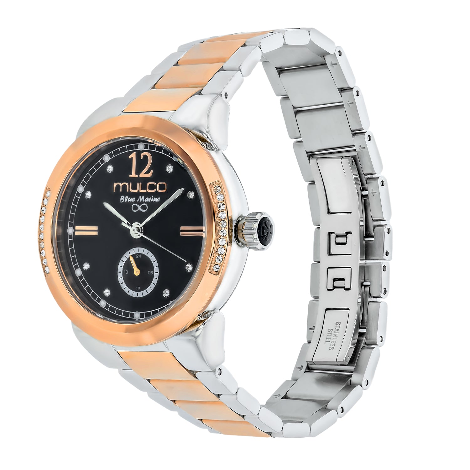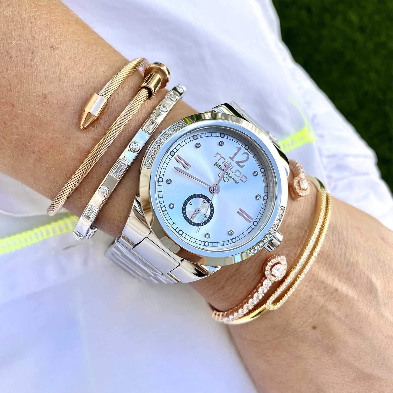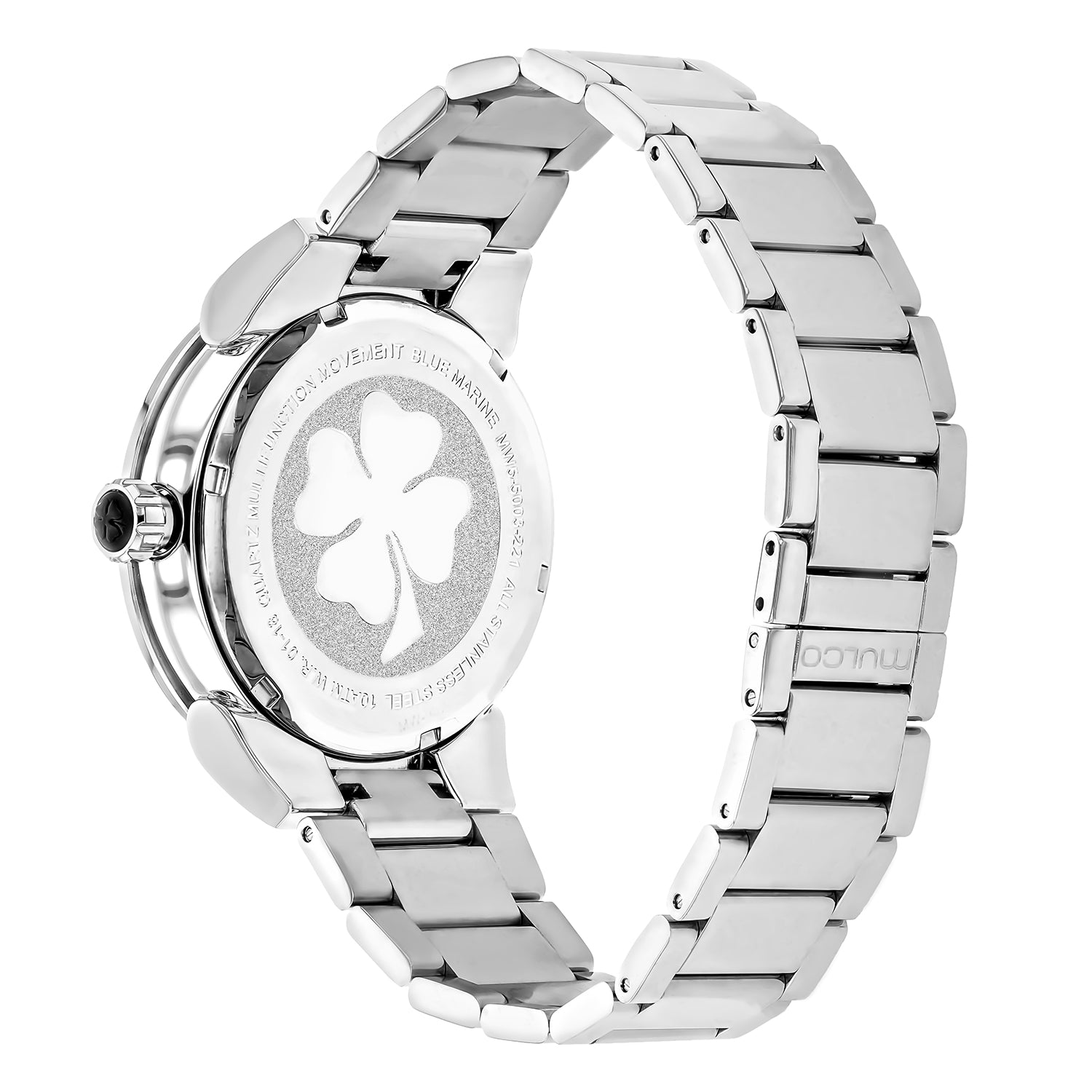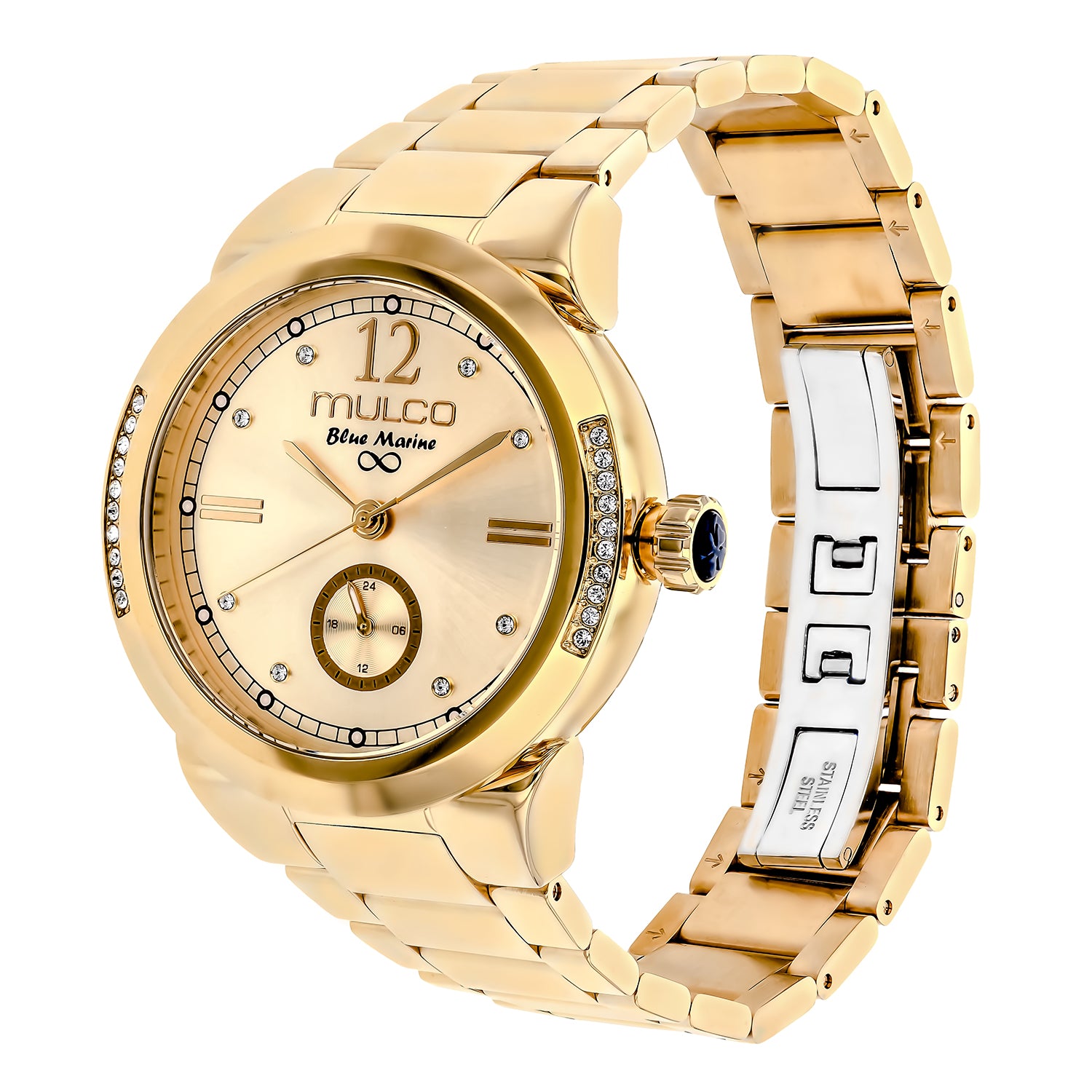 Presentamos el reloj de cuarzo para mujer, adornado con piedras Swarovski y con resistencia al agua. Su diseño atemporal hace una audaz declaración de moda para el uso diario