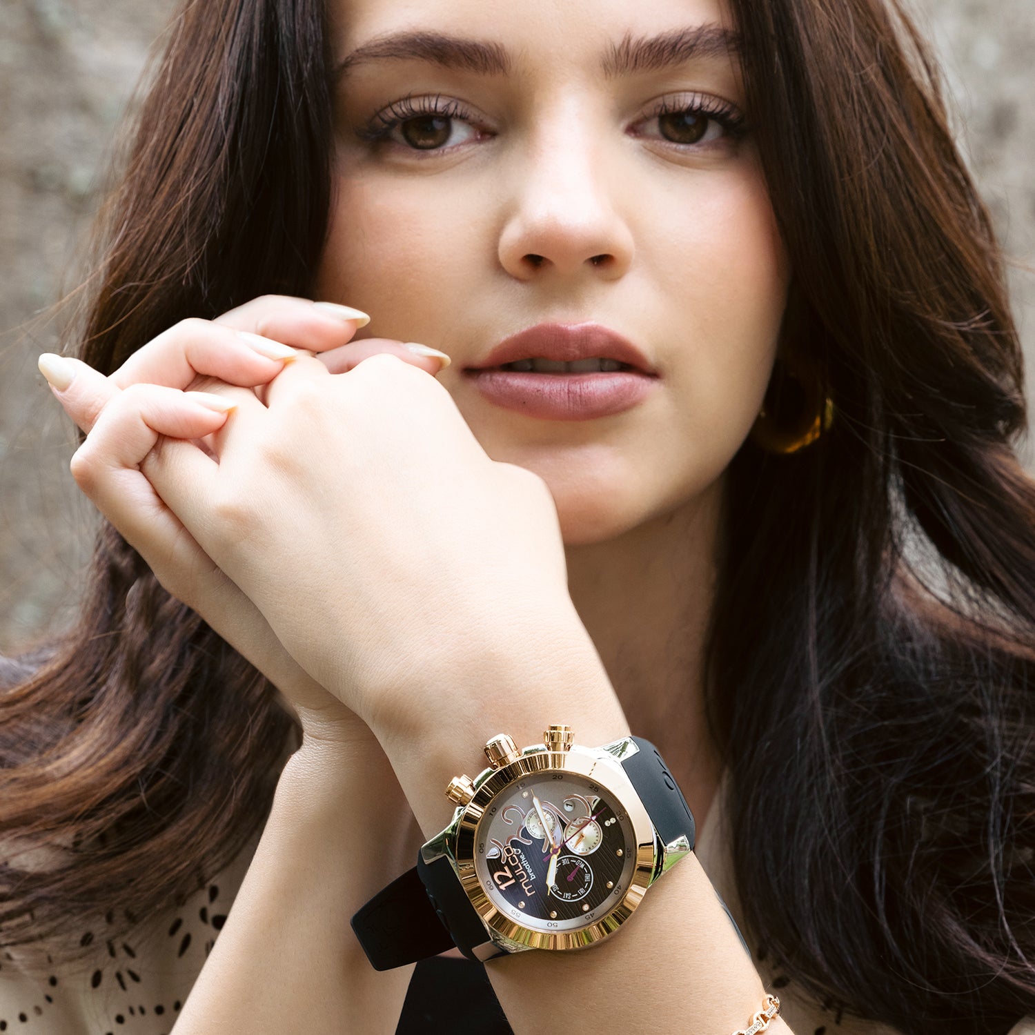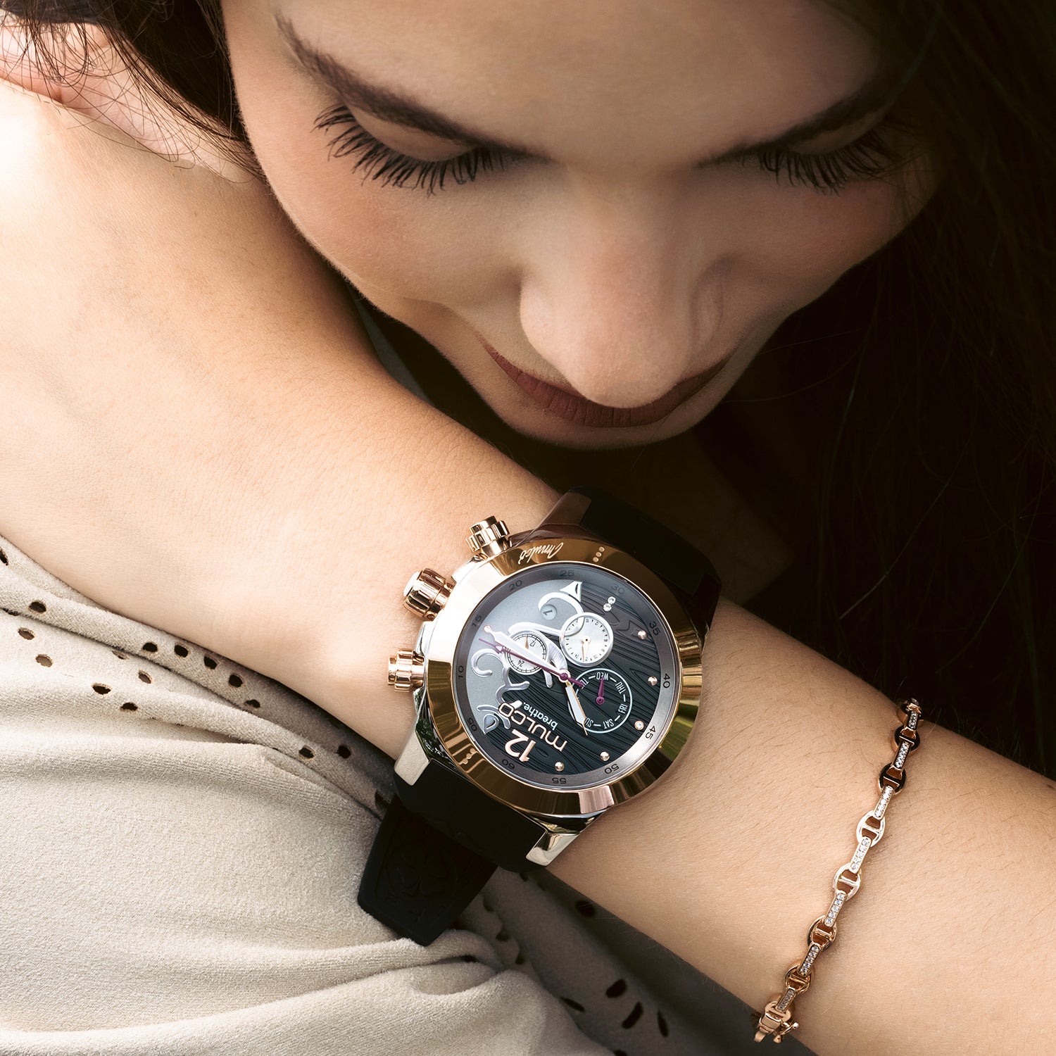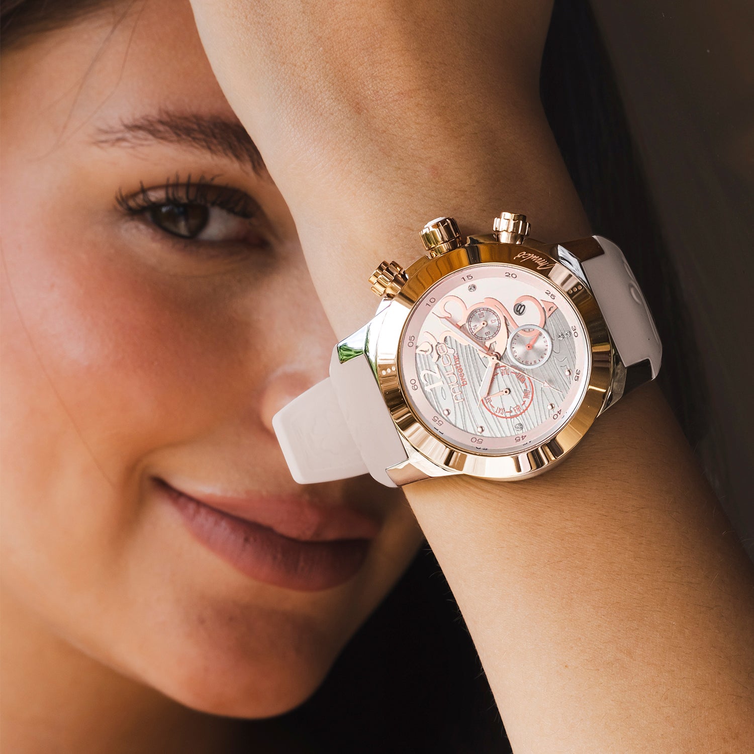 - Pantalla: Fondo en relieve con detalles en oro rosa y acero.